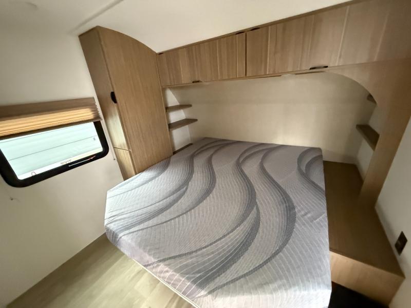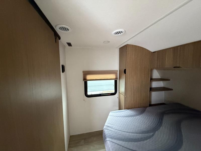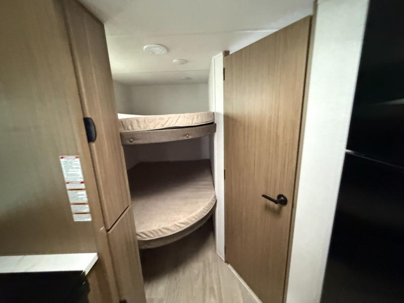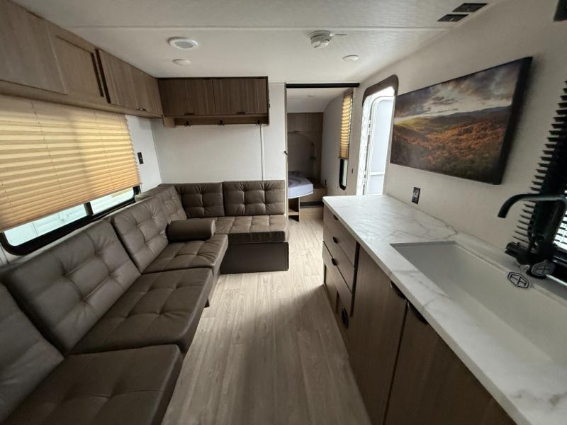 Camping is made easy in this travel trailer with more sleeping space and lots of comforts! The kids or your guests will enjoy the double-size bunks in the back, along with the full bath close by for easy nighttime use. You'll have the front private bedroom with a king bed all to yourselves, and there are dual bedroom wardrobes to keep your space neat and clean. Everyone can meet in the combined kitchen and living room to relax on the super U-lounge with a removable table while the chef of your group makes breakfast on the two burner cooktop. There is also a microwave oven for quick meals, plus a pantry and large under counter refrigerator for food storage!
