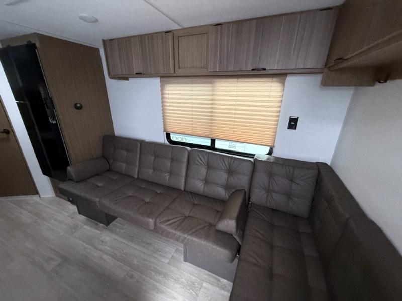 Camping is made easy in this travel trailer with more sleeping space and lots of comforts! The kids or your guests will enjoy the double-size bunks in the back, along with the full bath close by for easy nighttime use. You'll have the front private bedroom with a king bed all to yourselves, and there are dual bedroom wardrobes to keep your space neat and clean. Everyone can meet in the combined kitchen and living room to relax on the super U-lounge with a removable table while the chef of your group makes breakfast on the two burner cooktop. There is also a microwave oven for quick meals, plus a pantry and large under counter refrigerator for food storage!