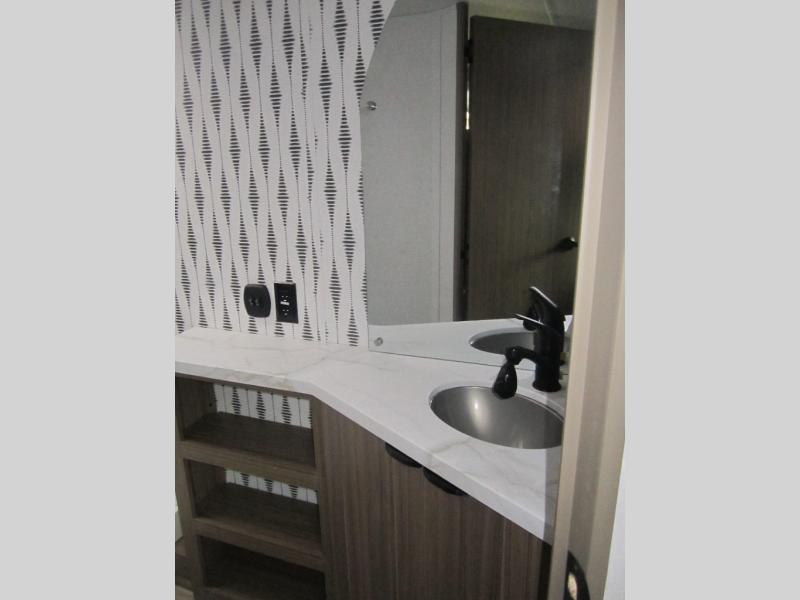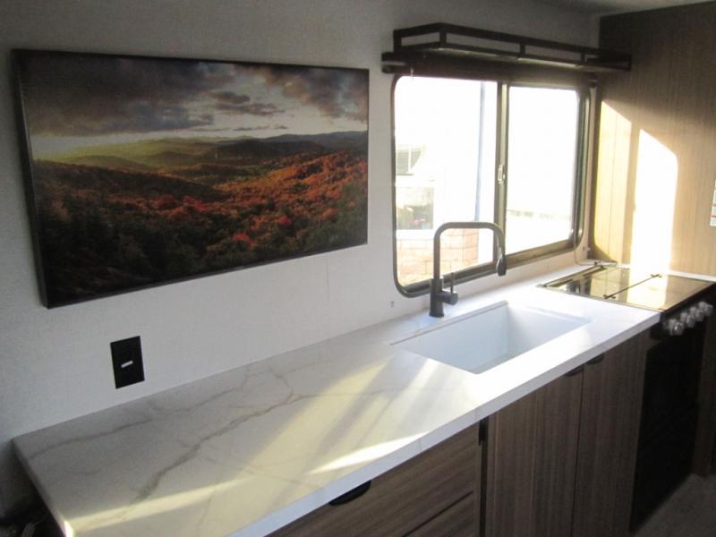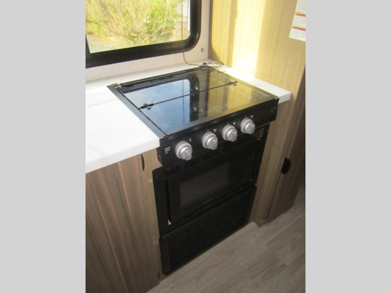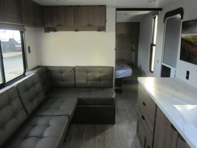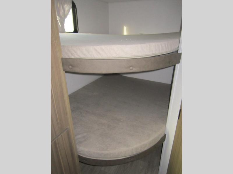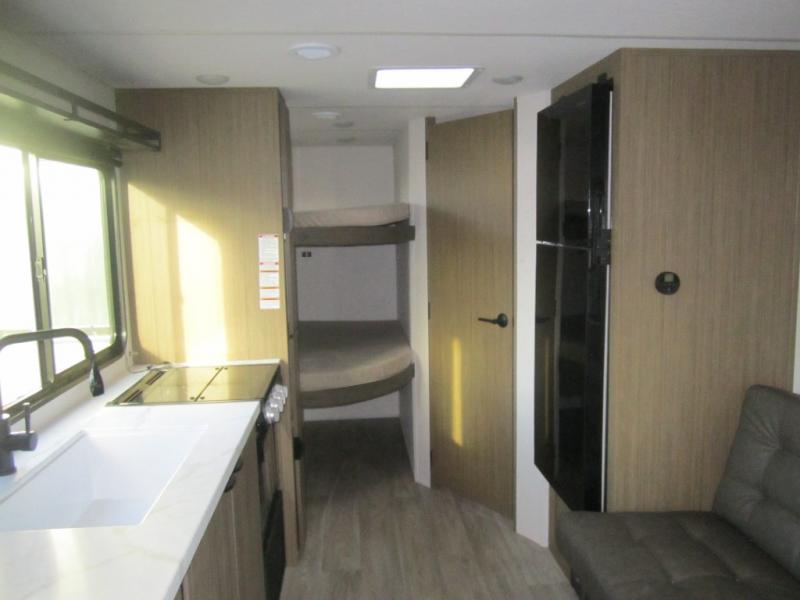 Camping is made easy in this travel trailer with more sleeping space and lots of comforts! The kids or your guests will enjoy the double-size bunks in the back, along with the full bath close by for easy nighttime use. You'll have the front private bedroom with a king bed all to yourselves, and there are dual bedroom wardrobes to keep your space neat and clean. Everyone can meet in the combined kitchen and living room to relax on the super U-lounge with a removable table while the chef of your group makes breakfast on the two-burner cooktop. There is also a microwave oven for quick meals, plus a pantry and large under counter refrigerator for food storage!
