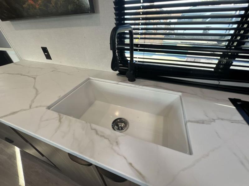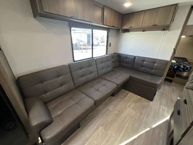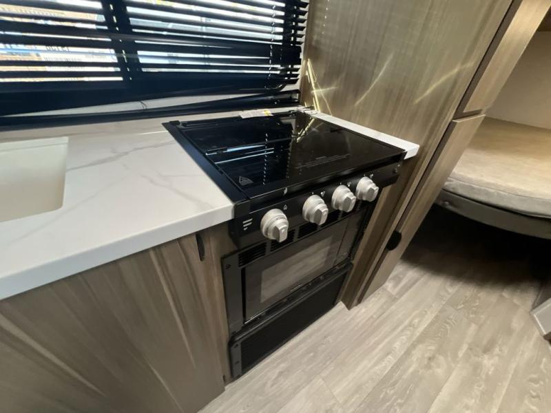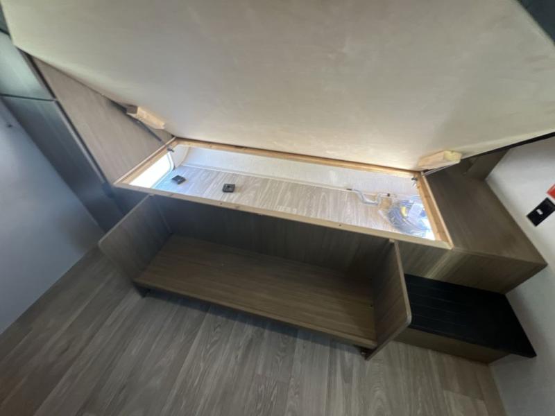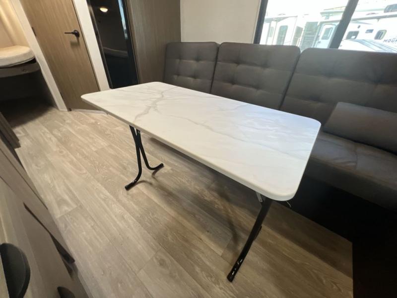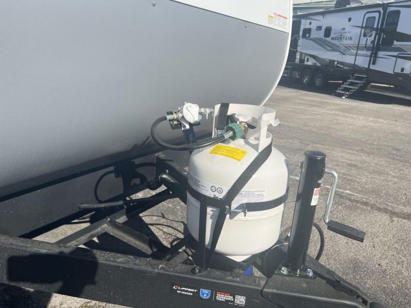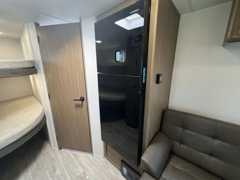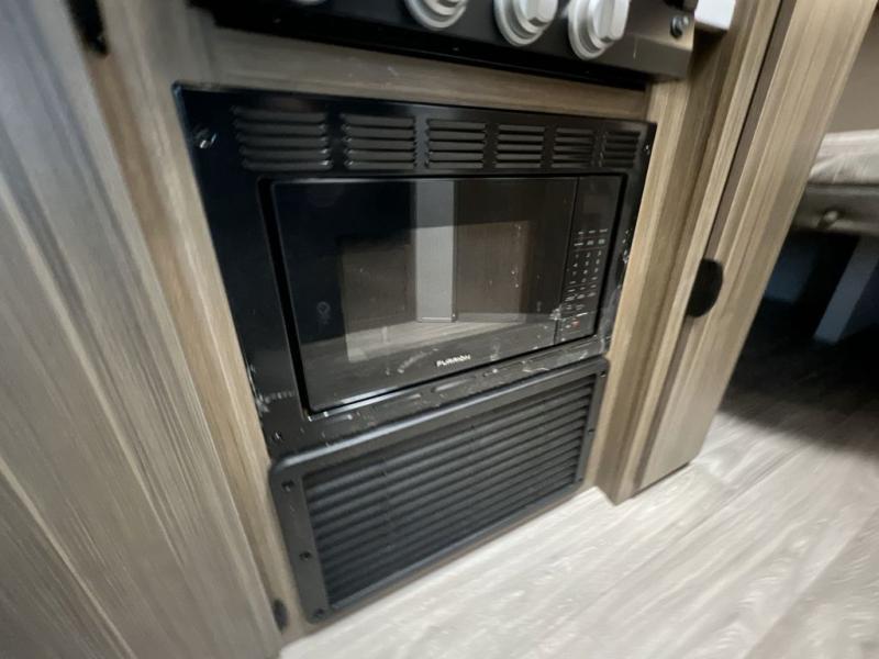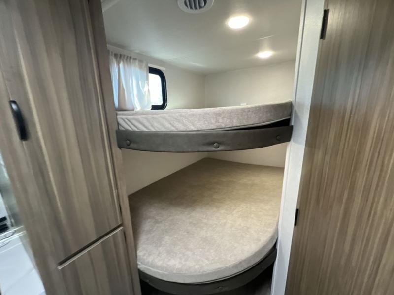 Camping is made easy in this travel trailer with more sleeping space and lots of comforts! The kids or your guests will enjoy the double-size bunks in the back, along with the full bath close by for easy nighttime use. You'll have the front private bedroom with a king bed all to yourselves, and there are dual bedroom wardrobes to keep your space neat and clean. Everyone can meet in the combined kitchen and living room to relax on the super U-lounge with a removable table while the chef of your group makes breakfast on the two-burner cooktop. There is also a microwave oven for quick meals, plus a pantry and large under counter refrigerator for food storage!