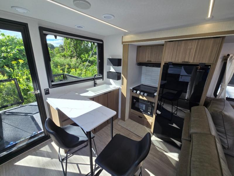 You'll love camping in this spacious trailer for three to four! There is a rear ramp door/patio so you can sit outdoors in your camp chairs, or you can sit under the side patio awning. The full kitchen includes a bar top with stools, a large sink, and a 12V refrigerator to store perishables. A super lounge in the main living area will let you relax after a day of outdoor play, and the full bath will let you freshen up before bed. Speaking of bed, you'll be met with a king bed in the front bedroom for added comfort!