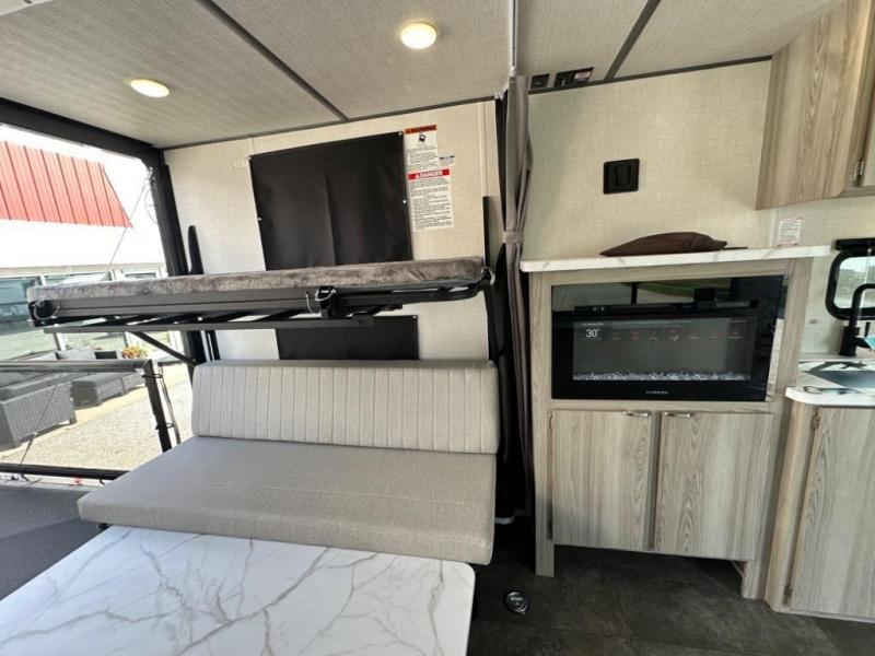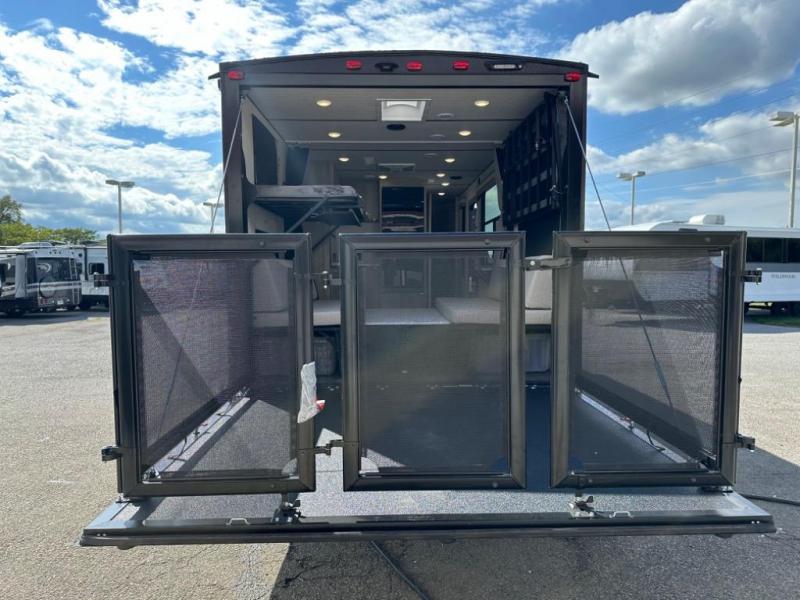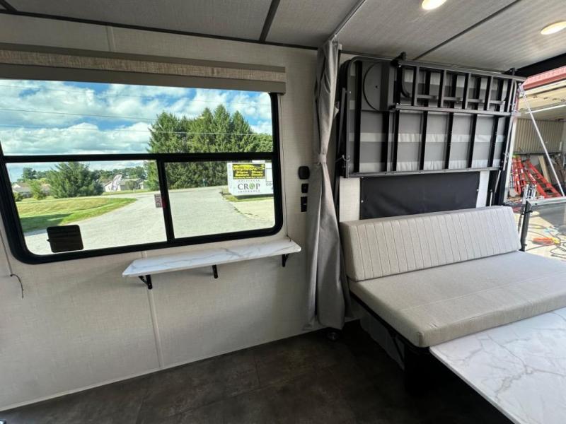 Take your adventures to the max in this MAX toy hauler with more space and features! Unload your dirt bikes from the 14' garage, then convert this space to the 1,500 lb. capacity patio. This model includes two sofa sleepers with a table to dine and let guests sleep over. The main living area will feel more like home with a fireplace, and the full kitchen will allow you to prepare meals for your whole group. If you enjoy cooking outdoors then you will love the outdoor griddle and refrigerator, plus there is an 18' power awning here for shade. After dinner is cleaned up, head to the front private bedroom for a great night's rest and plan to do it all over again tomorrow!
