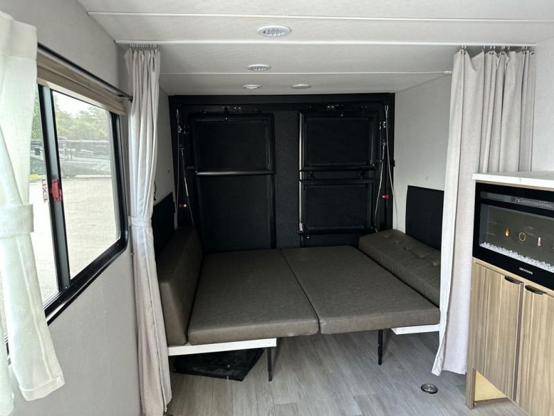 Take your adventures to the max in this MAX toy hauler with more space and features! Unload your dirt bikes from the 14' garage, then convert this space to the 1,500 lb. capacity patio. This model includes two sofa sleepers with a table to dine and let guests sleep over. The main living area will feel more like home with a fireplace, and the full kitchen will allow you to prepare meals for your whole group. If you enjoy cooking outdoors then you will love the outdoor griddle and refrigerator, plus there is an 18' power awning here for shade. After dinner is cleaned up, head to the front private bedroom for a great night's rest and plan to do it all over again tomorrow!