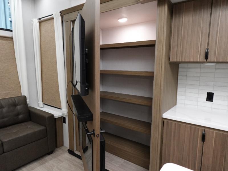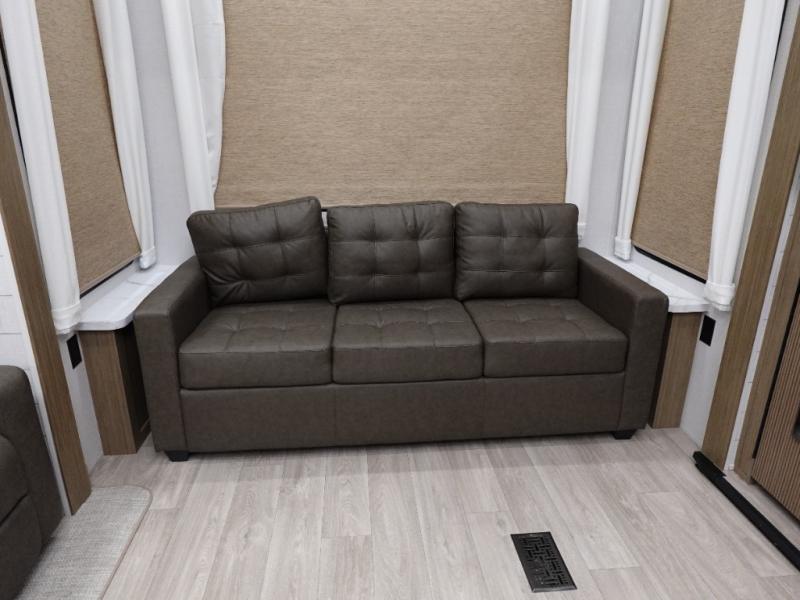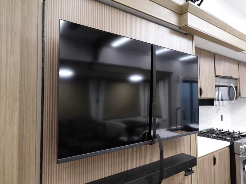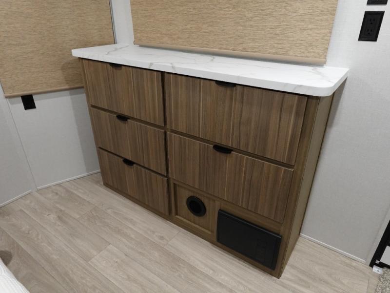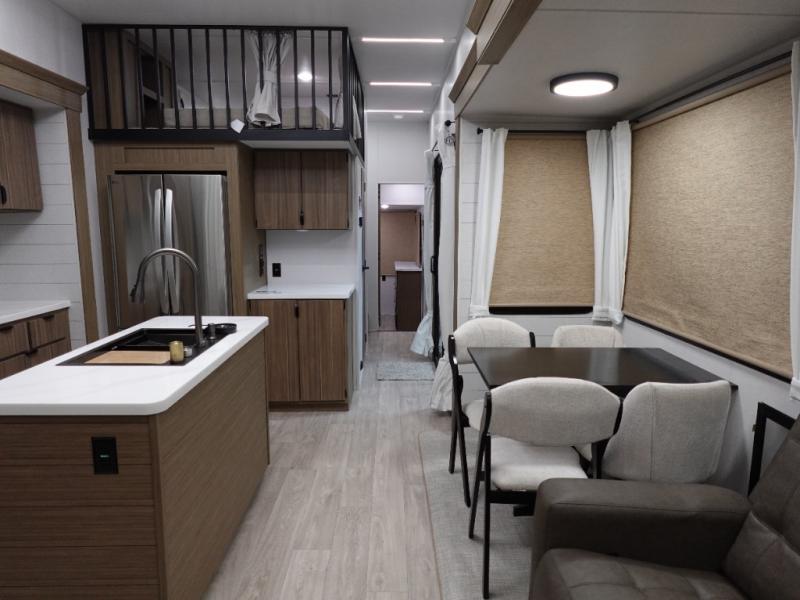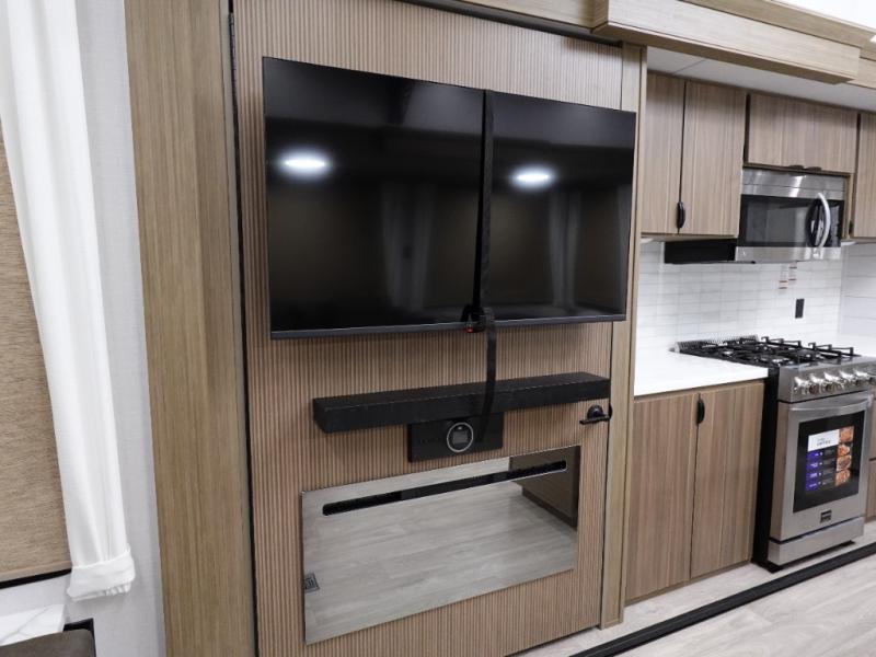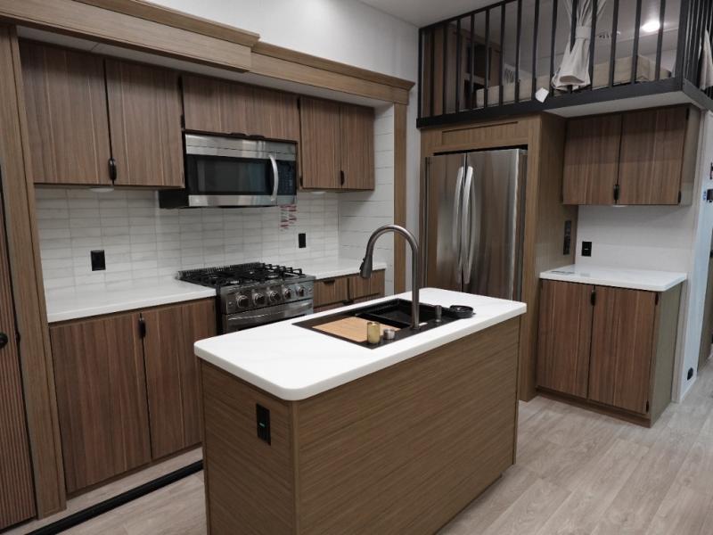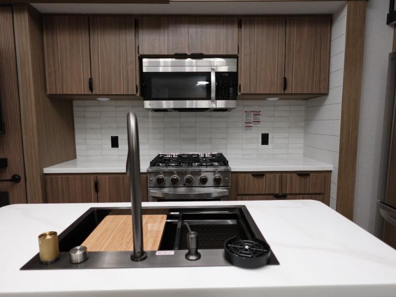 With any Wildwood Grand Lodge destination trailer by Forest River, you can enjoy extended stays wherever you go! There is 4K awning blade lighting outside, along with slide out awning toppers, plus a heated and enclosed Accessibelly for added protection. Inside, you'll love the stylish backsplash update, elegant curtain rods and curtains, TFL black walnut entertainment shelves, and stainless steel kitchen appliances. A Serta mattress in the bedroom(s) will provide comfort to each journey, and there is a tankless water heater for hot water when you need it.