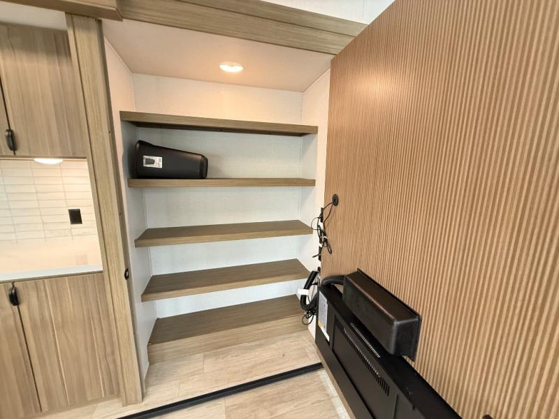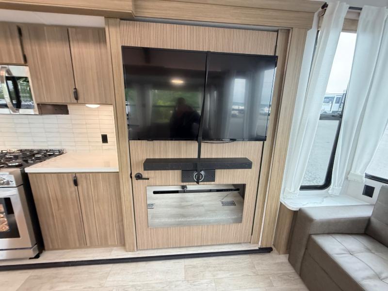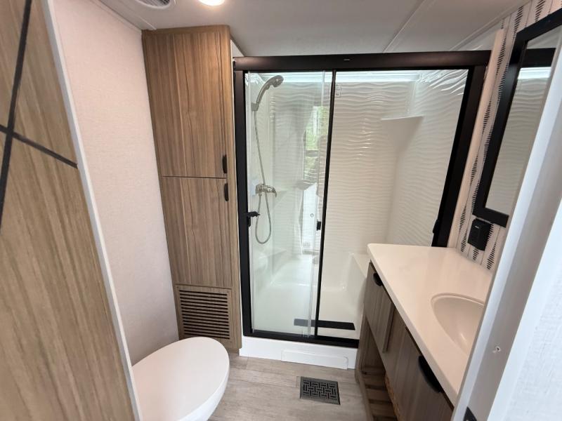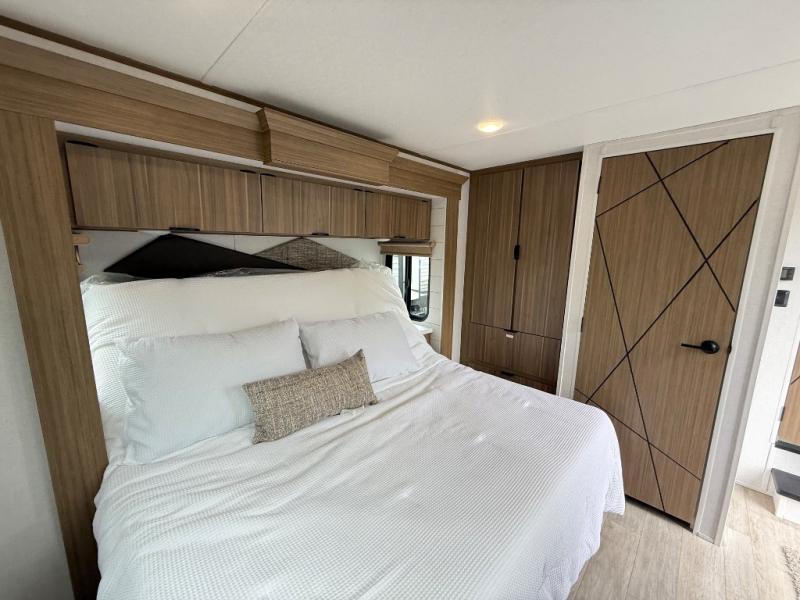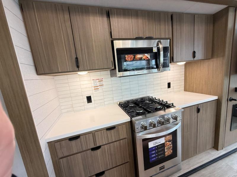 With any Wildwood Grand Lodge destination trailer by Forest River, you can enjoy extended stays wherever you go! There is 4K awning blade lighting outside, along with slide out awning toppers, plus a heated and enclosed Accessibelly for added protection. Inside, you'll love the stylish backsplash update, elegant curtain rods and curtains, TFL black walnut entertainment shelves, and stainless steel kitchen appliances. A Serta mattress in the bedroom(s) will provide comfort to each journey, and there is a tankless water heater for hot water when you need it.