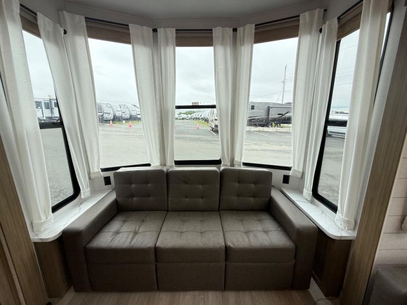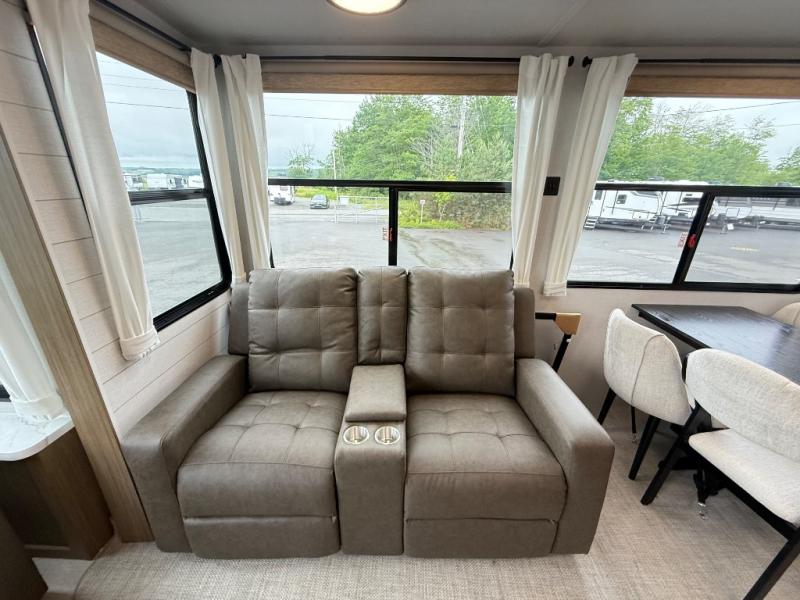 Keep your family happy by providing them with plenty of space and comforts in this Wildwood Grand Lodge destination trailer! The living area is such a gorgeous feature in this unit because of the panoramic front windows that allow you to feel as if you're right in the heart of your surroundings, and as you sit on the sofa next to the fireplace, you'll appreciate the ambiance it brings to this space. If you've decided to stay up late outside underneath the 21' awning, you can rest assured that you'll be able to get back inside quietly without waking anyone up because the second entry door leads directly into the rear private bedroom for your convenience so you can quickly fall asleep on your own king bed with versa-tilt. And the kids will love the double loft with three bunk mats and extra floor space to play.