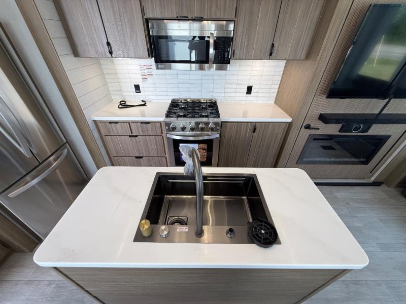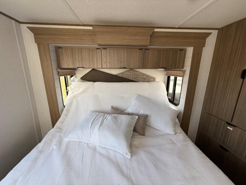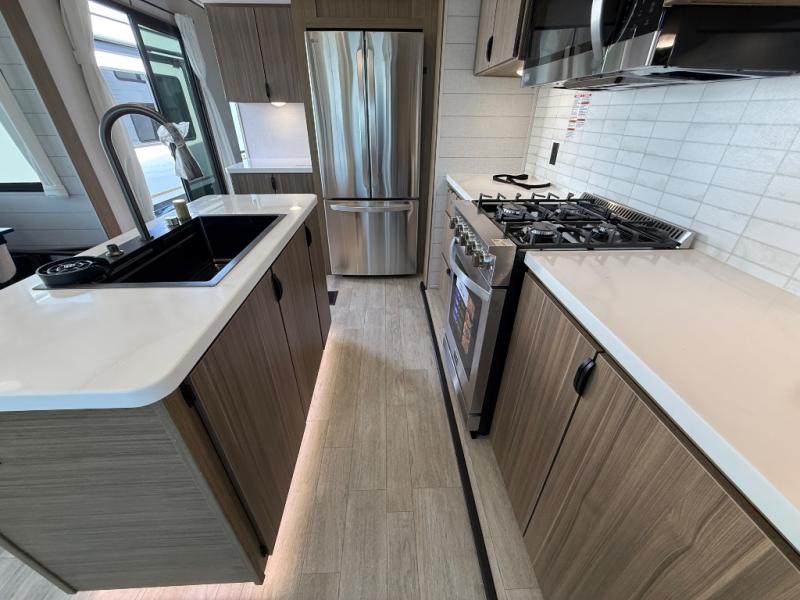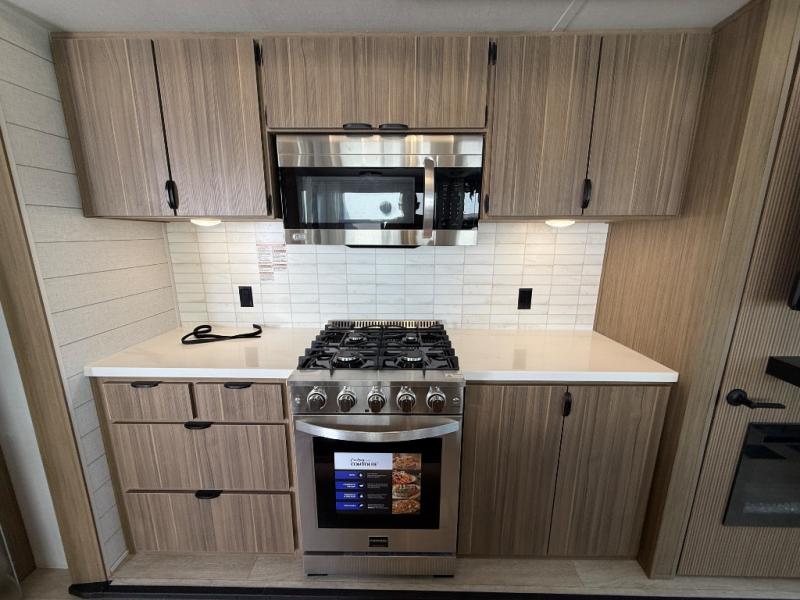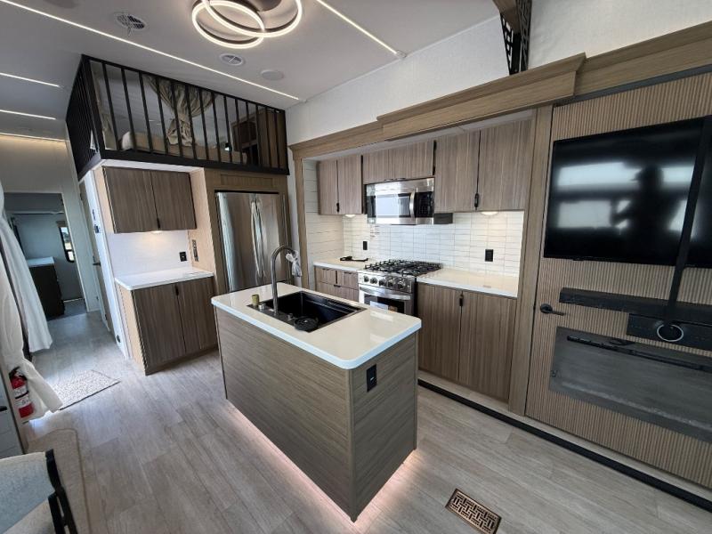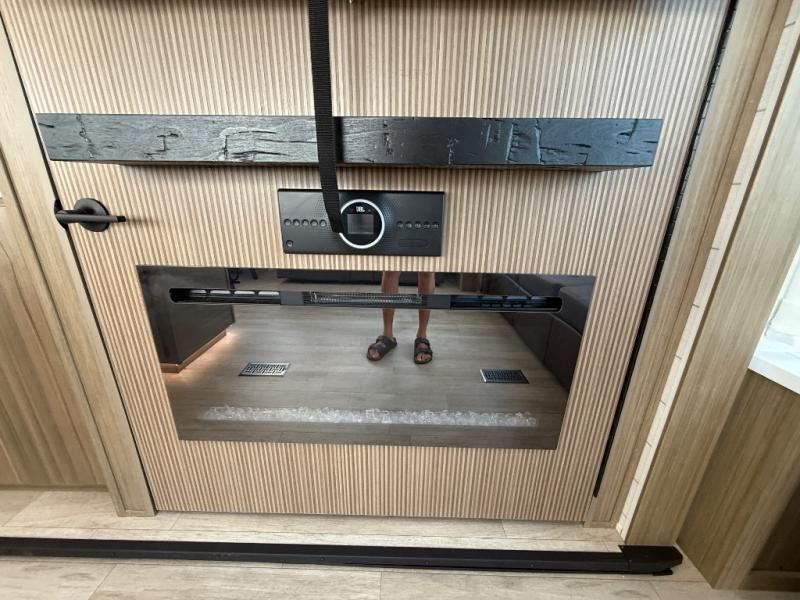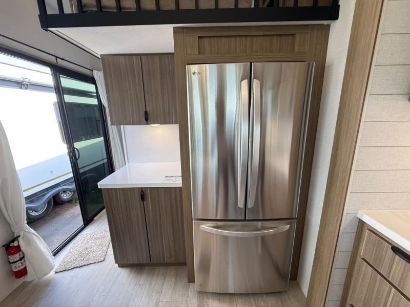 With any Wildwood Grand Lodge destination trailer by Forest River, you can enjoy extended stays wherever you go! There is 4K awning blade lighting outside, along with slide out awning toppers, plus a heated and enclosed Accessibelly for added protection. Inside, you'll love the stylish backsplash update, elegant curtain rods and curtains, TFL black walnut entertainment shelves, and stainless steel kitchen appliances. A Serta mattress in the bedroom(s) will provide comfort to each journey, and there is a tankless water heater for hot water when you need it.
