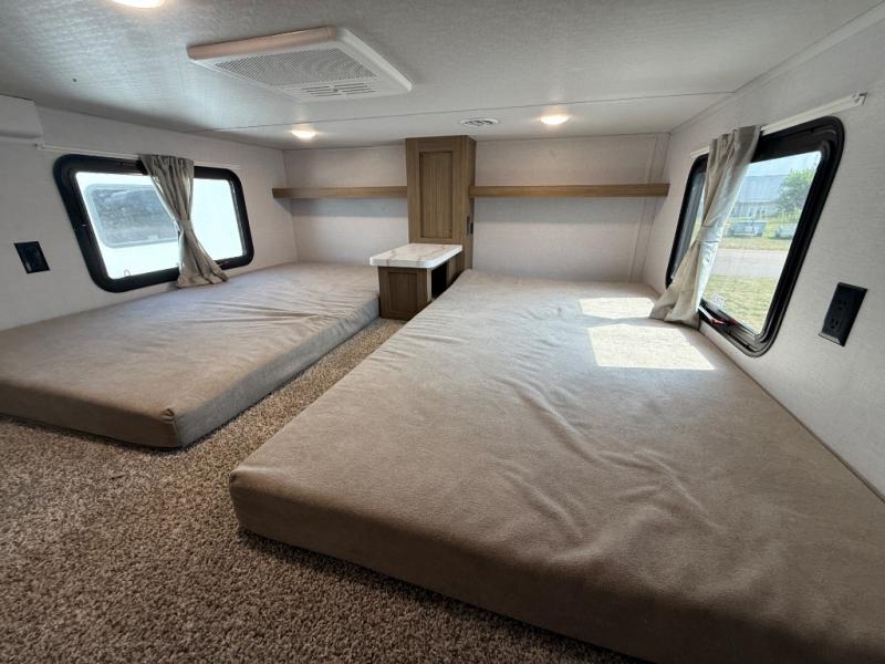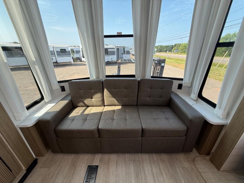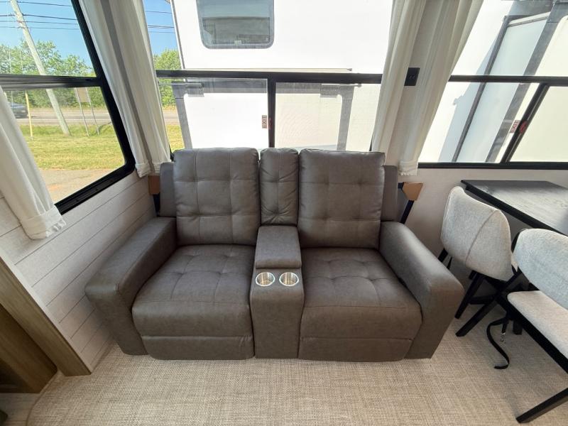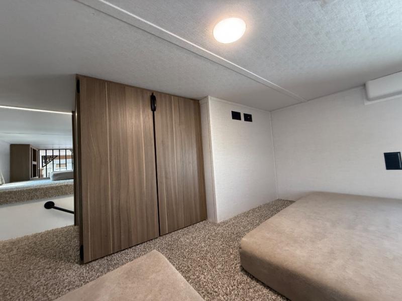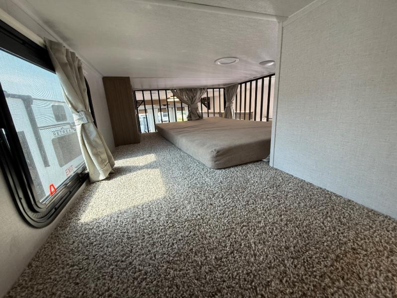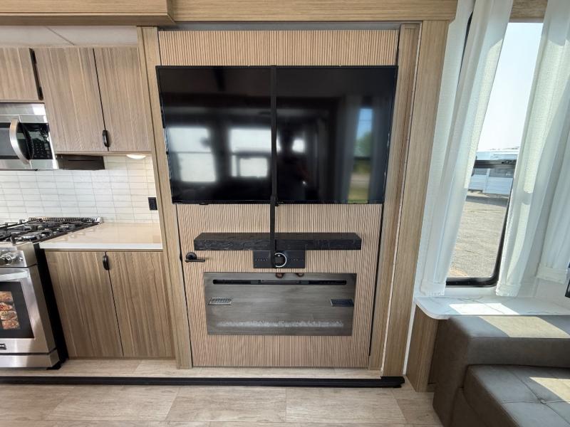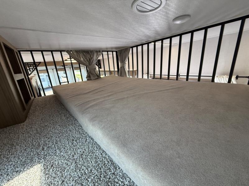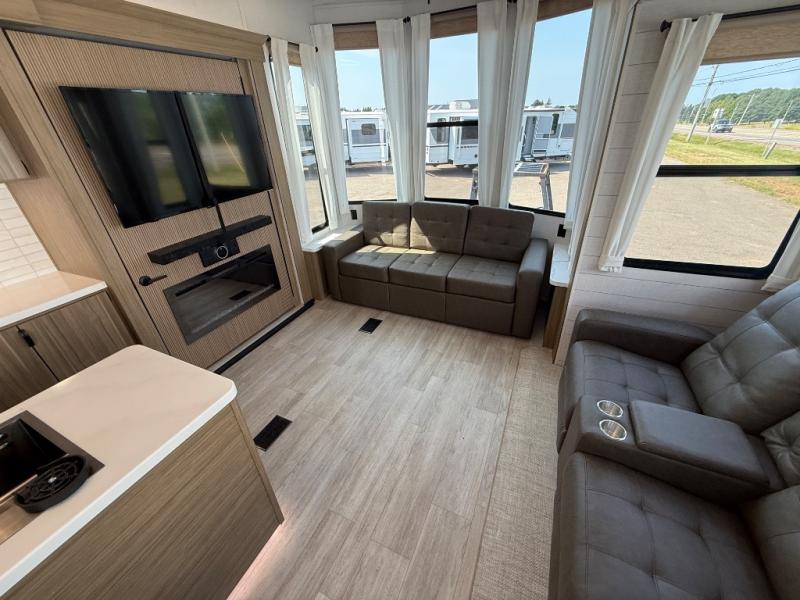 Keep your family happy by providing them with plenty of space and comforts in this Wildwood Grand Lodge destination trailer! The living area is such a gorgeous feature in this unit because of the panoramic front windows that allow you to feel as if you're right in the heart of your surroundings, and as you sit on the sofa next to the fireplace, you'll appreciate the ambiance it brings to this space. If you've decided to stay up late outside underneath the 21' awning, you can rest assured that you'll be able to get back inside quietly without waking anyone up because the second entry door leads directly into the rear private bedroom for your convenience so you can quickly fall asleep on your own king bed with versa-tilt. And the kids will love the double loft with three bunk mats and extra floor space to play.