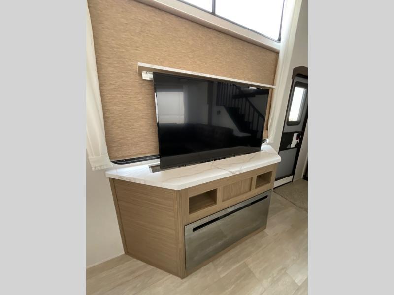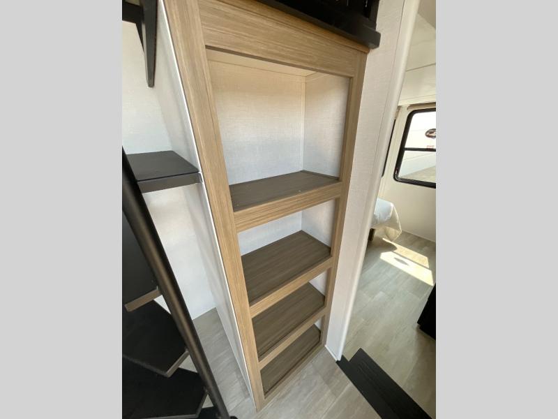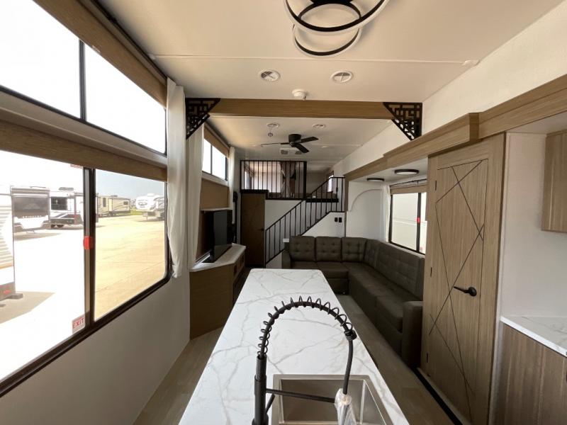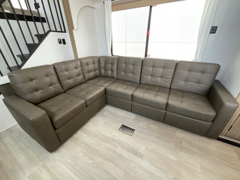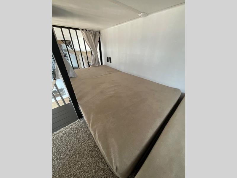 This trailer is built with comfort and convenience in mind, offering plenty of sleeping space for the whole gang. It has two spacious lofts, each equipped with two 42" x 72" bunk mats, plus an extra 36" x 38" bunk mat, providing cozy sleeping spots for everyone. Each loft also includes built-in storage for essentials, and instead of climbing a ladder, easy stair access makes getting in and out much safer. On the main floor, you’ll find a full rear bathroom with a walk-in shower and washer/dryer prep. The main living area has a large sectional sofa, perfect for gathering the group to watch the TV on the Televator or relaxing by the fireplace after a day outdoors. The kitchen is equipped with all the essentials, including a large pantry, overhead cabinets for snack storage, a fridge, and a kitchen island that adds prep space. Up front, the private bedroom has a king bed with Versa Tilt, a dresser, and shelves to keep your clothes and camp gear neatly organized. Regardless that you're adventuring about, this trailer is ready to make every trip feel like home.