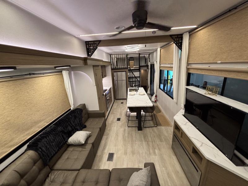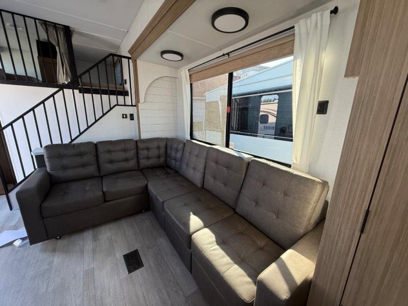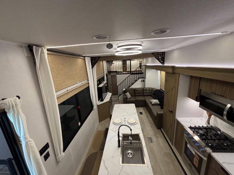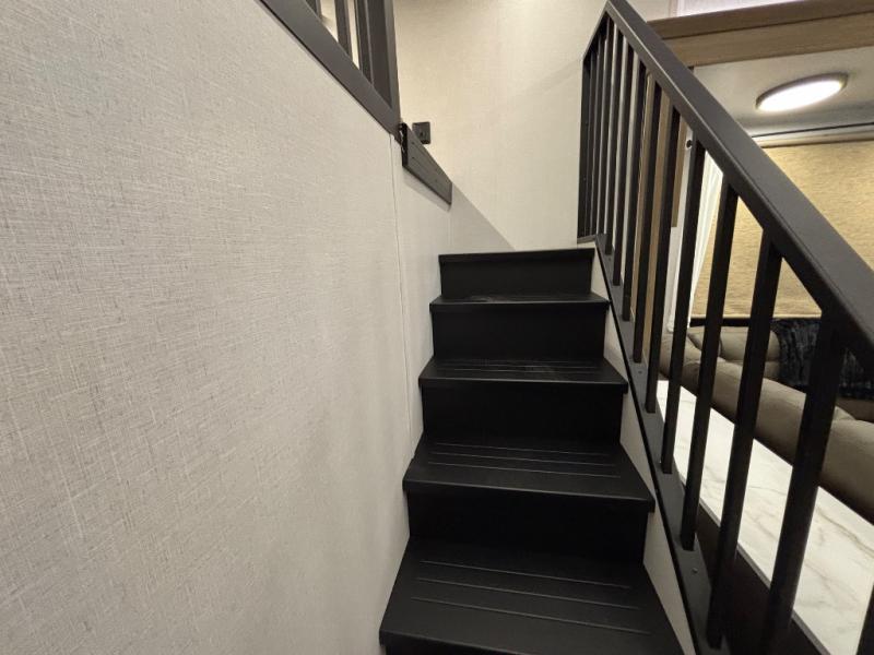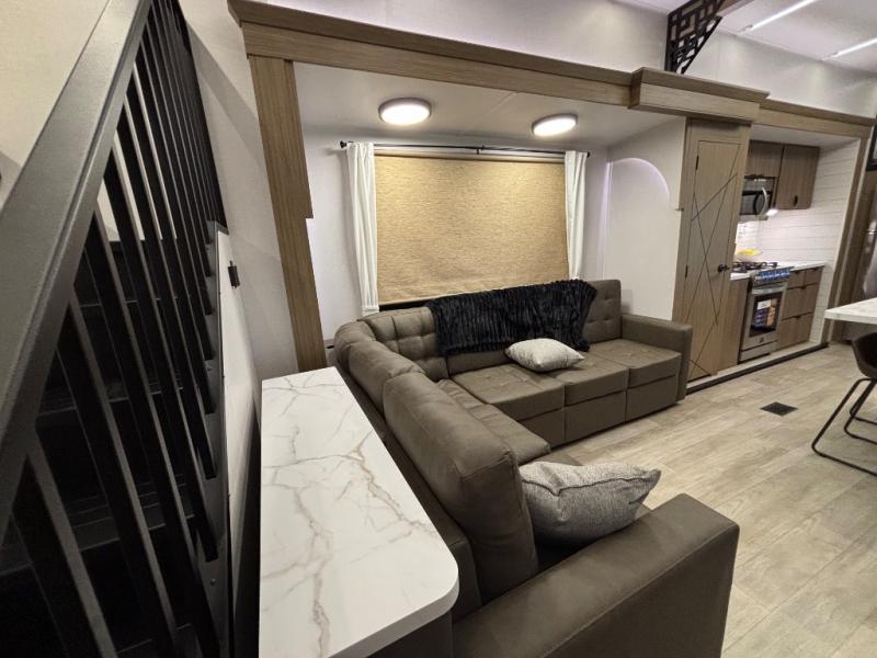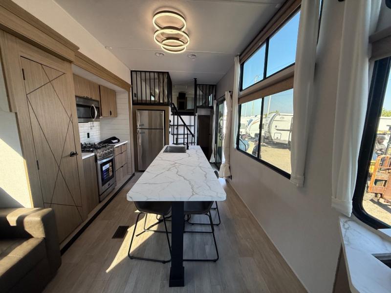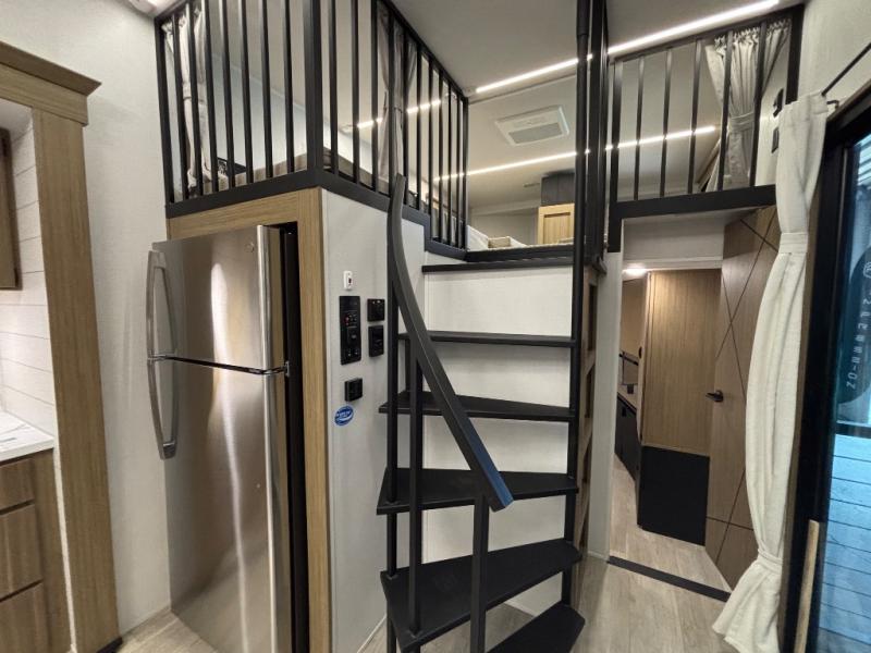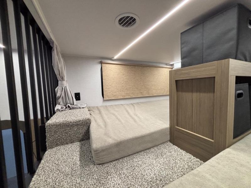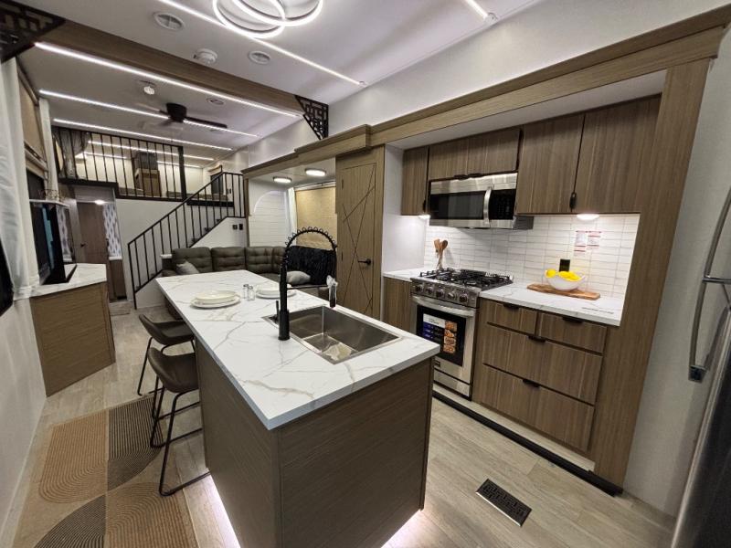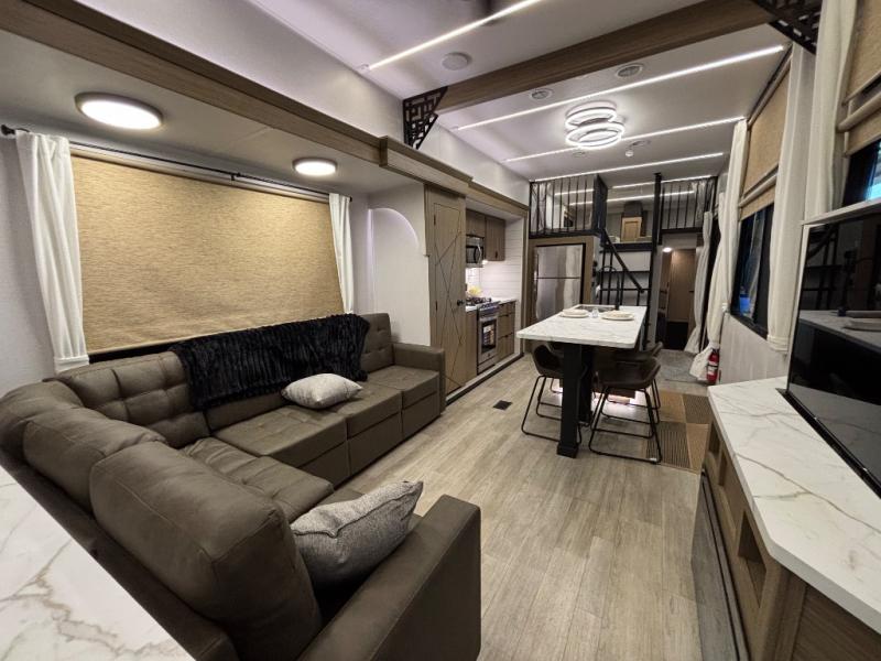 Indulge in the ultimate getaway experience with our opulent destination trailer. The lavish rear bathroom features a spacious walk-in shower, ideal for rejuvenating after a long day. In the living area, the plush sectional sofa is a hub for socializing and relaxation, while the entertainment center with a fireplace creates a warm and inviting ambiance. The kitchen is equipped with a pantry, an elegant kitchen island with stools, and ample overhead cabinets, making meal prep and dining a true delight. Additionally, the spacious side-by-side refrigerator offers ample storage for your favorite foods and beverages. The majestic front bedroom is a serene retreat, featuring a sumptuous king bed with versa VersaTilt, a stylish dresser, and generous storage space. The charming loft is the cherry on top, perfect for kids or adults alike, with four cozy bunk mats and spiral steps leading up to a peaceful sleeping nook.