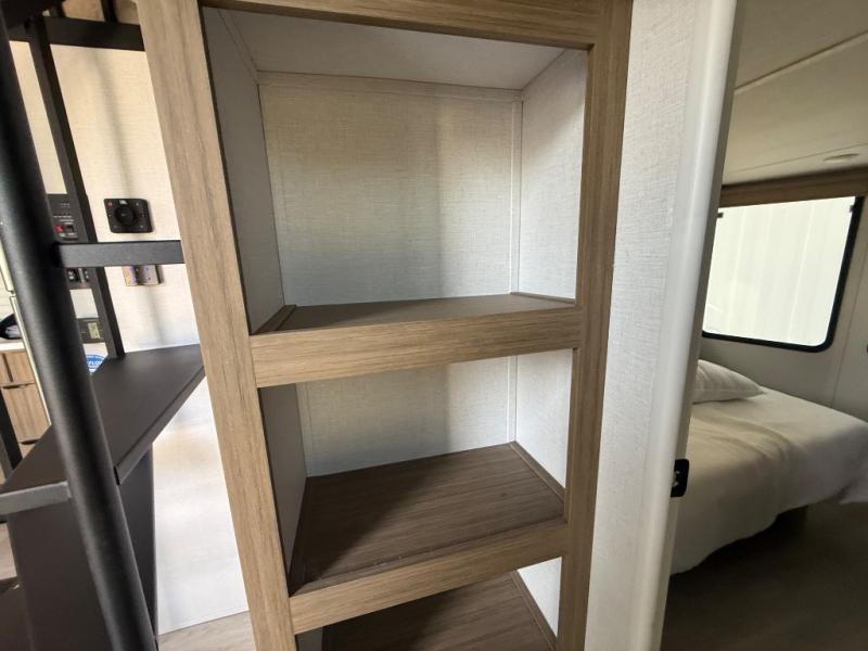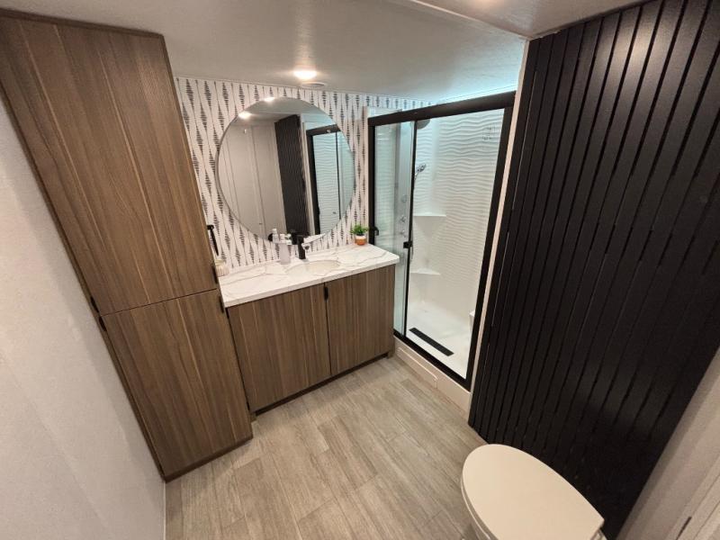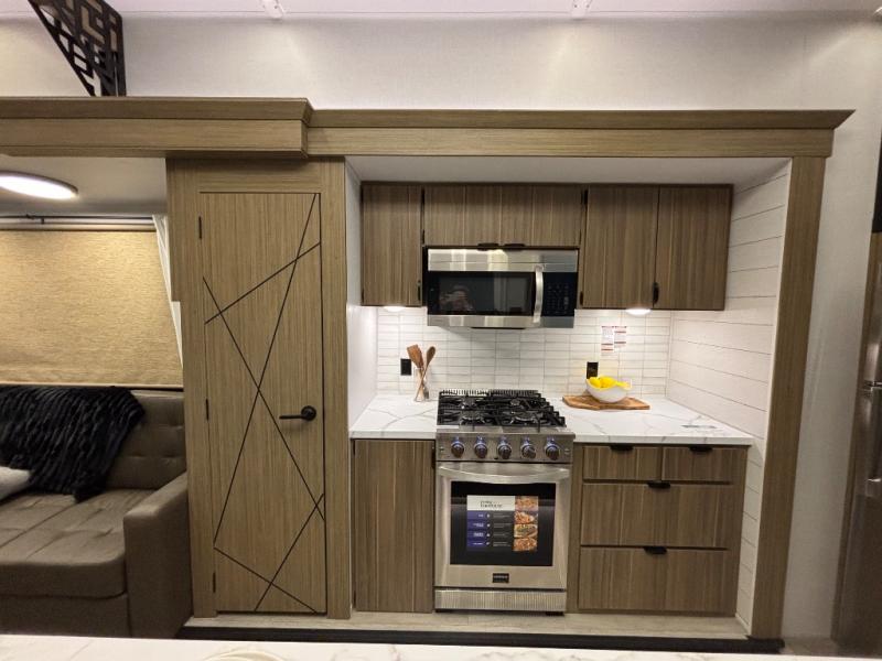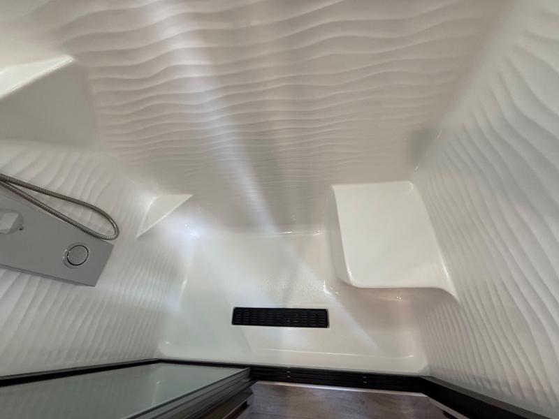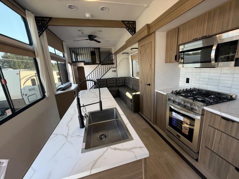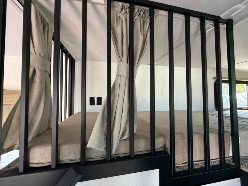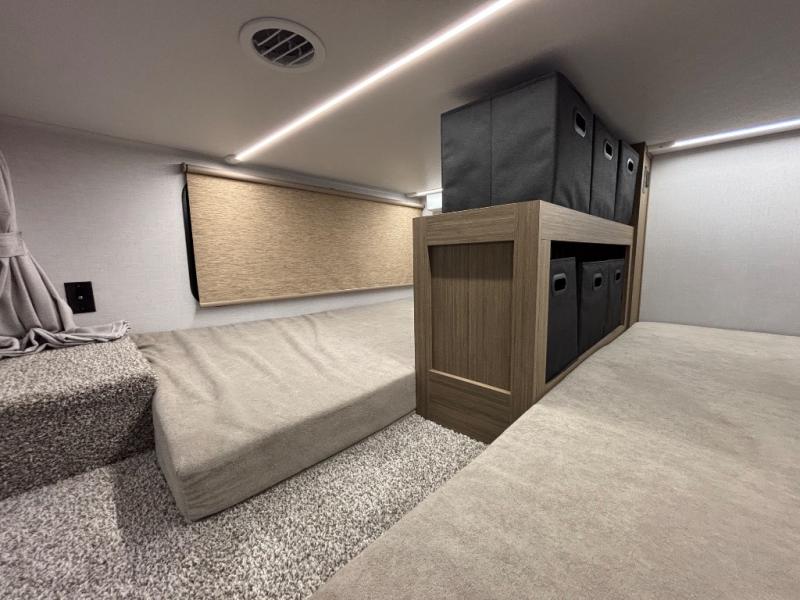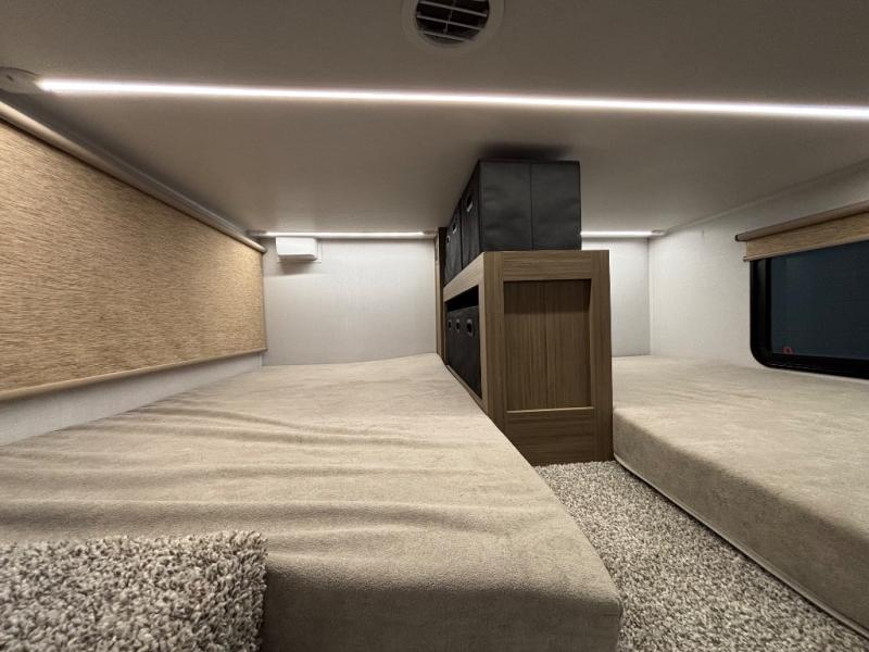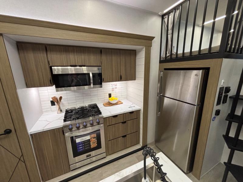 Indulge in the ultimate getaway experience with our opulent destination trailer. The lavish rear bathroom features a spacious walk-in shower, ideal for rejuvenating after a long day. In the living area, the plush sectional sofa is a hub for socializing and relaxation, while the entertainment center with a fireplace creates a warm and inviting ambiance. The kitchen is equipped with a pantry, an elegant kitchen island with stools, and ample overhead cabinets, making meal prep and dining a true delight. Additionally, the spacious side-by-side refrigerator offers ample storage for your favorite foods and beverages. The majestic front bedroom is a serene retreat, featuring a sumptuous king bed with versa VersaTilt, a stylish dresser, and generous storage space. The charming loft is the cherry on top, perfect for kids or adults alike, with four cozy bunk mats and spiral steps leading up to a peaceful sleeping nook.