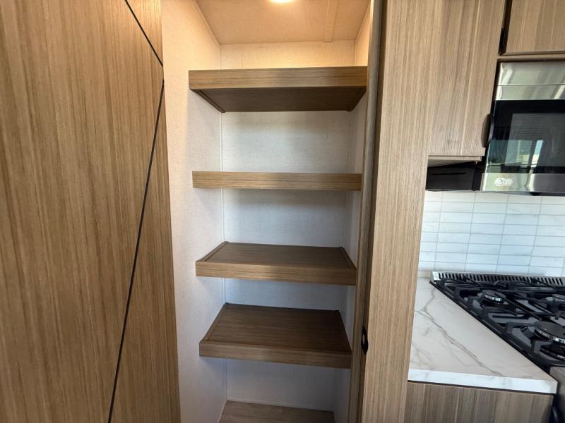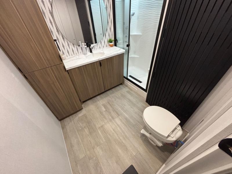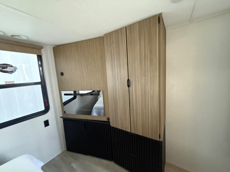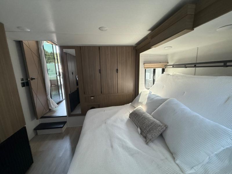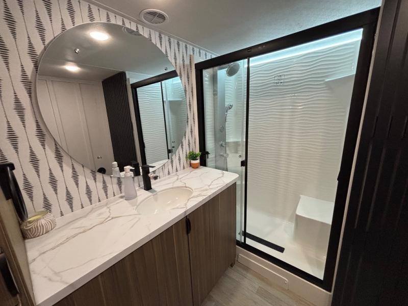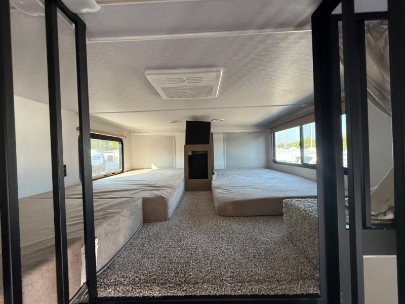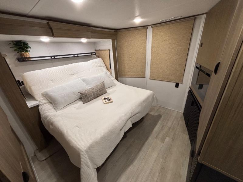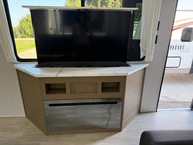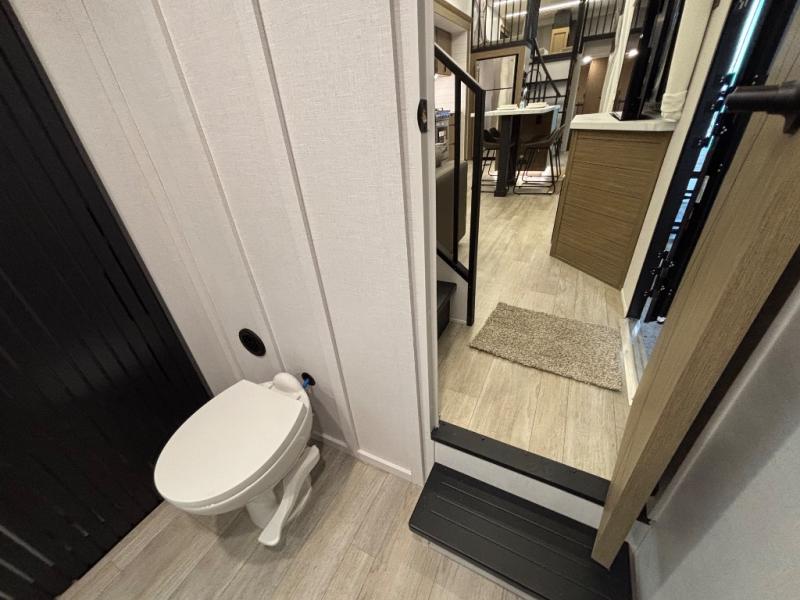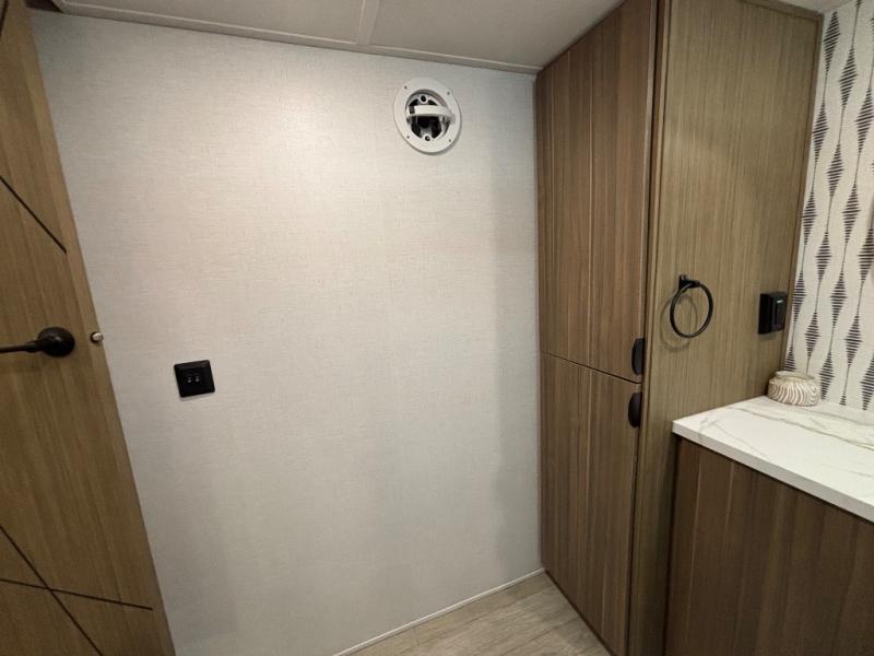 Indulge in the ultimate getaway experience with our opulent destination trailer. The lavish rear bathroom features a spacious walk-in shower, ideal for rejuvenating after a long day. In the living area, the plush sectional sofa is a hub for socializing and relaxation, while the entertainment center with a fireplace creates a warm and inviting ambiance. The kitchen is equipped with a pantry, an elegant kitchen island with stools, and ample overhead cabinets, making meal prep and dining a true delight. Additionally, the spacious side-by-side refrigerator offers ample storage for your favorite foods and beverages. The majestic front bedroom is a serene retreat, featuring a sumptuous king bed with versa VersaTilt, a stylish dresser, and generous storage space. The charming loft is the cherry on top, perfect for kids or adults alike, with four cozy bunk mats and spiral steps leading up to a peaceful sleeping nook.