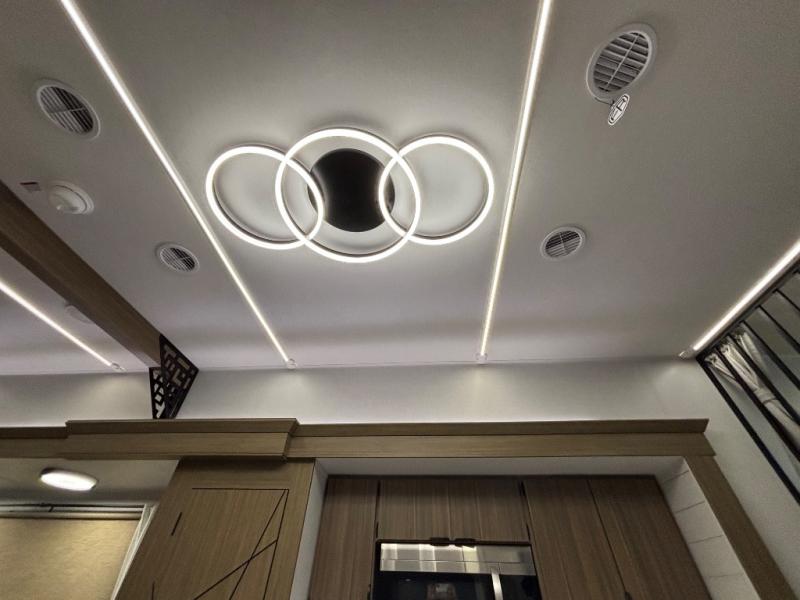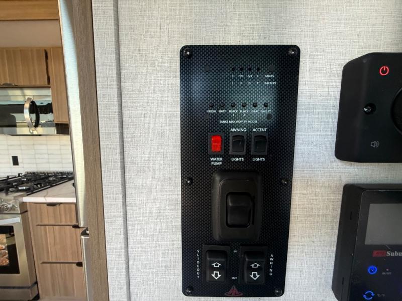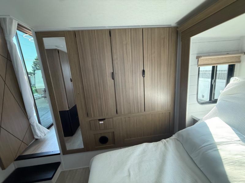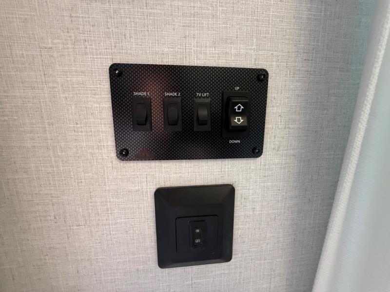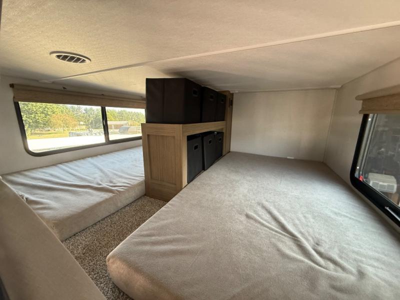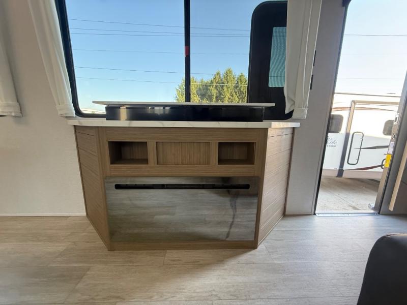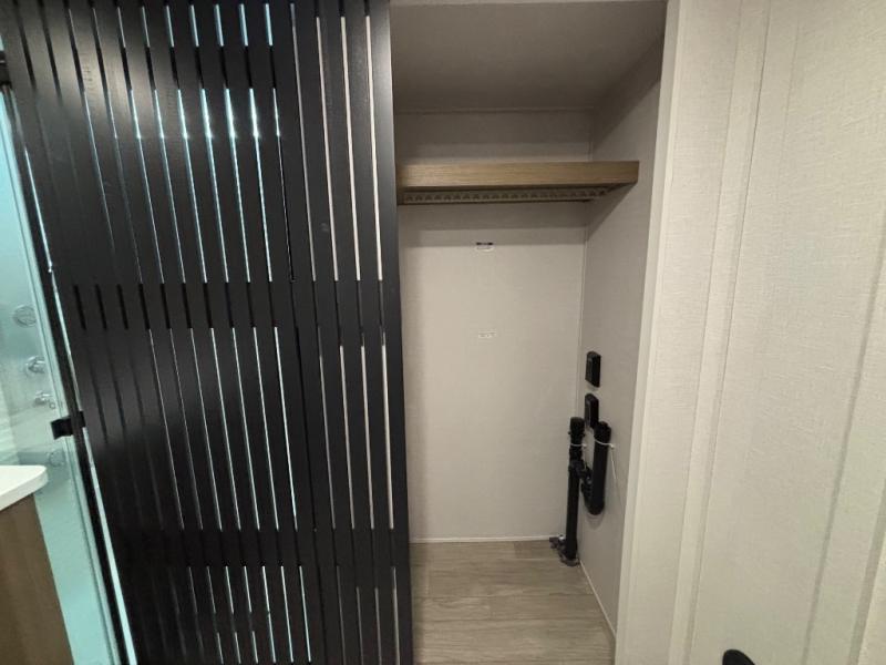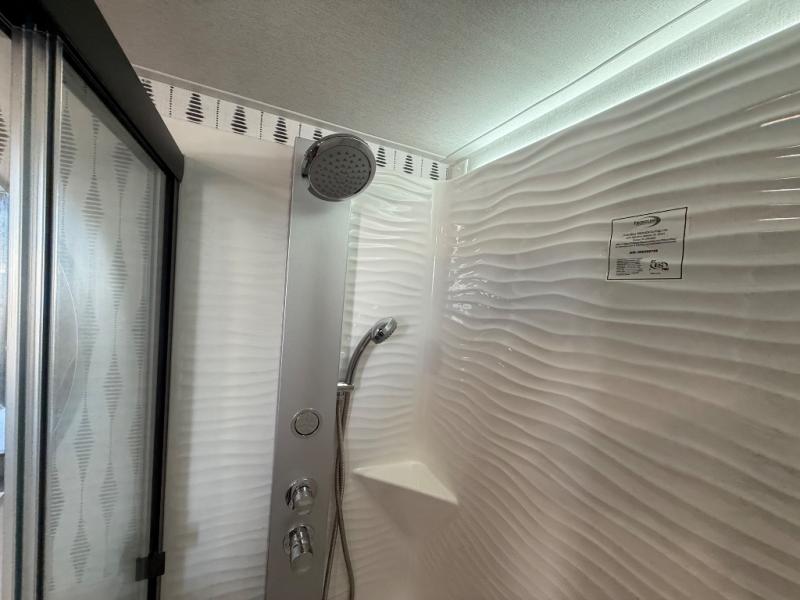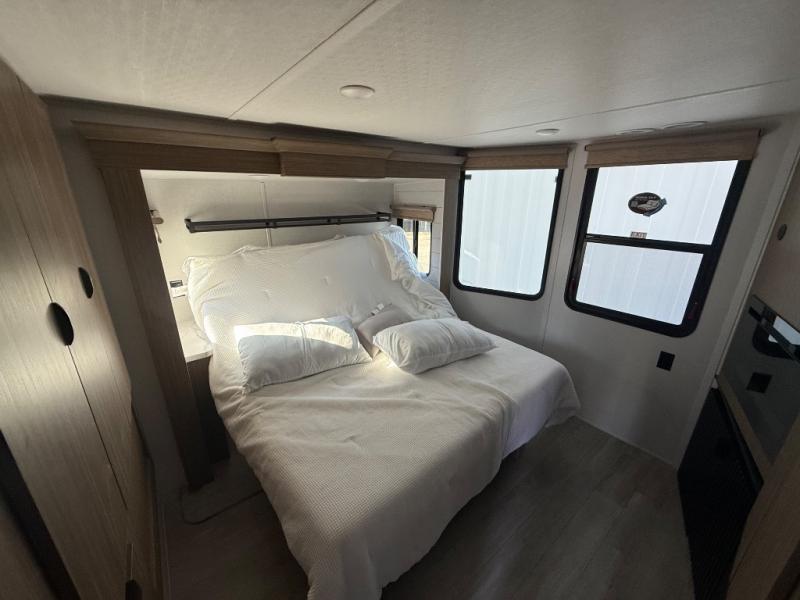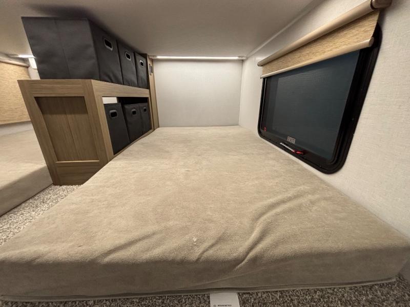 Indulge in the ultimate getaway experience with our opulent destination trailer. The lavish rear bathroom features a spacious walk-in shower, ideal for rejuvenating after a long day. In the living area, the plush sectional sofa is a hub for socializing and relaxation, while the entertainment center with a fireplace creates a warm and inviting ambiance. The kitchen is equipped with a pantry, an elegant kitchen island with stools, and ample overhead cabinets, making meal prep and dining a true delight. Additionally, the spacious side-by-side refrigerator offers ample storage for your favorite foods and beverages. The majestic front bedroom is a serene retreat, featuring a sumptuous king bed with versa VersaTilt, a stylish dresser, and generous storage space. The charming loft is the cherry on top, perfect for kids or adults alike, with four cozy bunk mats and spiral steps leading up to a peaceful sleeping nook.