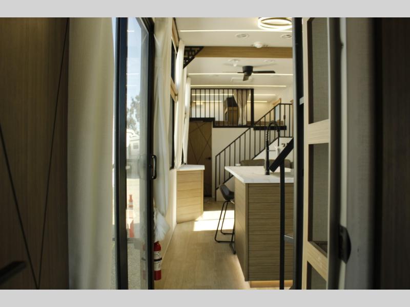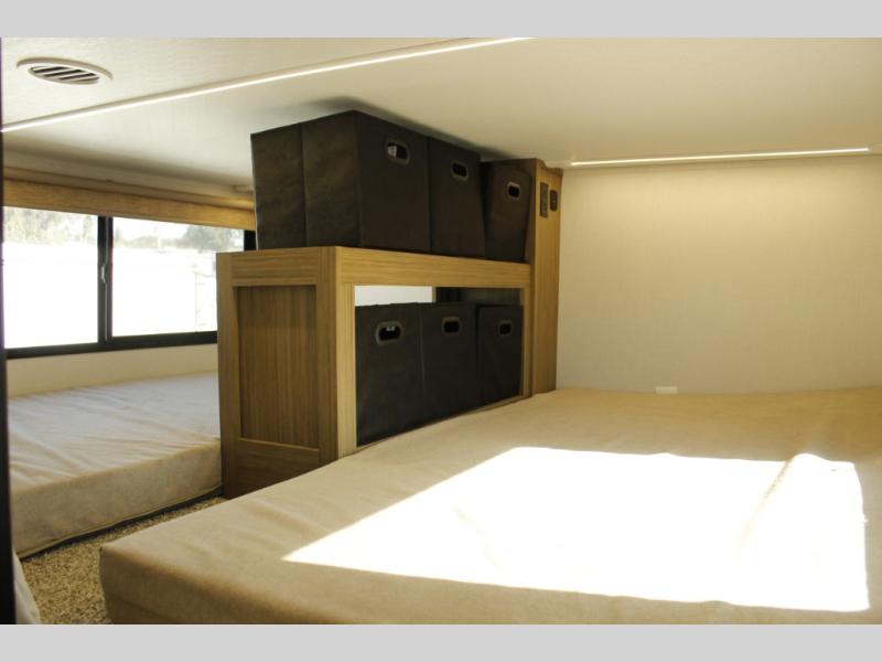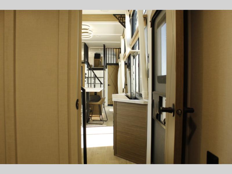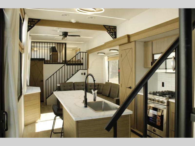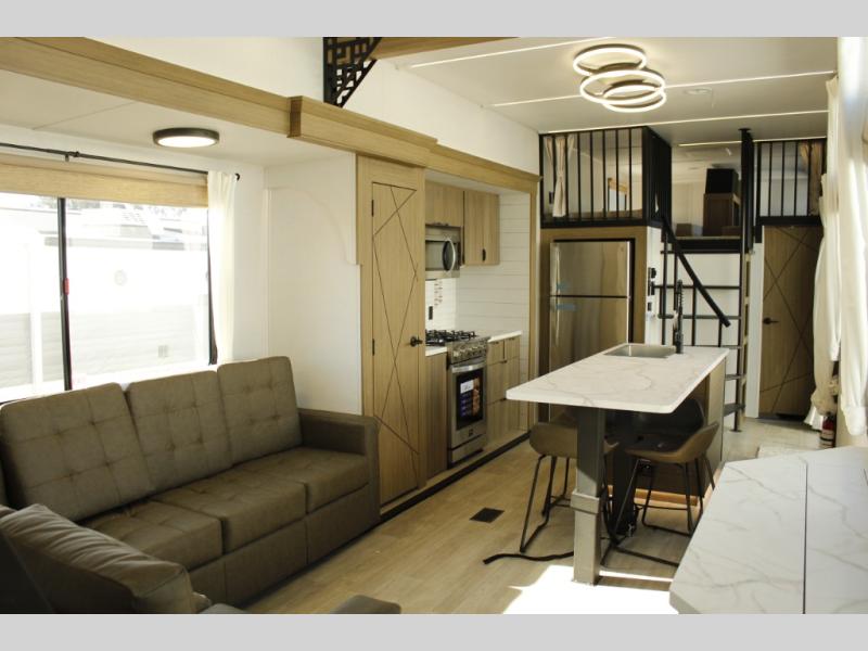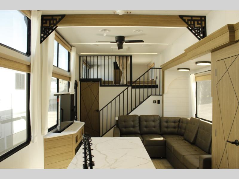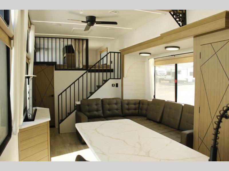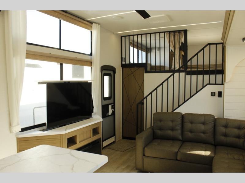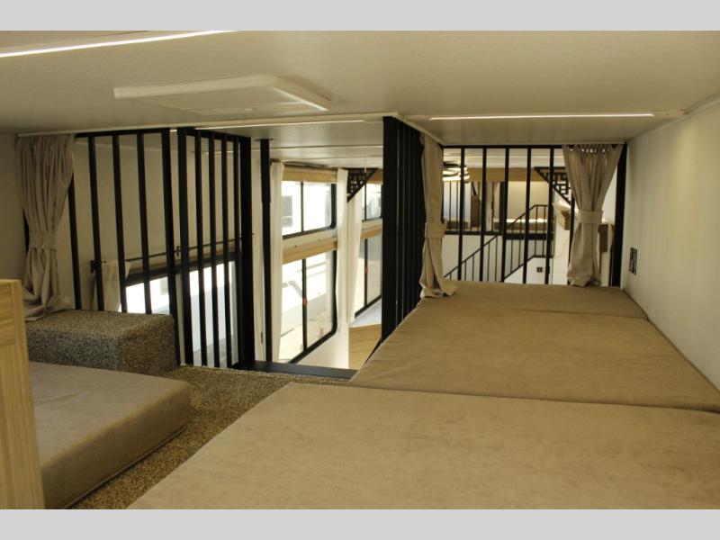 This trailer is built with comfort and convenience in mind, offering plenty of sleeping space for the whole gang. It has two spacious lofts, each equipped with two 42" x 72" bunk mats, plus an extra 36" x 38" bunk mat, providing cozy sleeping spots for everyone. Each loft also includes built-in storage for essentials, and instead of climbing a ladder, easy stair access makes getting in and out much safer. On the main floor, you’ll find a full rear bathroom with a walk-in shower and washer/dryer prep. The main living area has a large sectional sofa, perfect for gathering the group to watch the TV on the Televator or relaxing by the fireplace after a day outdoors. The kitchen is equipped with all the essentials, including a large pantry, overhead cabinets for snack storage, a fridge, and a kitchen island that adds prep space. Up front, the private bedroom has a king bed with Versa Tilt, a dresser, and shelves to keep your clothes and camp gear neatly organized. Regardless that you're adventuring about, this trailer is ready to make every trip feel like home.
