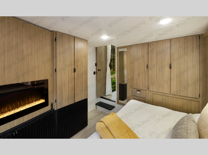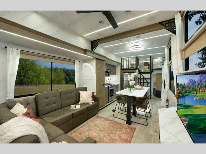 This trailer is built with comfort and convenience in mind, offering plenty of sleeping space for the whole gang. It has two spacious lofts, each equipped with two 42" x 72" bunk mats, plus an extra 36" x 38" bunk mat, providing cozy sleeping spots for everyone. Each loft also includes built-in storage for essentials, and instead of climbing a ladder, easy stair access makes getting in and out much safer. On the main floor, you’ll find a full rear bathroom with a walk-in shower and washer/dryer prep. The main living area has a large sectional sofa, perfect for gathering the group to watch the TV on the Televator or relaxing by the fireplace after a day outdoors. The kitchen is equipped with all the essentials, including a large pantry, overhead cabinets for snack storage, a fridge, and a kitchen island that adds prep space. Up front, the private bedroom has a king bed with Versa Tilt, a dresser, and shelves to keep your clothes and camp gear neatly organized. Regardless that you're adventuring about, this trailer is ready to make every trip feel like home.