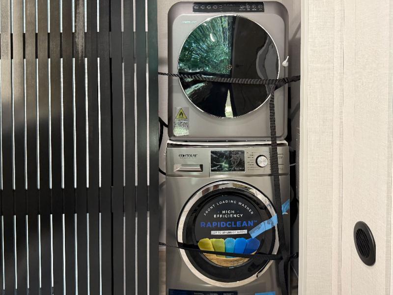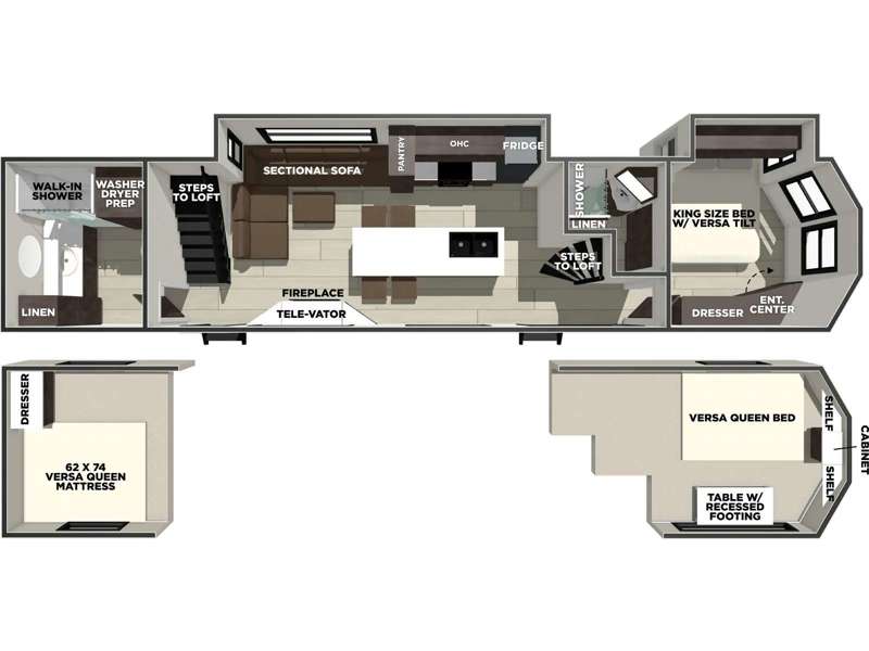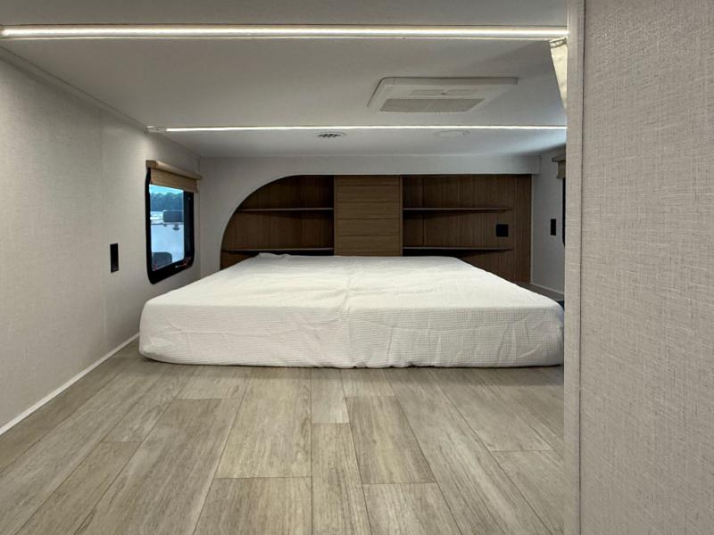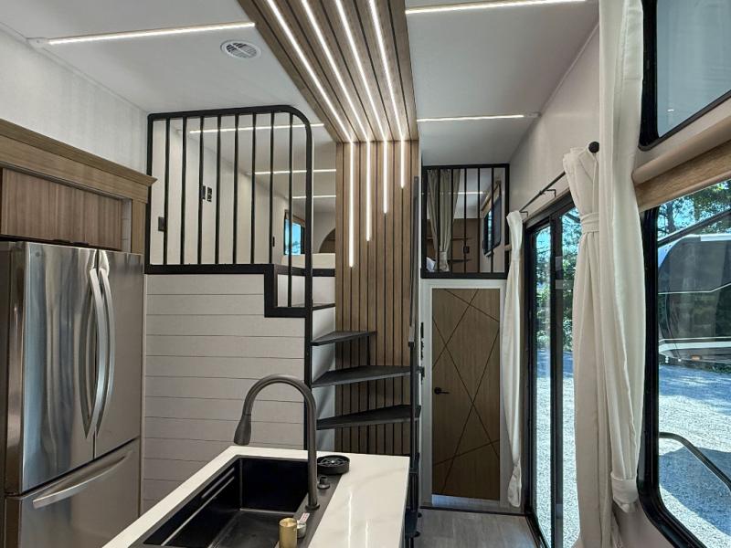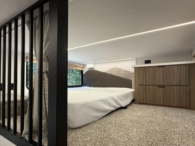 Relax in the cozy living room featuring a fireplace, theater seating, and a retractable TV. The private master suite includes a king-size bed, wardrobe storage, and washer/dryer prep. Upstairs, the double loft offers extra sleeping space or storage — ideal for families or guests.