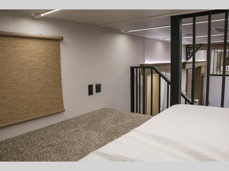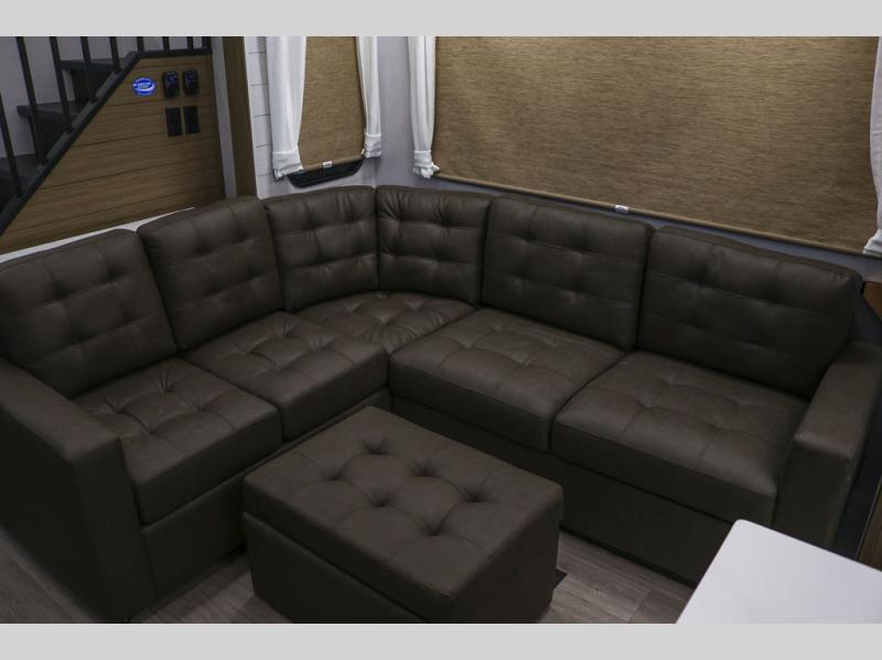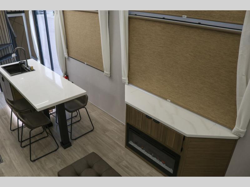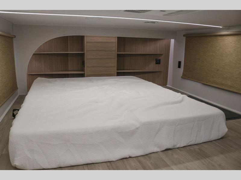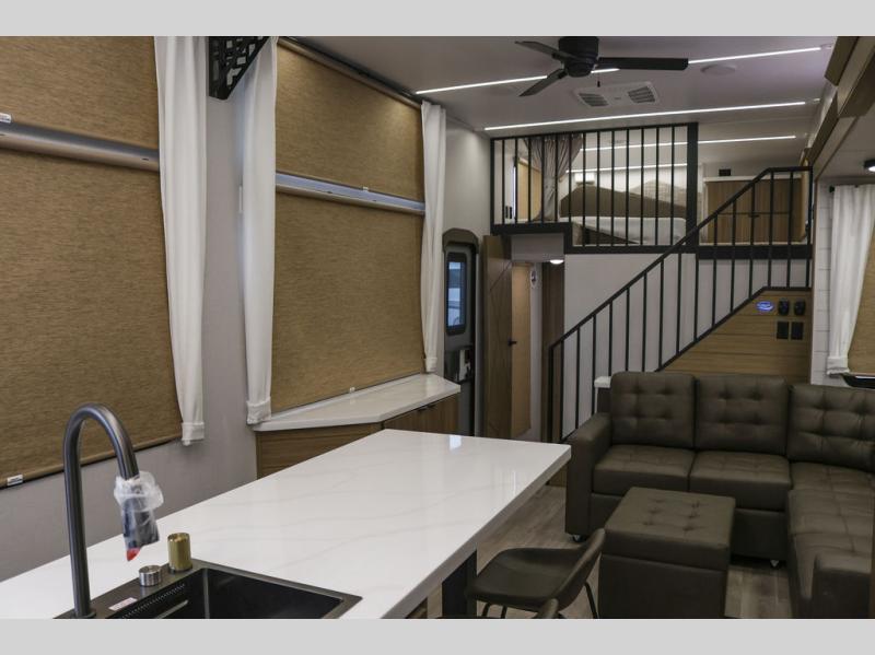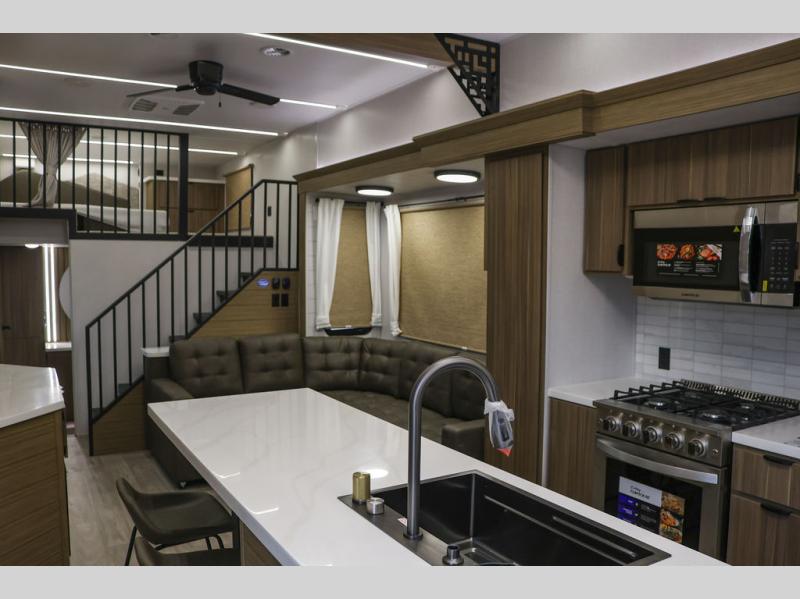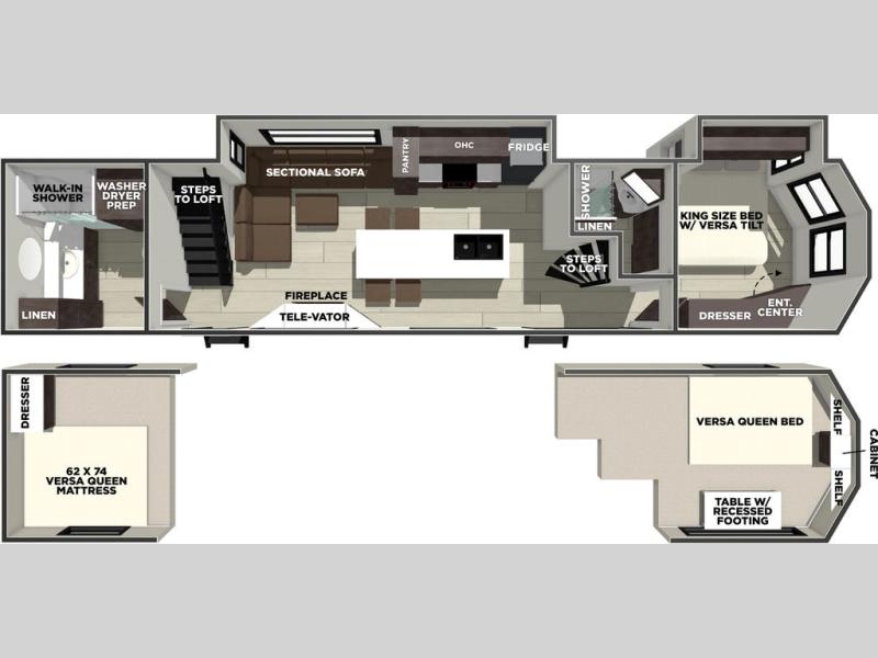 This thoughtfully designed 42ZEN model provides a blend of comfort and functionality. It features two lofts for added sleeping and living space, one includes a 62" x 74" Versa queen mattress and a dresser for storing clothes and essentials, while the second loft offers another Versa queen bed, plus a table with recessed footing, perfect for getting work or study done on the road. There is also a cabinet and shelf to keep everything organized. On the main floor, you'll find a large rear full bathroom, complete with a walk-in shower, linen closet, and washer/dryer prep, providing all the comforts of home. The main living area centers around a large sectional sofa with room for the whole crew, facing a fireplace and Televator TV, making it the perfect space to relax after a long day. The kitchen island also adds valuable prep space and also serves as a gathering spot with room for stools. Up front, the master bedroom features a king-size bed with Versa Tilt, a dresser, and its own private bathroom, offering convenience and privacy whenever you need it.