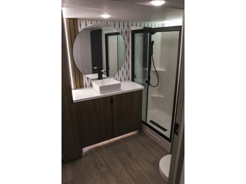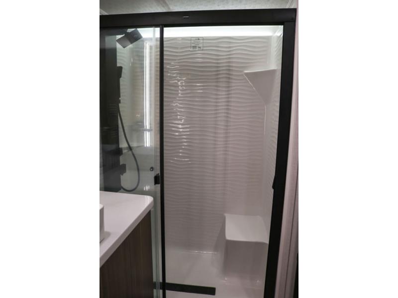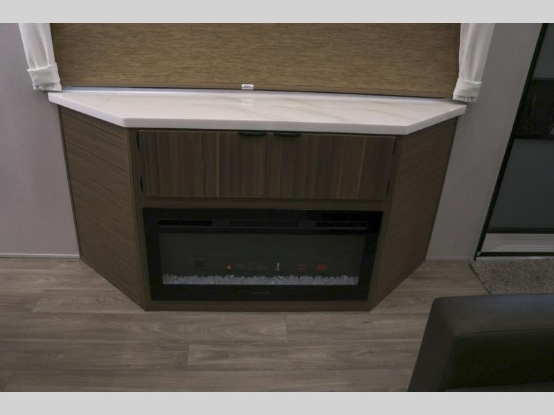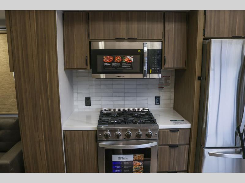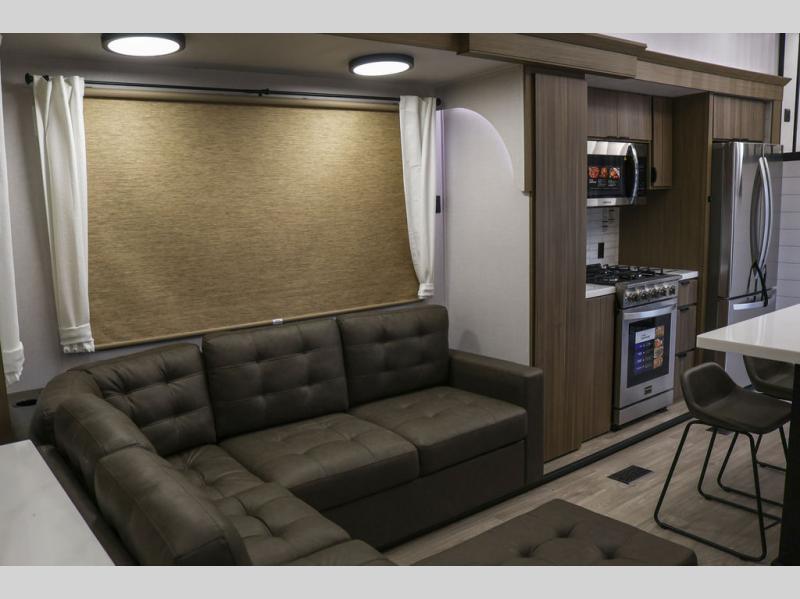 With any Wildwood Grand Lodge destination trailer by Forest River, you can enjoy extended stays wherever you go! There is 4K awning blade lighting outside, along with Tufflex PVC roofing, plus a heated and enclosed Accessibelly for added protection. Inside, you'll love the stylish backsplash update, elegant curtain rods and curtains, TFL black walnut entertainment shelves, and stainless-steel kitchen appliances. A Serta mattress in the bedroom(s) will provide comfort to each journey, and there is a tankless water heater for hot water when you need it.