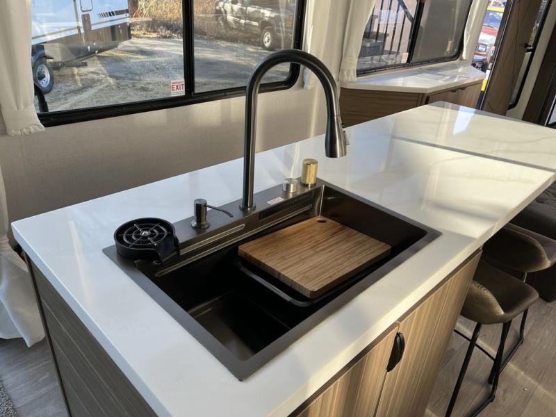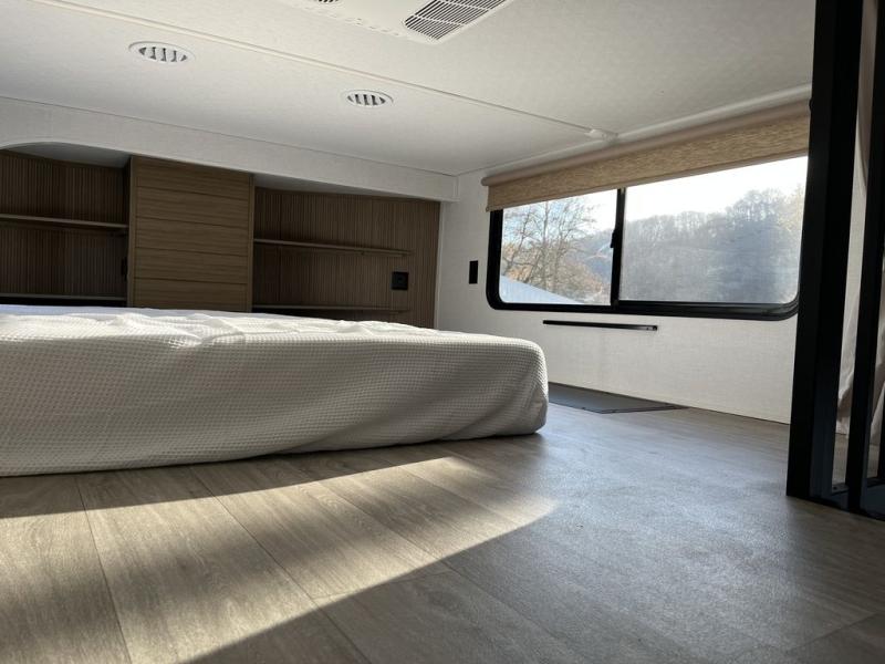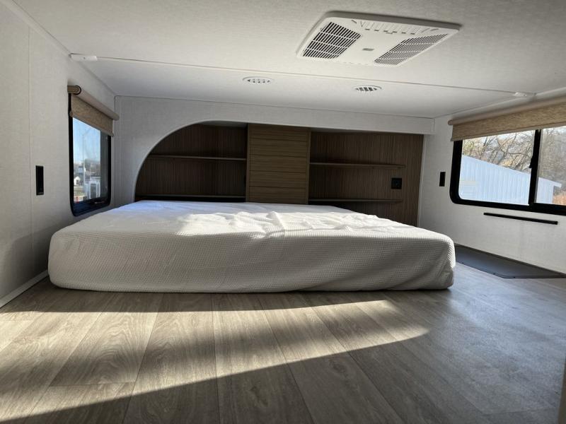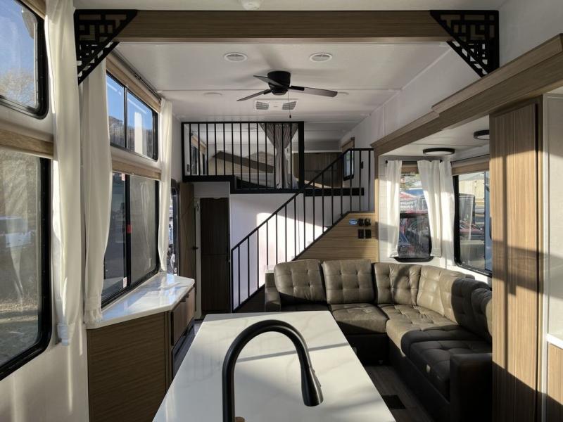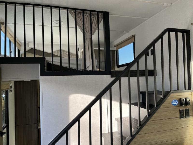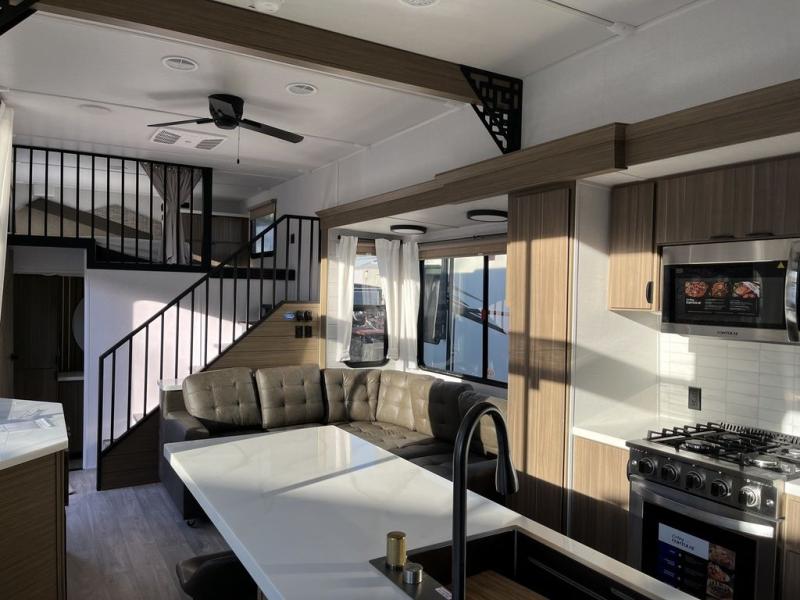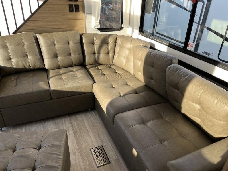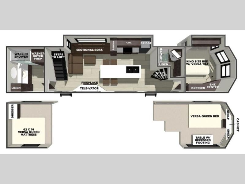 This thoughtfully designed 42ZEN model provides a blend of comfort and functionality. It features two lofts for added sleeping and living space, one includes a 62" x 74" Versa queen mattress and a dresser for storing clothes and essentials, while the second loft offers another Versa queen bed, plus a table with recessed footing, perfect for getting work or study done on the road. There is also a cabinet and shelf to keep everything organized. On the main floor, you'll find a large rear full bathroom, complete with a walk-in shower, linen closet, and washer/dryer prep, providing all the comforts of home. The main living area centers around a large sectional sofa with room for the whole crew, facing a fireplace and Televator TV, making it the perfect space to relax after a long day. The kitchen island also adds valuable prep space and also serves as a gathering spot with room for stools. Up front, the master bedroom features a king-size bed with Versa Tilt, a dresser, and its own private bathroom, offering convenience and privacy whenever you need it.