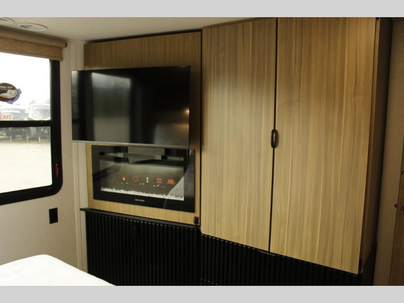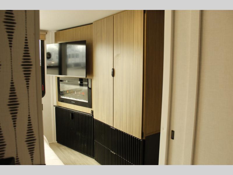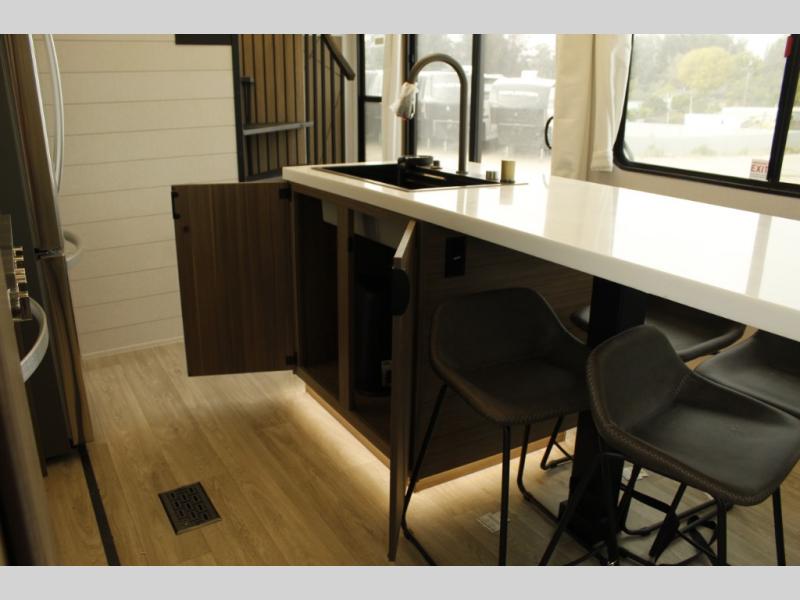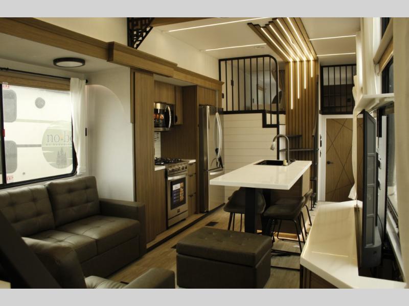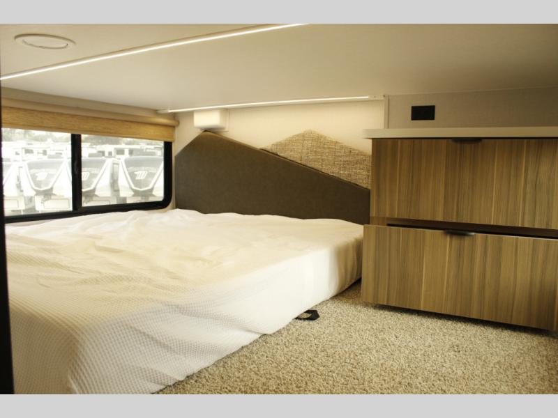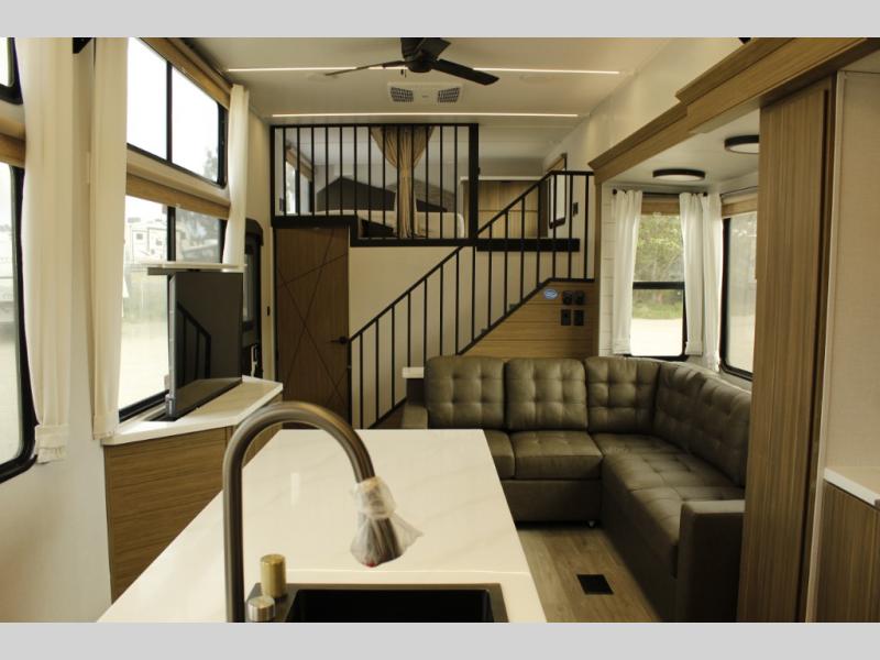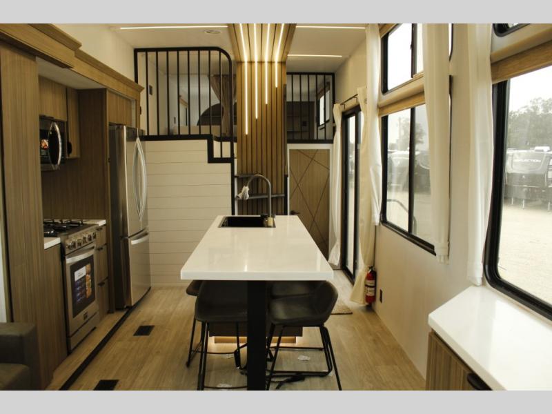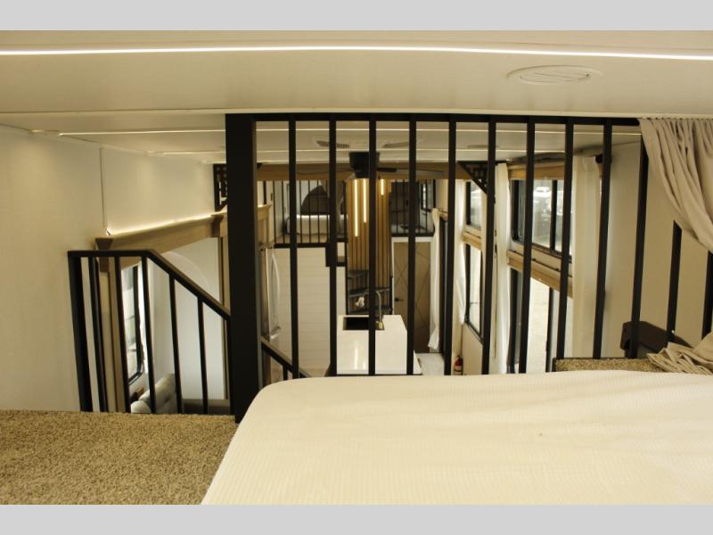 This thoughtfully designed 42ZEN model provides a blend of comfort and functionality. It features two lofts for added sleeping and living space, one includes a 62" x 74" Versa queen mattress and a dresser for storing clothes and essentials, while the second loft offers another Versa queen bed, plus a table with recessed footing, perfect for getting work or study done on the road. There is also a cabinet and shelf to keep everything organized. On the main floor, you'll find a large rear full bathroom, complete with a walk-in shower, linen closet, and washer/dryer prep, providing all the comforts of home. The main living area centers around a large sectional sofa with room for the whole crew, facing a fireplace and Televator TV, making it the perfect space to relax after a long day. The kitchen island also adds valuable prep space and also serves as a gathering spot with room for stools. Up front, the master bedroom features a king-size bed with Versa Tilt, a dresser, and its own private bathroom, offering convenience and privacy whenever you need it.