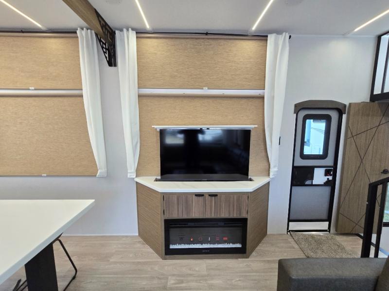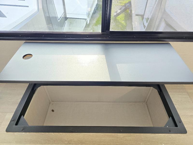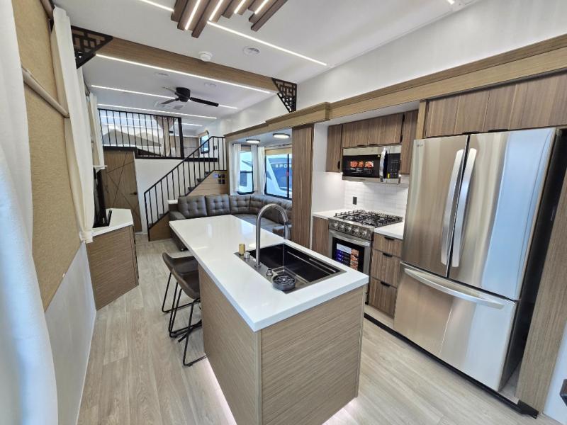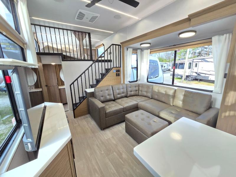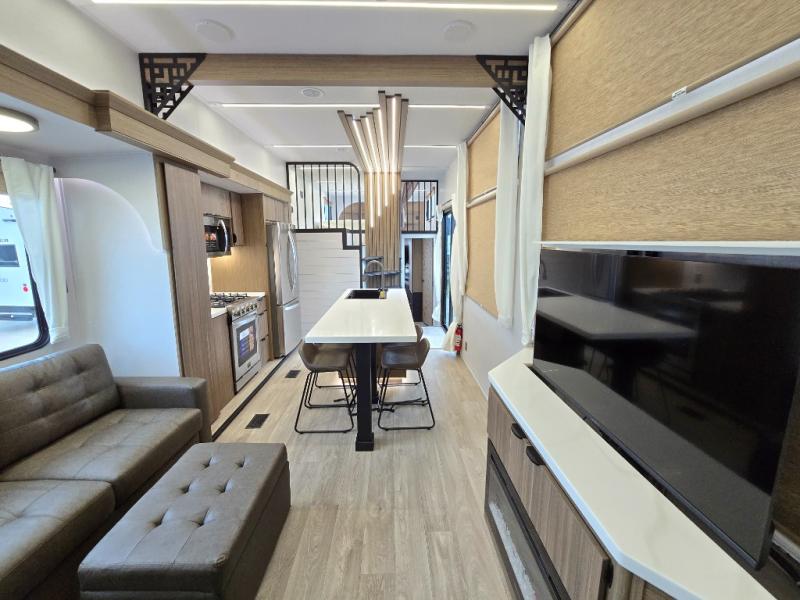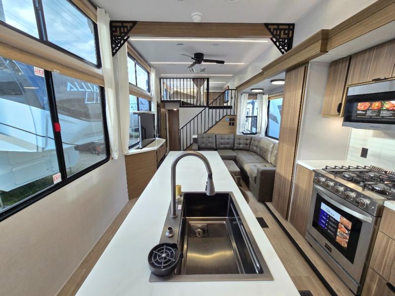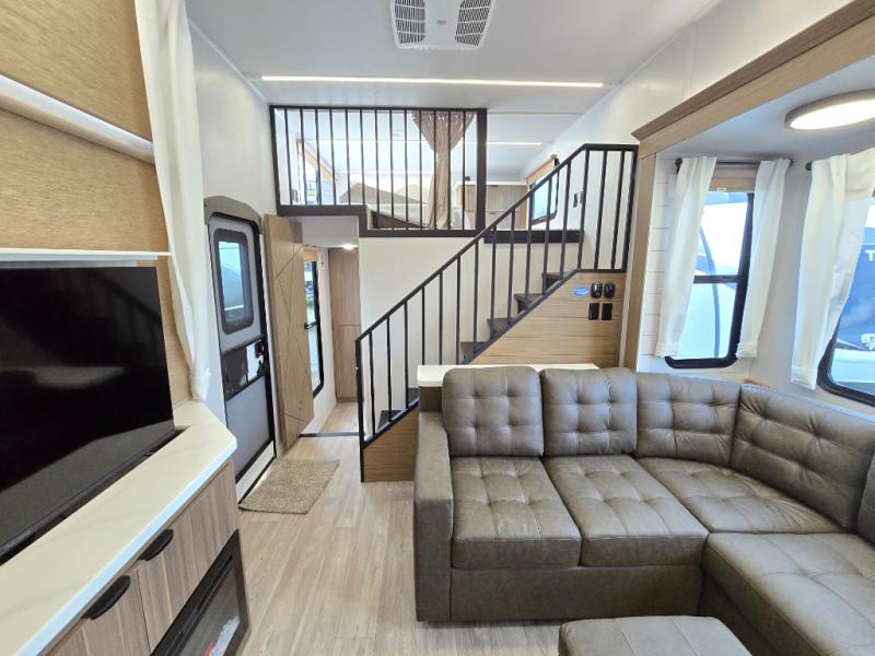 This thoughtfully designed 42ZEN model provides a blend of comfort and functionality. It features two lofts for added sleeping and living space, one includes a 62" x 74" Versa queen mattress and a dresser for storing clothes and essentials, while the second loft offers another Versa queen bed, plus a table with recessed footing, perfect for getting work or study done on the road. There is also a cabinet and shelf to keep everything organized. On the main floor, you'll find a large rear full bathroom, complete with a walk-in shower, linen closet, and washer/dryer prep, providing all the comforts of home. The main living area centers around a large sectional sofa with room for the whole crew, facing a fireplace and Televator TV, making it the perfect space to relax after a long day. The kitchen island also adds valuable prep space and also serves as a gathering spot with room for stools. Up front, the master bedroom features a king-size bed with Versa Tilt, a dresser, and its own private bathroom, offering convenience and privacy whenever you need it.