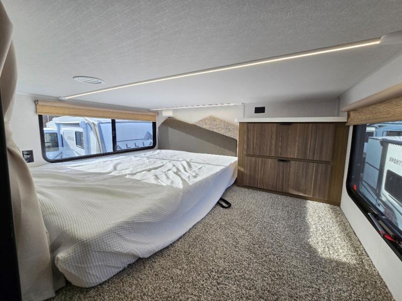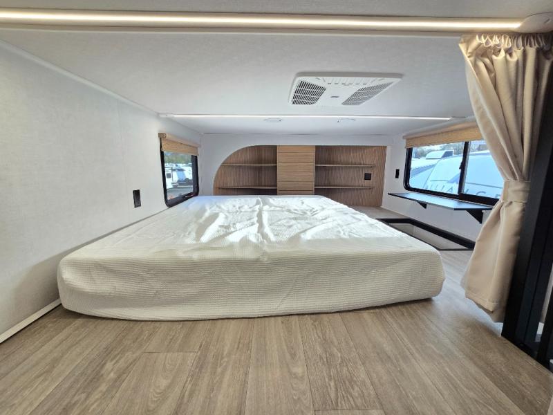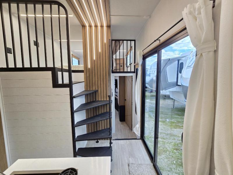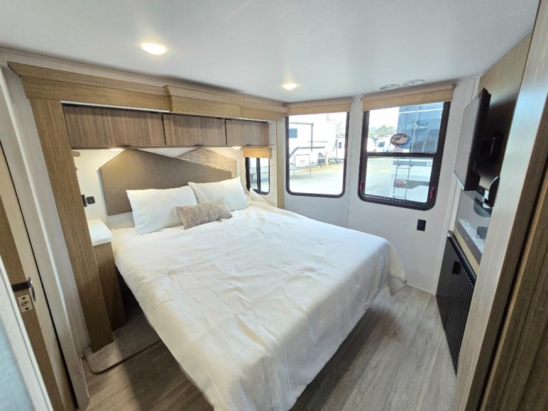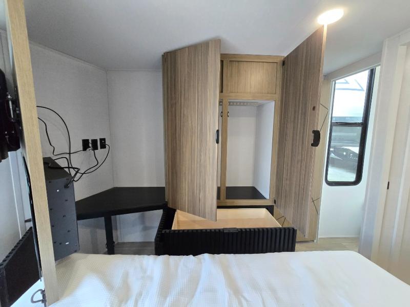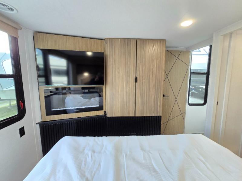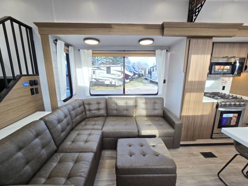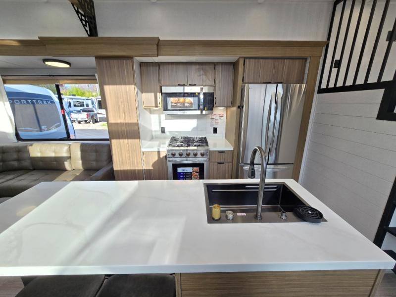 This thoughtfully designed 42ZEN model provides a blend of comfort and functionality. It features two lofts for added sleeping and living space, one includes a 62" x 74" Versa queen mattress and a dresser for storing clothes and essentials, while the second loft offers another Versa queen bed, plus a table with recessed footing, perfect for getting work or study done on the road. There is also a cabinet and shelf to keep everything organized. On the main floor, you'll find a large rear full bathroom, complete with a walk-in shower, linen closet, and washer/dryer prep, providing all the comforts of home. The main living area centers around a large sectional sofa with room for the whole crew, facing a fireplace and Televator TV, making it the perfect space to relax after a long day. The kitchen island also adds valuable prep space and also serves as a gathering spot with room for stools. Up front, the master bedroom features a king-size bed with Versa Tilt, a dresser, and its own private bathroom, offering convenience and privacy whenever you need it.
