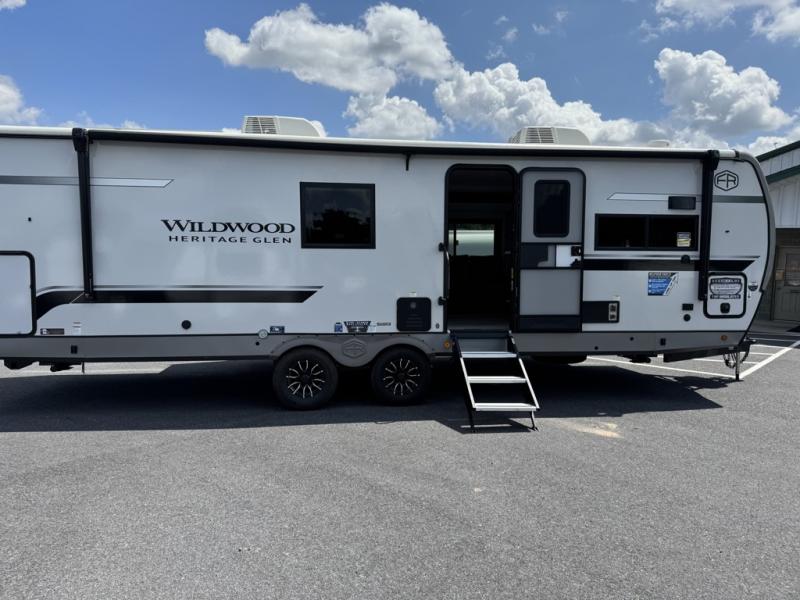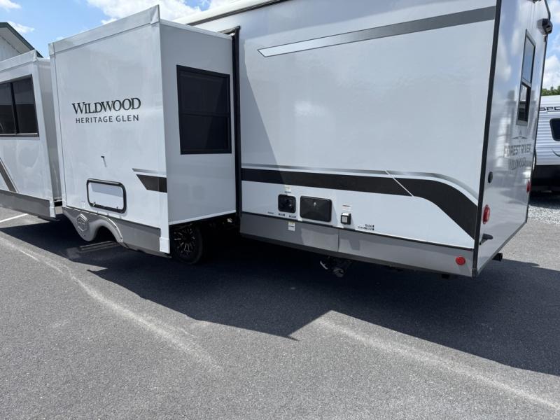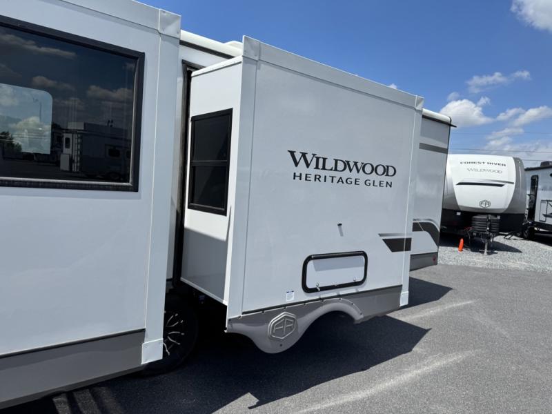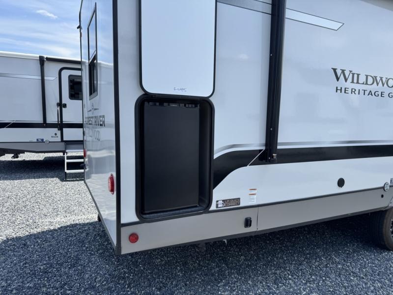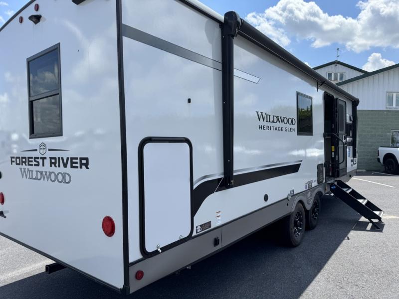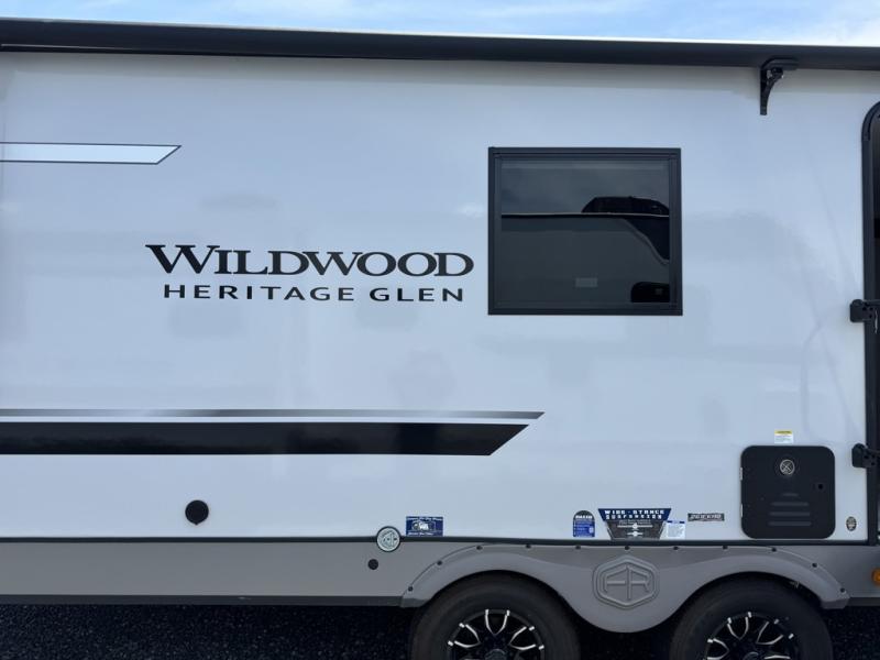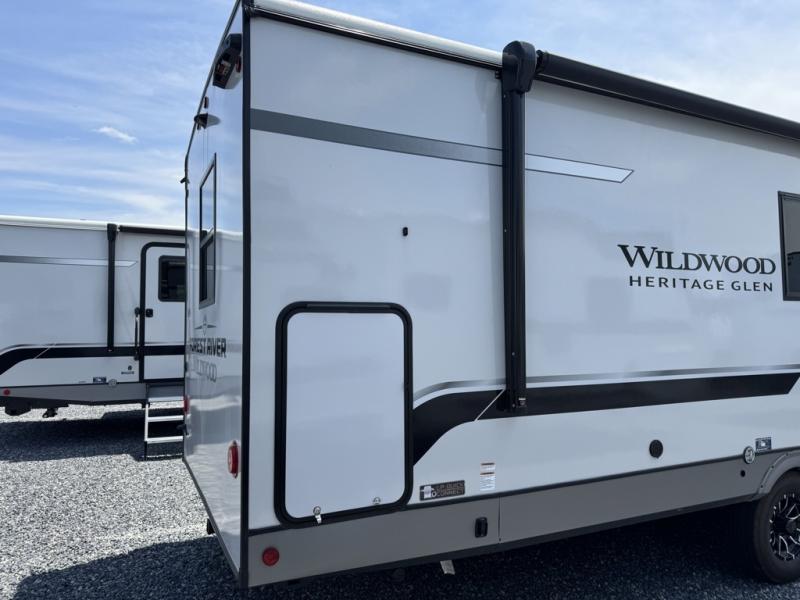 With any Wildwood Heritage Glen travel trailer by Forest River, the quality construction, attention to detail and design along with a bright and welcoming interior allows you to relax in comfort with conveniences while exploring outdoors. Each model includes a WeatherShield one piece fiberglass roof, Maxxis radial tires, and an enclosed underbelly with 12V tank heaters on all holding tanks for added protection. You will appreciate the on-demand tankless water heater, along with the 15K BTU Quite Cool A/C and 50 Amp service with a brace for a second A/C. There is an outside shower with hot and cold water, solar prep, a power tongue jack, plus many more exterior conveniences. Head inside to enjoy matte gold hardware, wood door casings in place of plastic door casings, and full length barreled ceilings for additional head room.