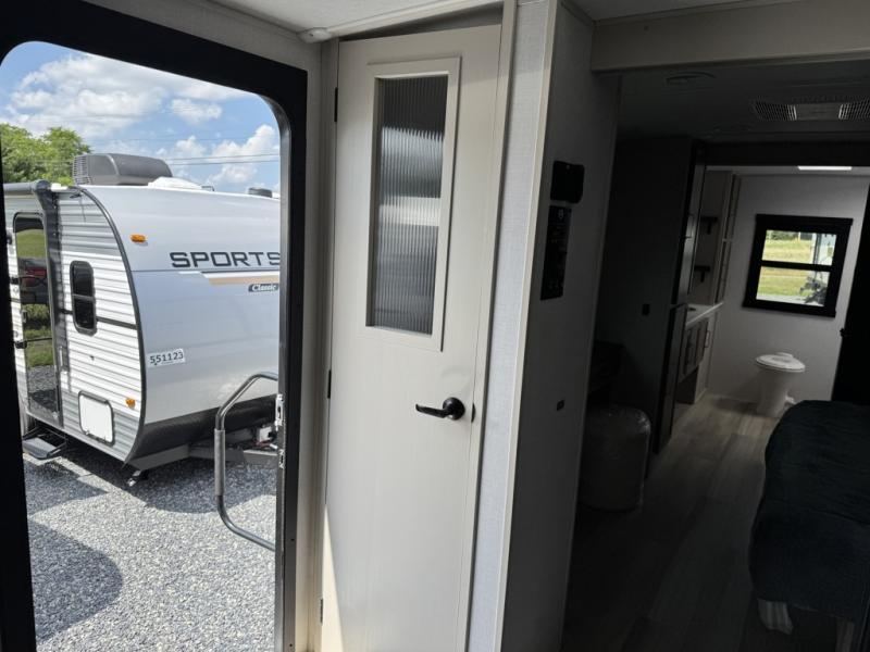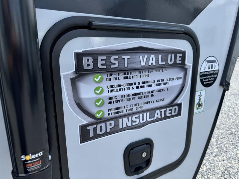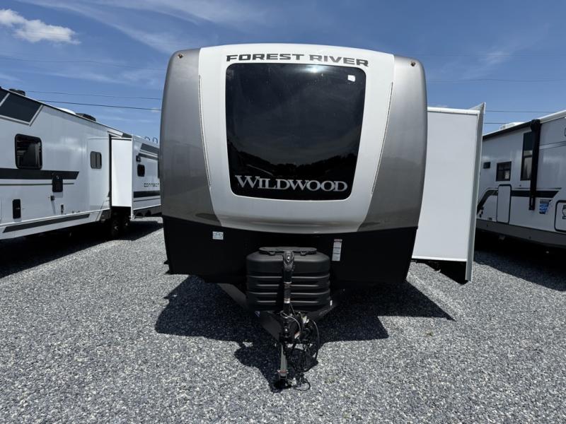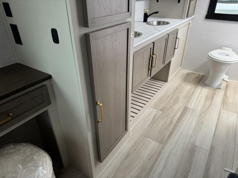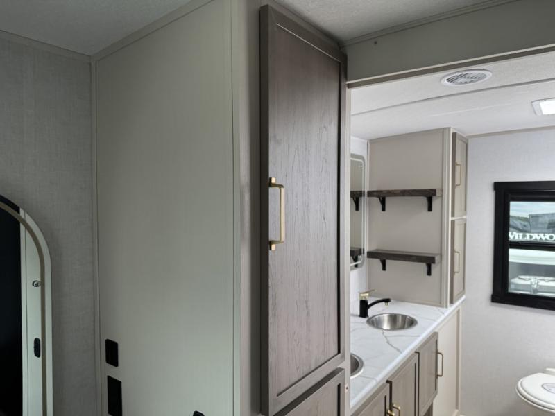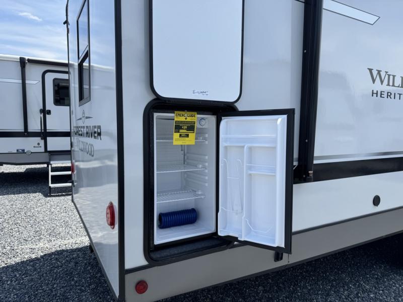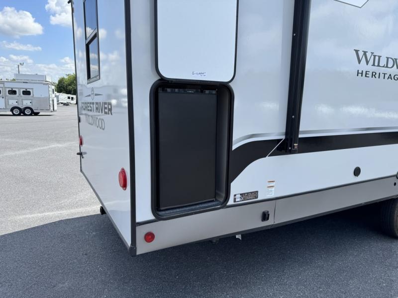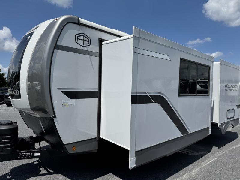 With any Wildwood Heritage Glen travel trailer by Forest River, the quality construction, attention to detail and design along with a bright and welcoming interior allows you to relax in comfort with conveniences while exploring outdoors. Each model includes a WeatherShield one piece fiberglass roof, Maxxis radial tires, and an enclosed underbelly with 12V tank heaters on all holding tanks for added protection. You will appreciate the on-demand tankless water heater, along with the 15K BTU Quite Cool A/C and 50 Amp service with a brace for a second A/C. There is an outside shower with hot and cold water, solar prep, a power tongue jack, plus many more exterior conveniences. Head inside to enjoy matte gold hardware, wood door casings in place of plastic door casings, and full length barreled ceilings for additional head room.