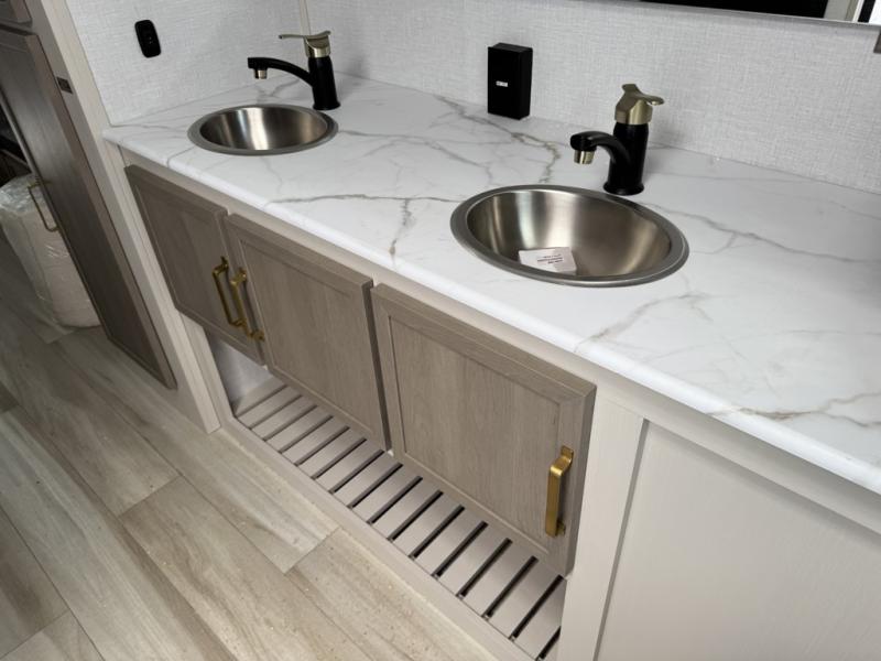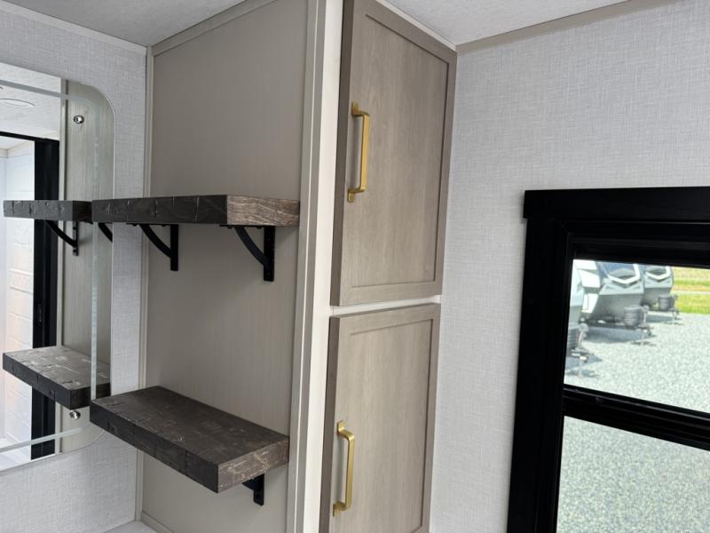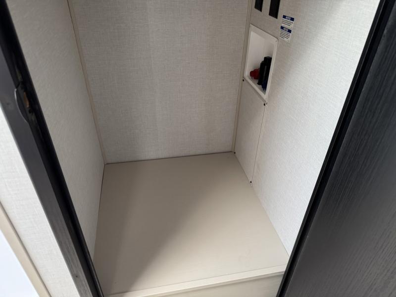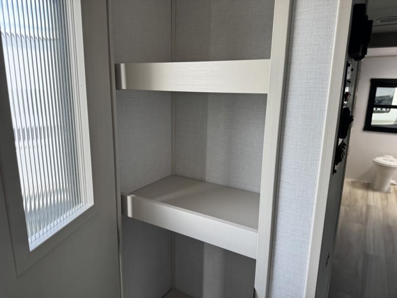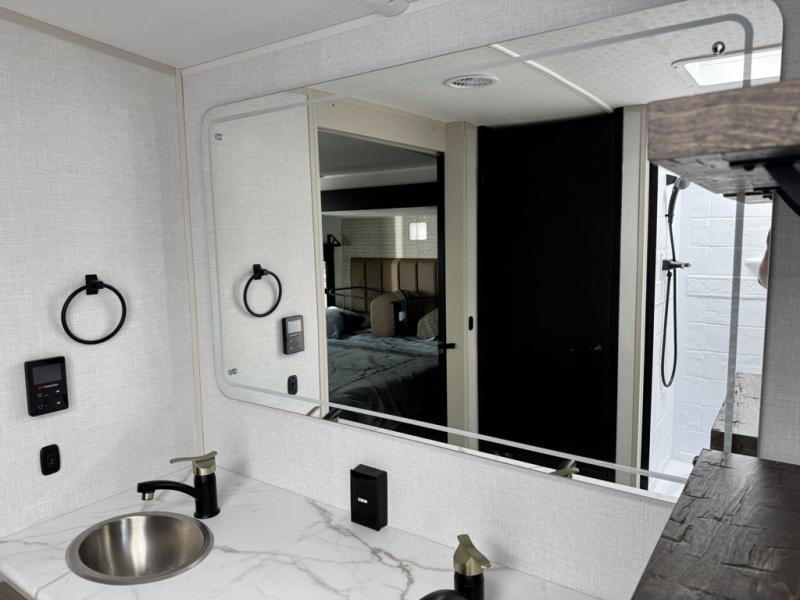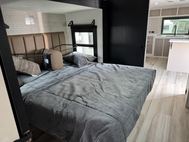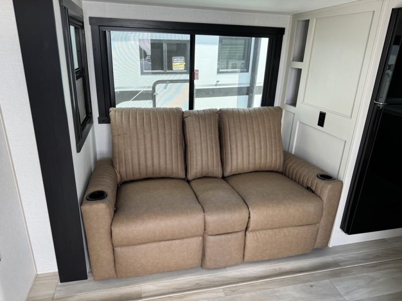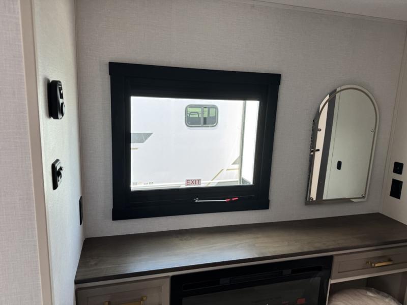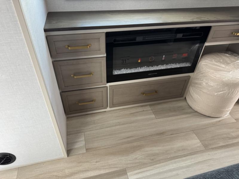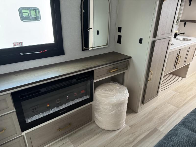 You'll love every minute spent in this double slide out, couple's trailer! You can wake up refreshed each day on your king bed, and enjoy great outdoor views with the bedroom panoramic window. There is also a dresser with a fireplace for a more cozy feel, and the full rear bath includes dual bath sinks plus a walk-in shower to freshen up in. Washer and dryer connections are also located here so you can choose to add those appliances if you wish. The main living area includes a 67" theater seat, no carpet for easy cleaning, and ample counter space in the front kitchen. There is also a bar top with two seats, and plenty of storage space for all your belongings.
