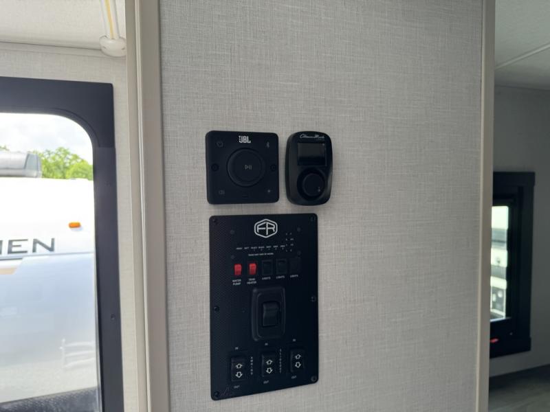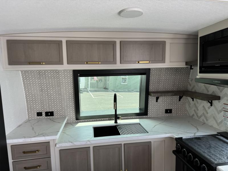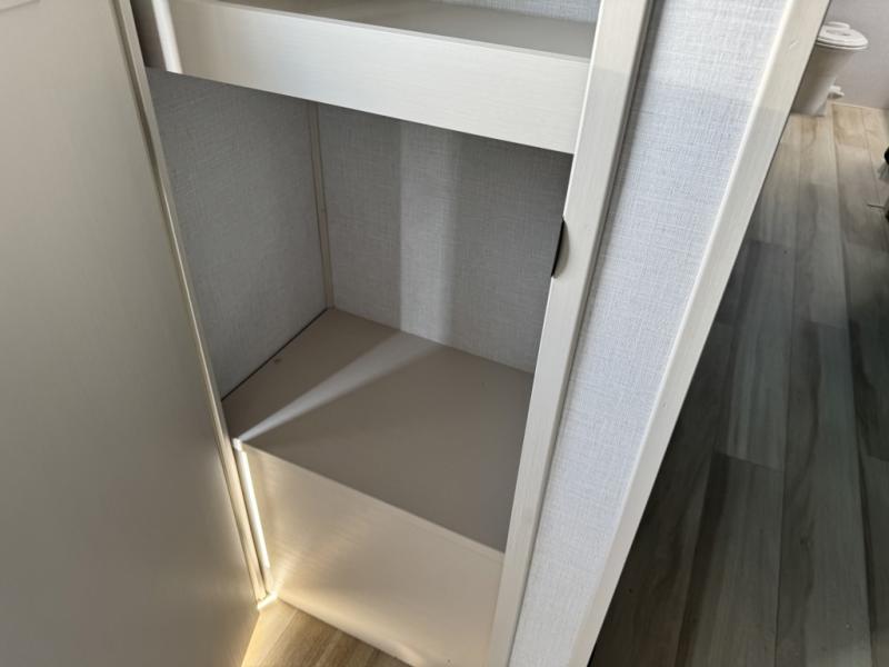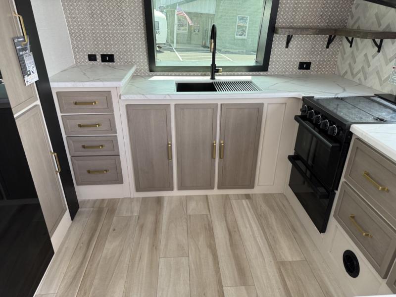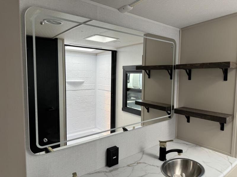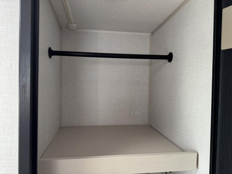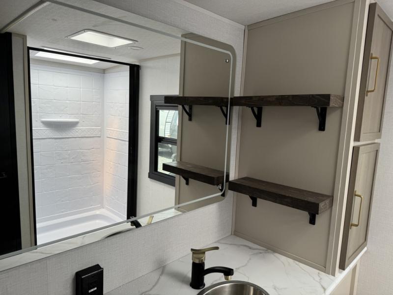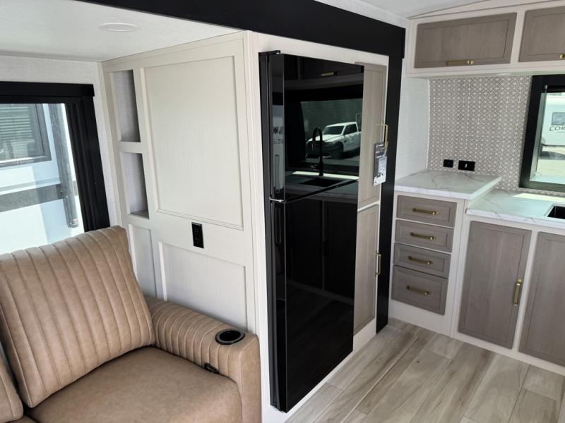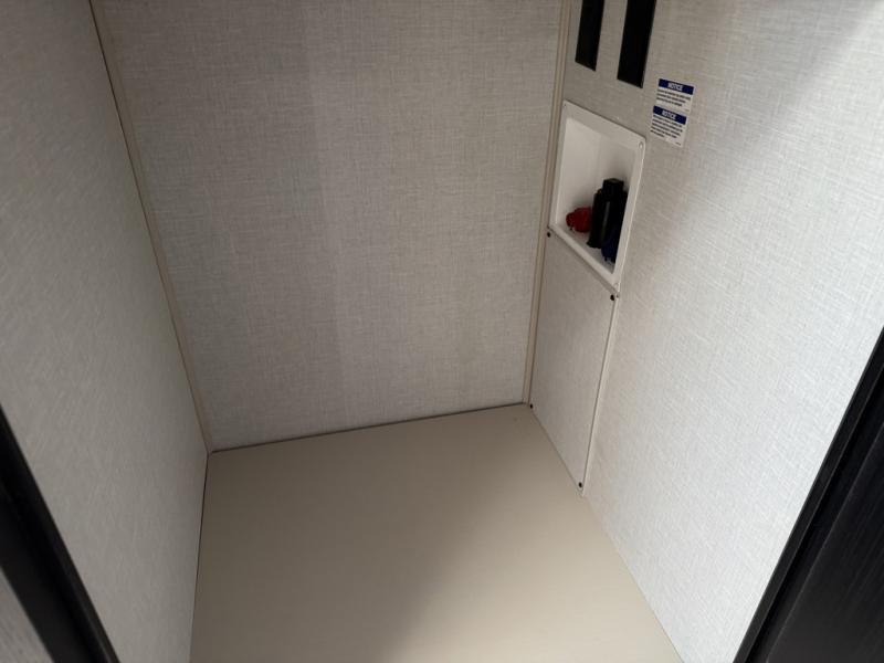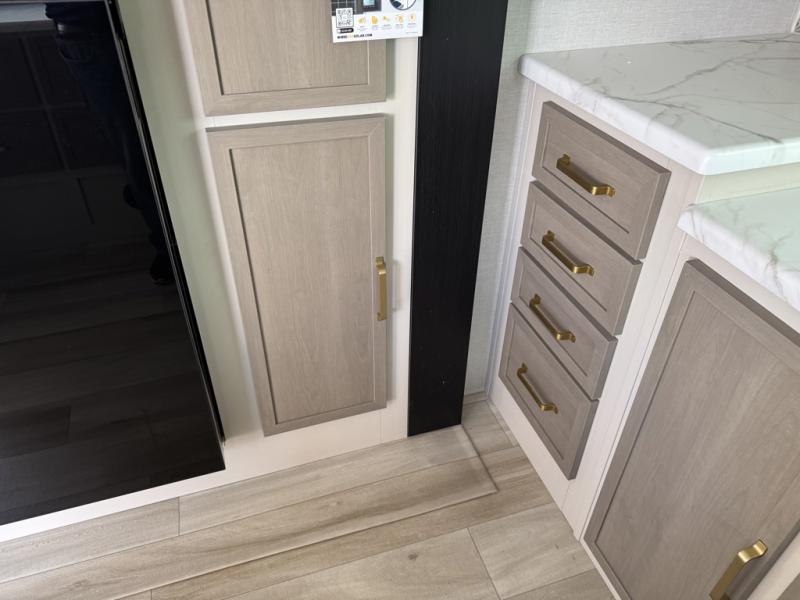 You'll love every minute spent in this double slide out, couple's trailer! You can wake up refreshed each day on your king bed, and enjoy great outdoor views with the bedroom panoramic window. There is also a dresser with a fireplace for a more cozy feel, and the full rear bath includes dual bath sinks plus a walk-in shower to freshen up in. Washer and dryer connections are also located here so you can choose to add those appliances if you wish. The main living area includes a 67" theater seat, no carpet for easy cleaning, and ample counter space in the front kitchen. There is also a bar top with two seats, and plenty of storage space for all your belongings.
