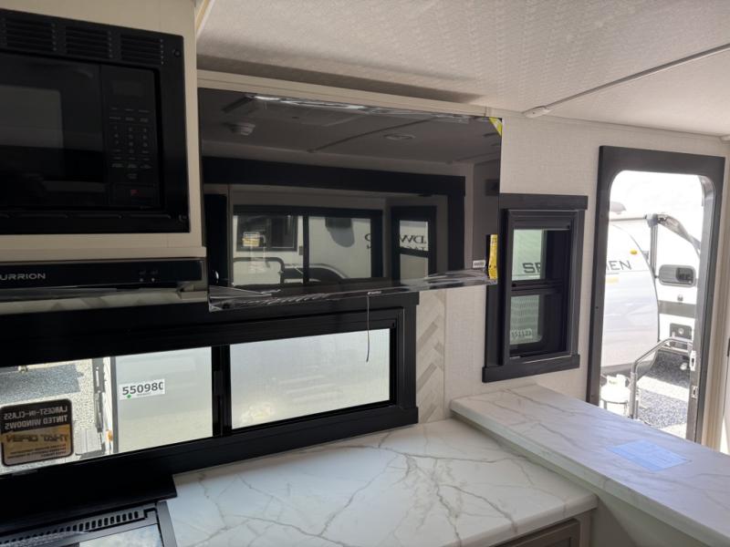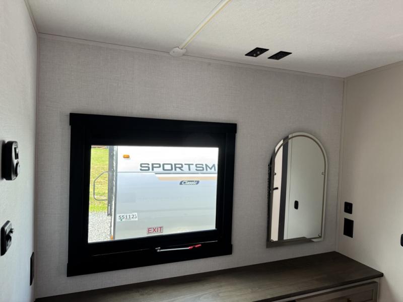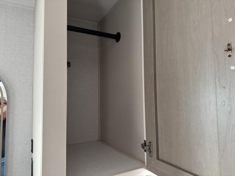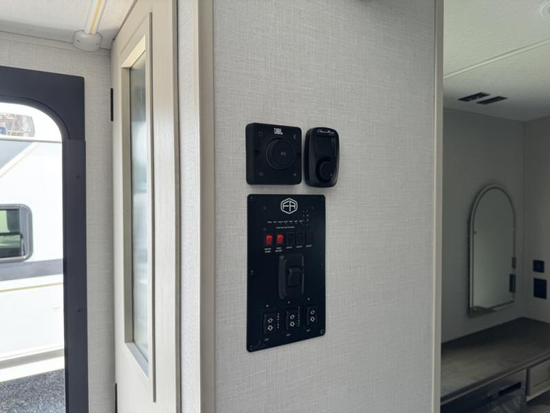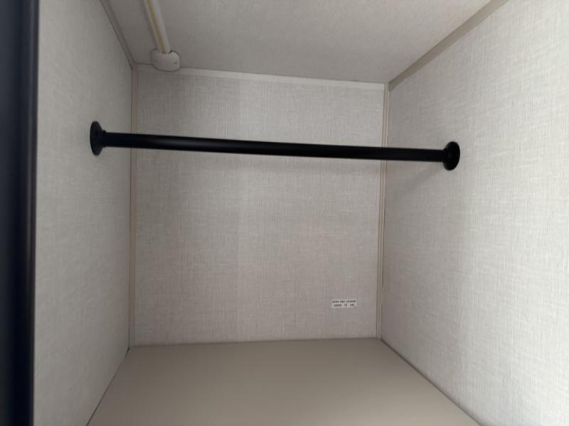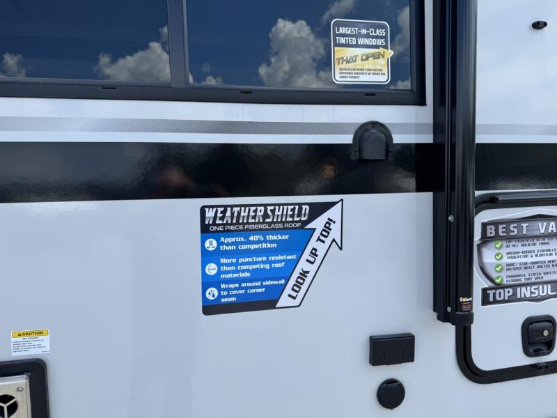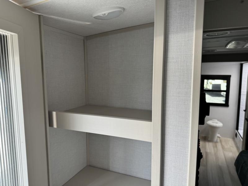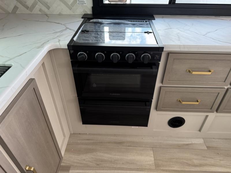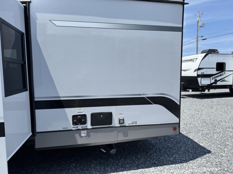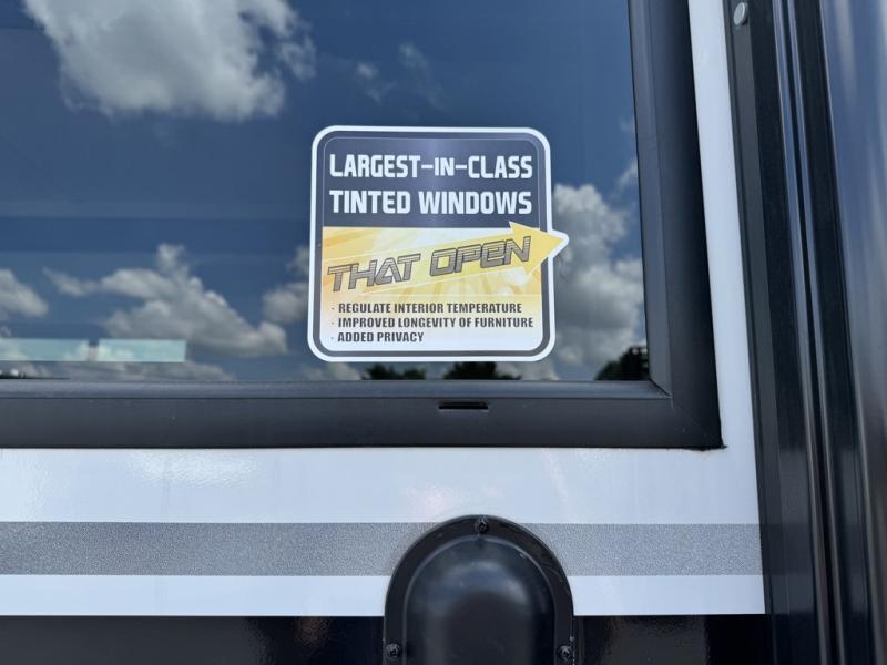 You'll love every minute spent in this double slide out, couple's trailer! You can wake up refreshed each day on your king bed, and enjoy great outdoor views with the bedroom panoramic window. There is also a dresser with a fireplace for a more cozy feel, and the full rear bath includes dual bath sinks plus a walk-in shower to freshen up in. Washer and dryer connections are also located here so you can choose to add those appliances if you wish. The main living area includes a 67" theater seat, no carpet for easy cleaning, and ample counter space in the front kitchen. There is also a bar top with two seats, and plenty of storage space for all your belongings.