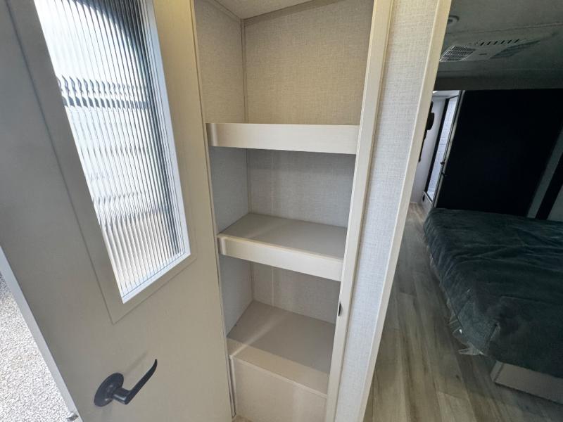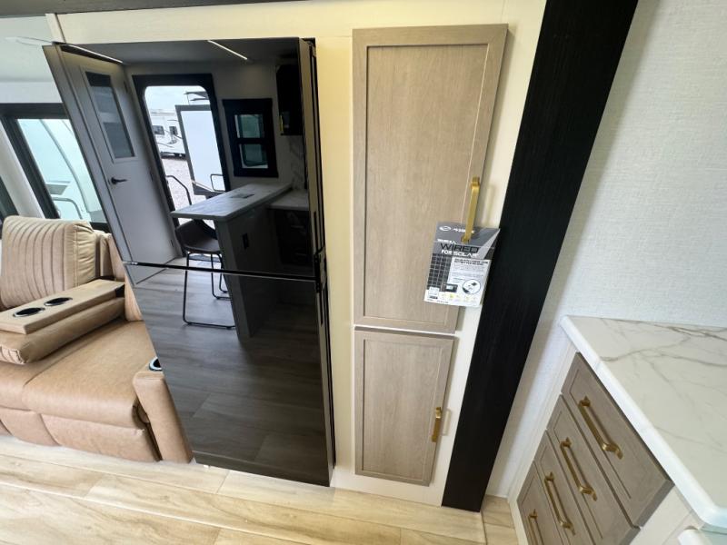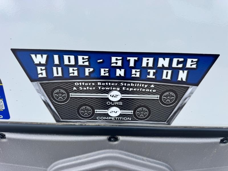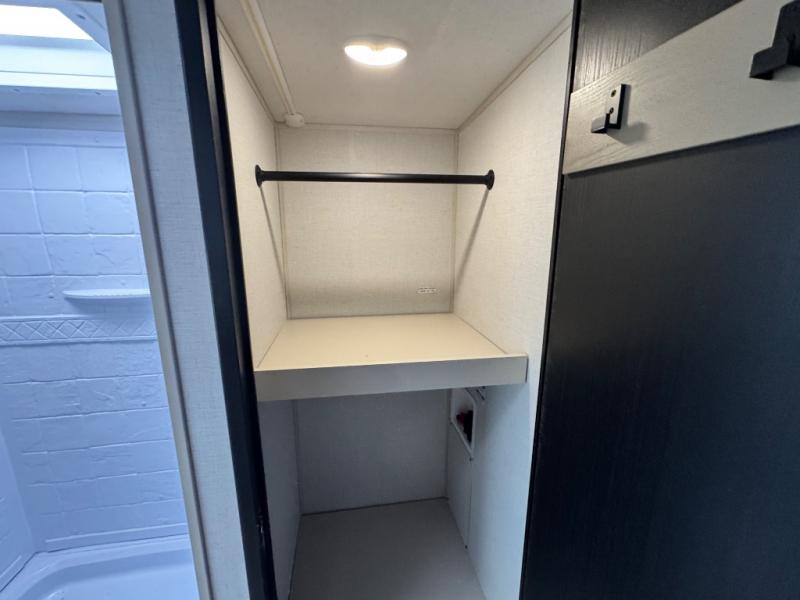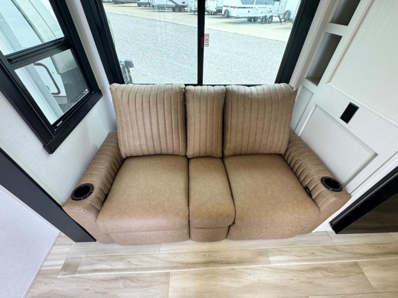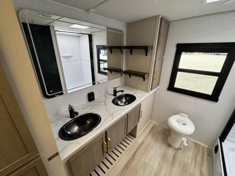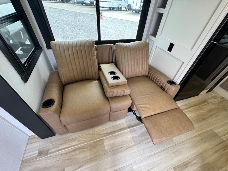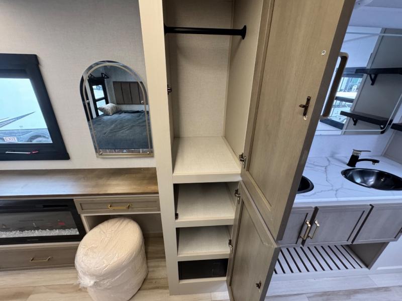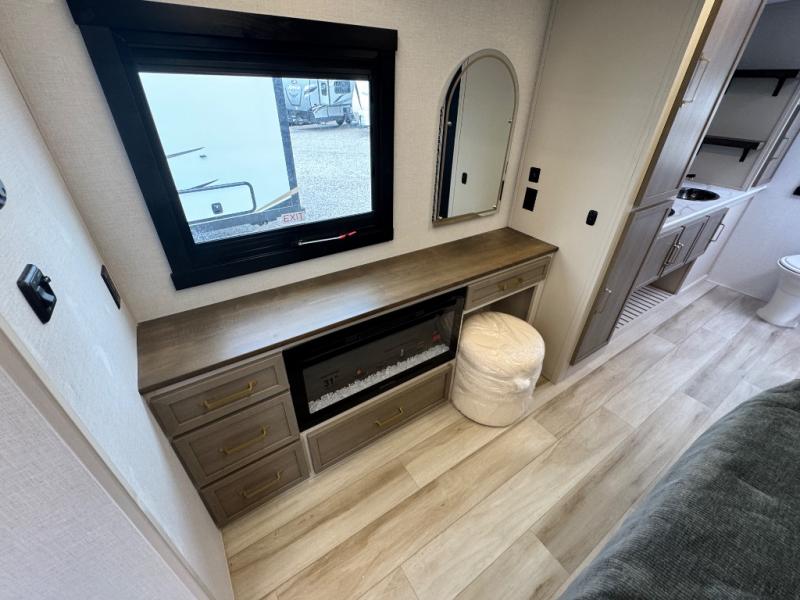 You'll love every minute spent in this double slide out, couple's trailer! You can wake up refreshed each day on your king bed, and enjoy great outdoor views with the bedroom panoramic window. There is also a dresser with a fireplace for a more cozy feel, and the full rear bath includes dual bath sinks plus a walk-in shower to freshen up in. Washer and dryer connections are also located here so you can choose to add those appliances if you wish. The main living area includes a 67" theater seat, no carpet for easy cleaning, and ample counter space in the front kitchen. There is also a bar top with two seats, and plenty of storage space for all your belongings.