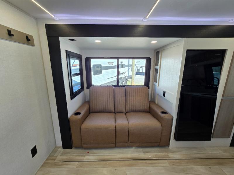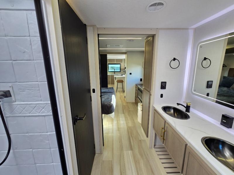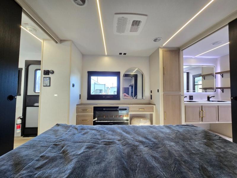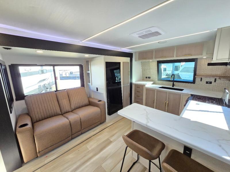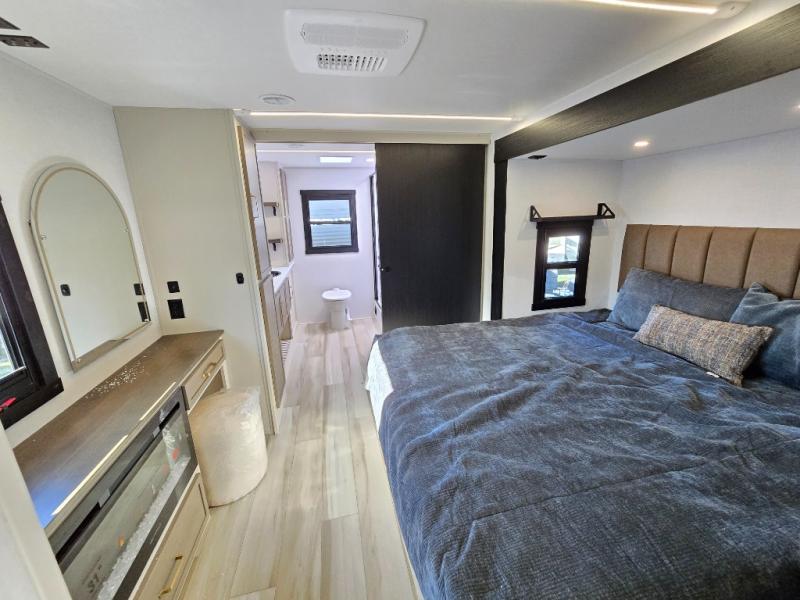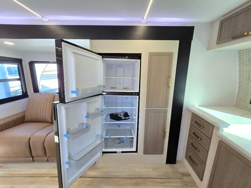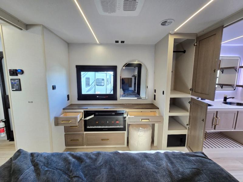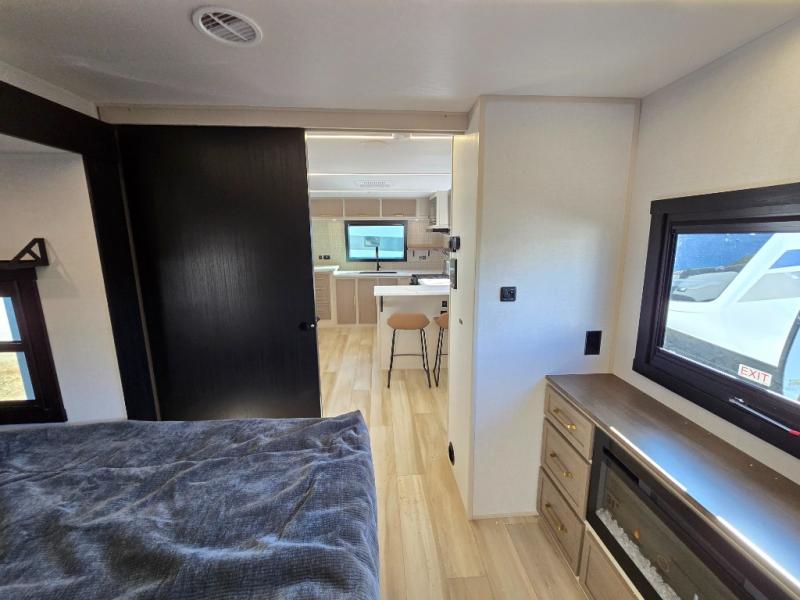 You'll love every minute spent in this double slide out, couple's trailer! You can wake up refreshed each day on your king bed, and enjoy great outdoor views with the bedroom panoramic window. There is also a dresser with a fireplace for a more cozy feel, and the full rear bath includes dual bath sinks plus a walk-in shower to freshen up in. Washer and dryer connections are also located here so you can choose to add those appliances if you wish. The main living area includes a 67" theater seat, no carpet for easy cleaning, and ample counter space in the front kitchen. There is also a bar top with two seats, and plenty of storage space for all your belongings.