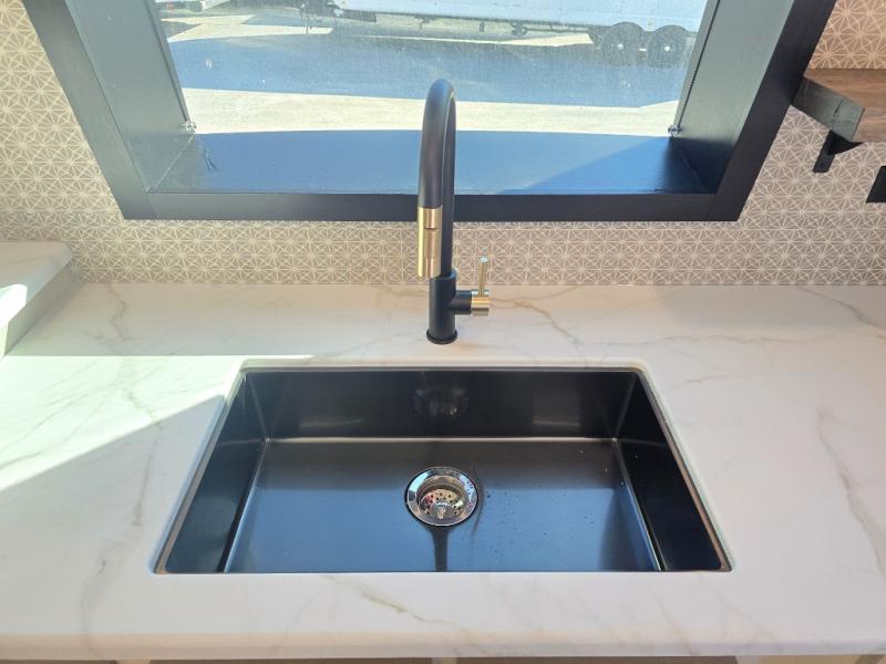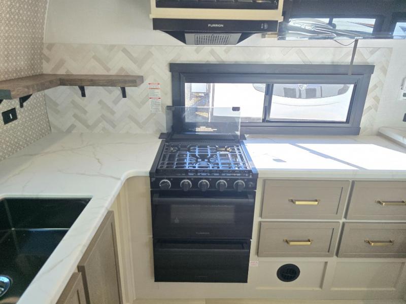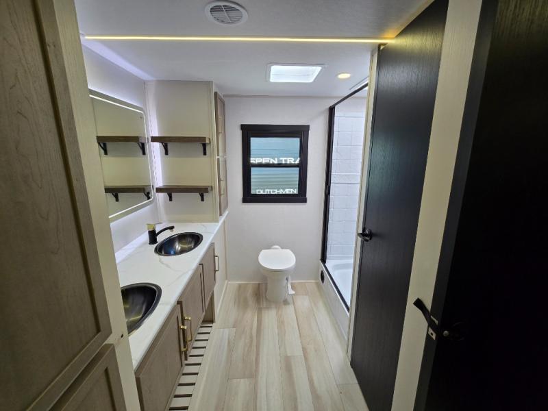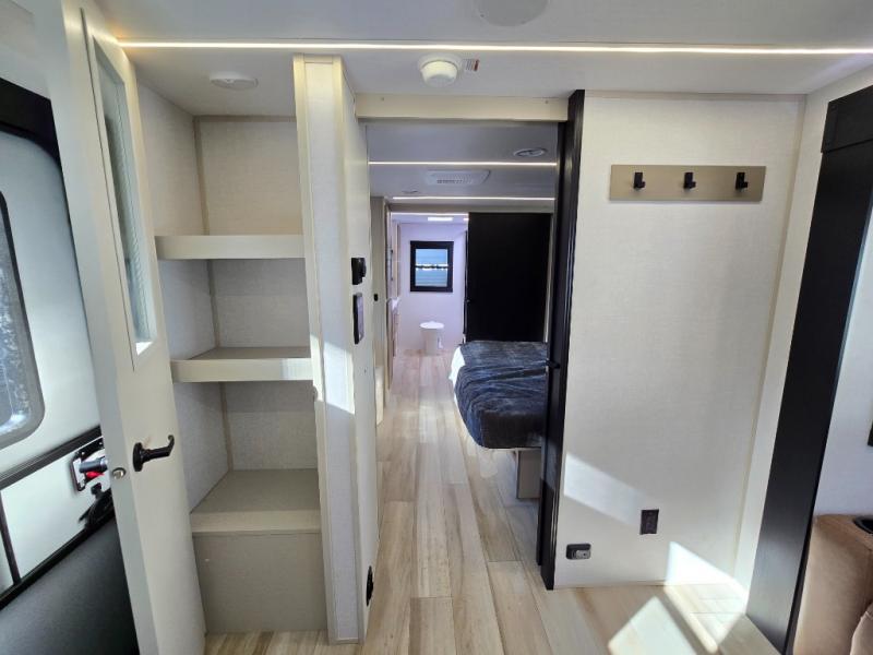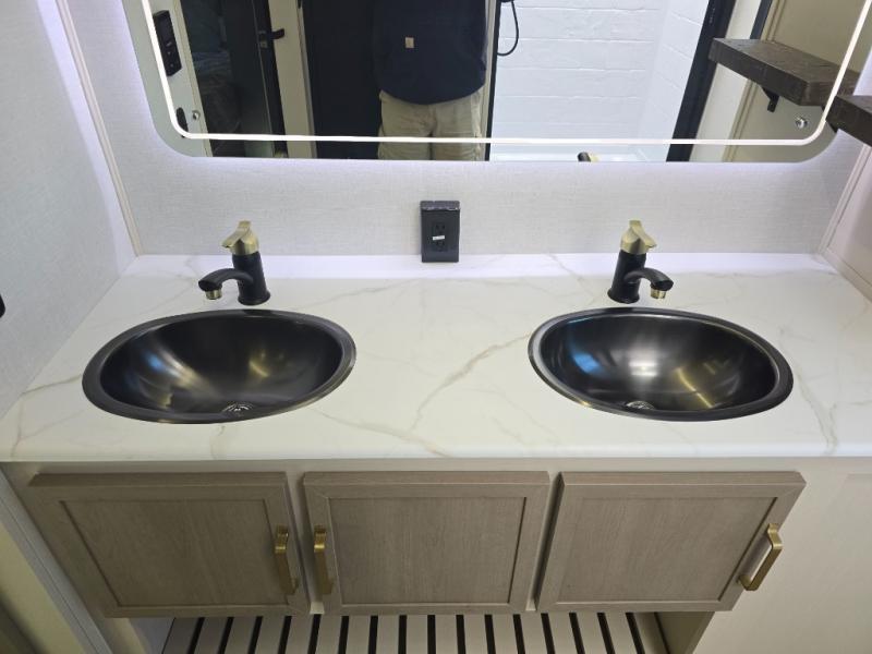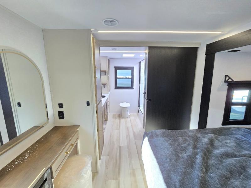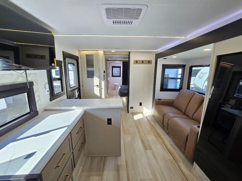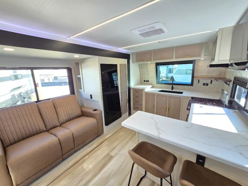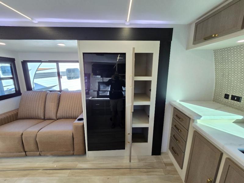 You'll love every minute spent in this double slide out, couple's trailer! You can wake up refreshed each day on your king bed, and enjoy great outdoor views with the bedroom panoramic window. There is also a dresser with a fireplace for a more cozy feel, and the full rear bath includes dual bath sinks plus a walk-in shower to freshen up in. Washer and dryer connections are also located here so you can choose to add those appliances if you wish. The main living area includes a 67" theater seat, no carpet for easy cleaning, and ample counter space in the front kitchen. There is also a bar top with two seats, and plenty of storage space for all your belongings.