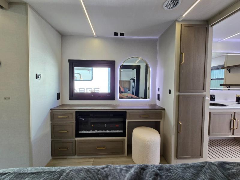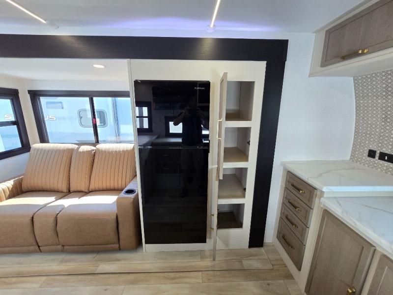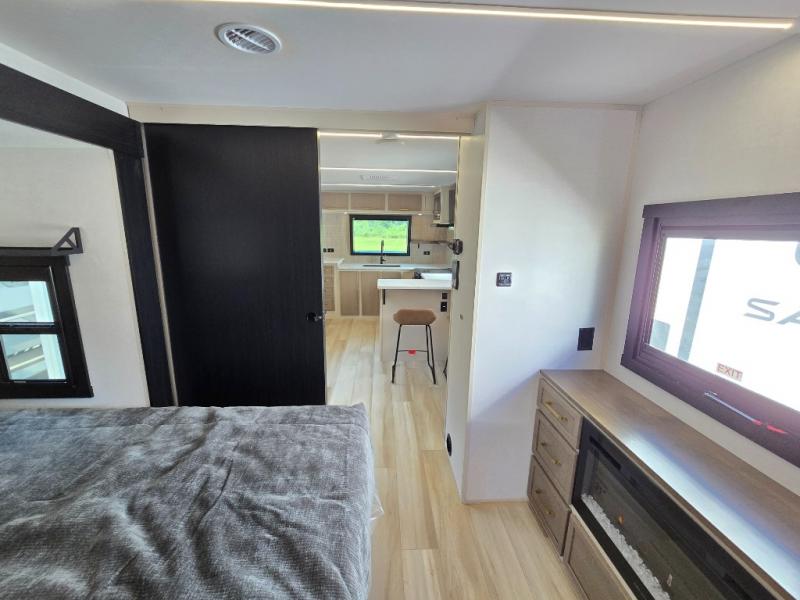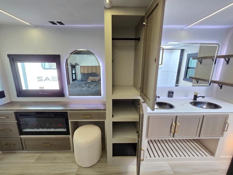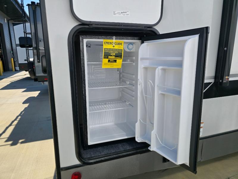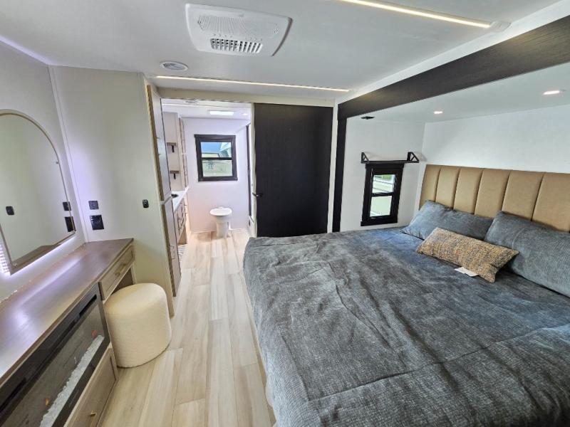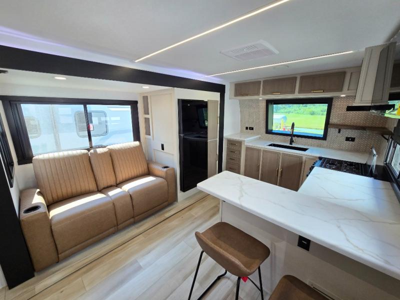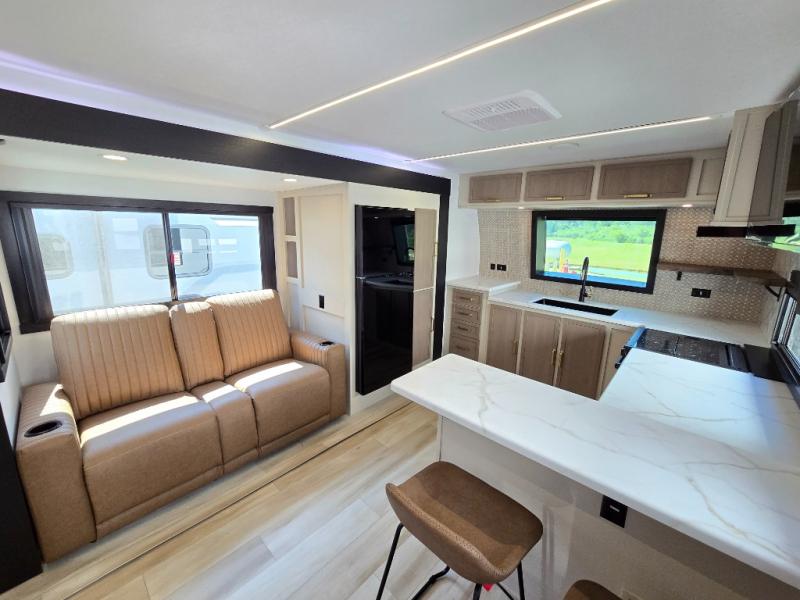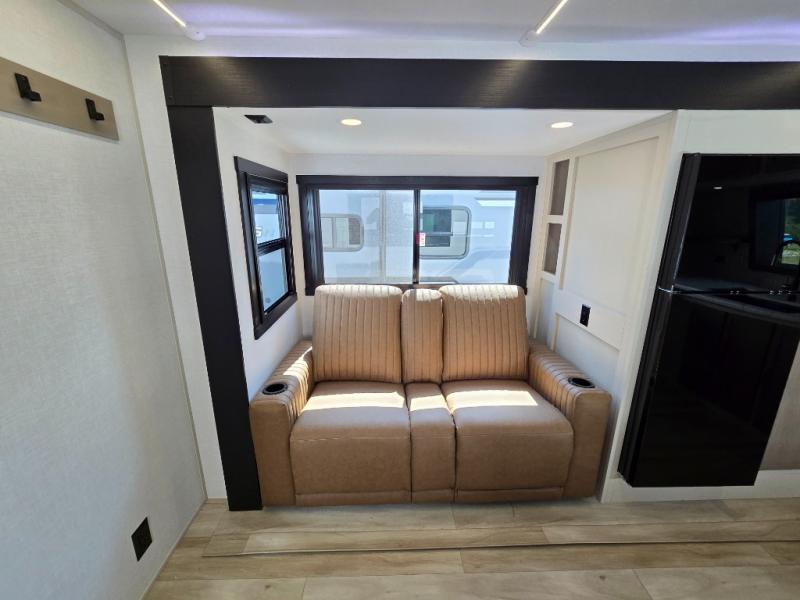 You'll love every minute spent in this double slide out, couple's trailer! You can wake up refreshed each day on your king bed, and enjoy great outdoor views with the bedroom panoramic window. There is also a dresser with a fireplace for a more cozy feel, and the full rear bath includes dual bath sinks plus a walk-in shower to freshen up in. Washer and dryer connections are also located here so you can choose to add those appliances if you wish. The main living area includes a 67" theater seat, no carpet for easy cleaning, and ample counter space in the front kitchen. There is also a bar top with two seats, and plenty of storage space for all your belongings.