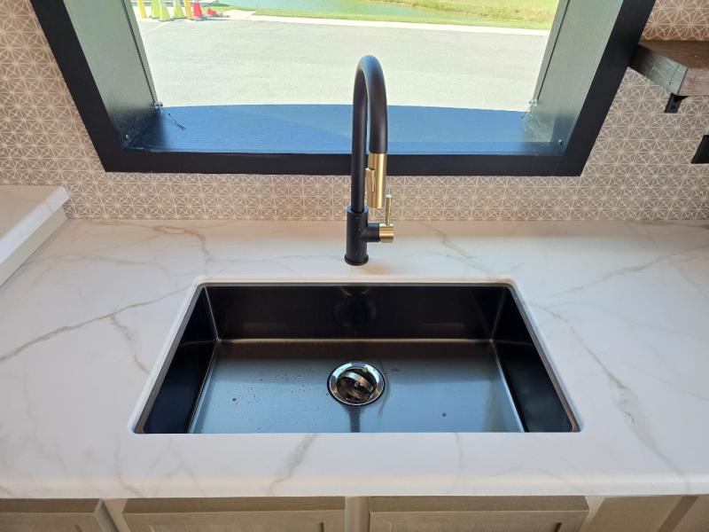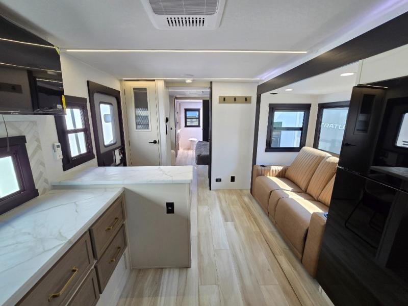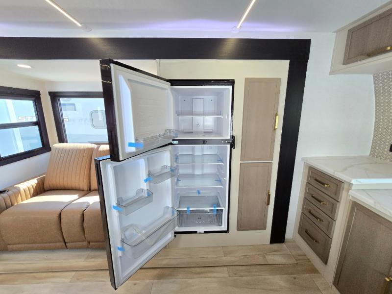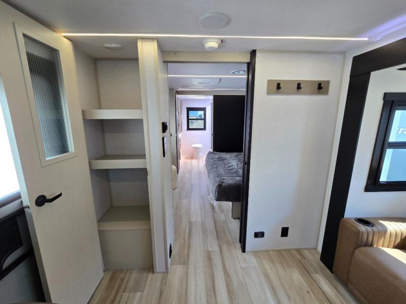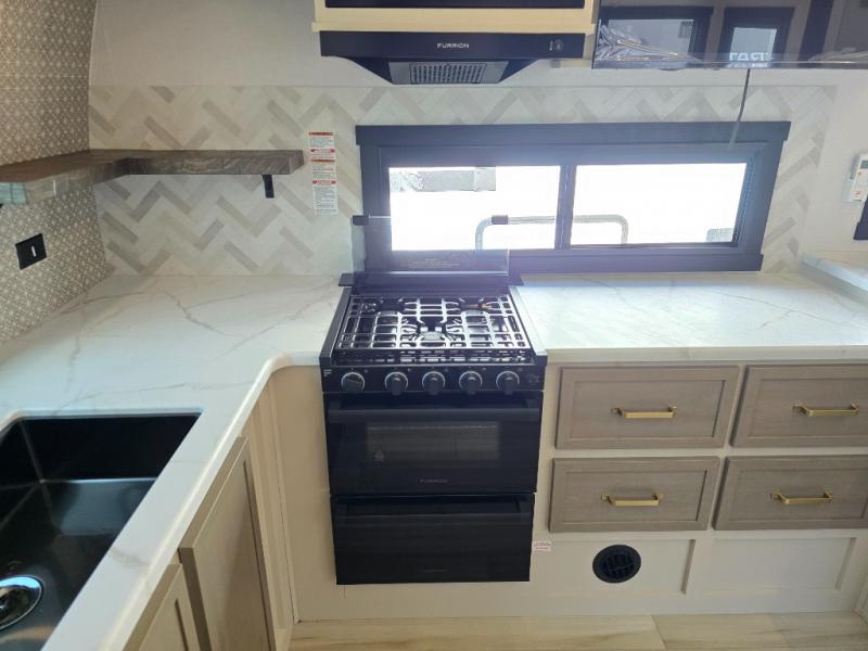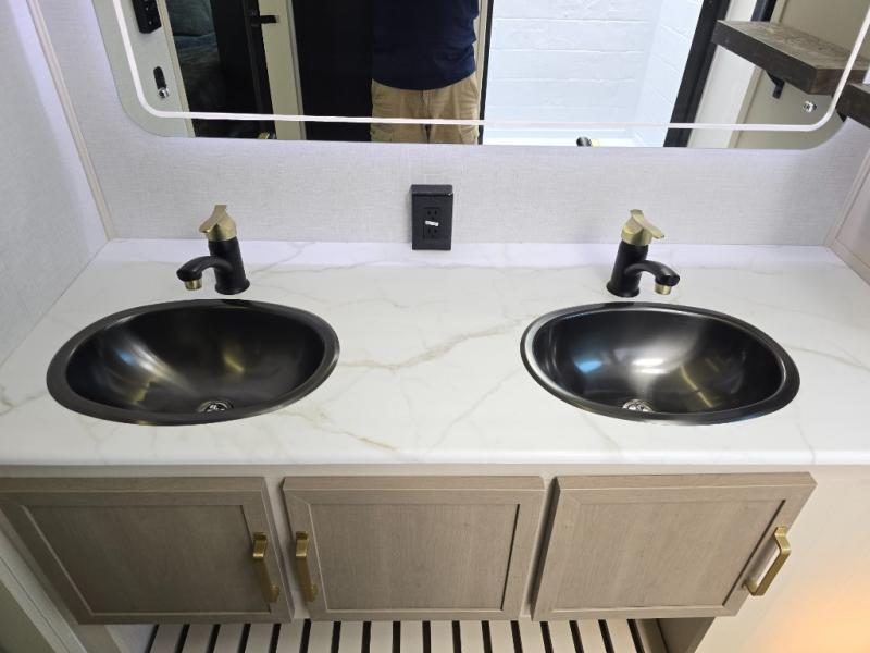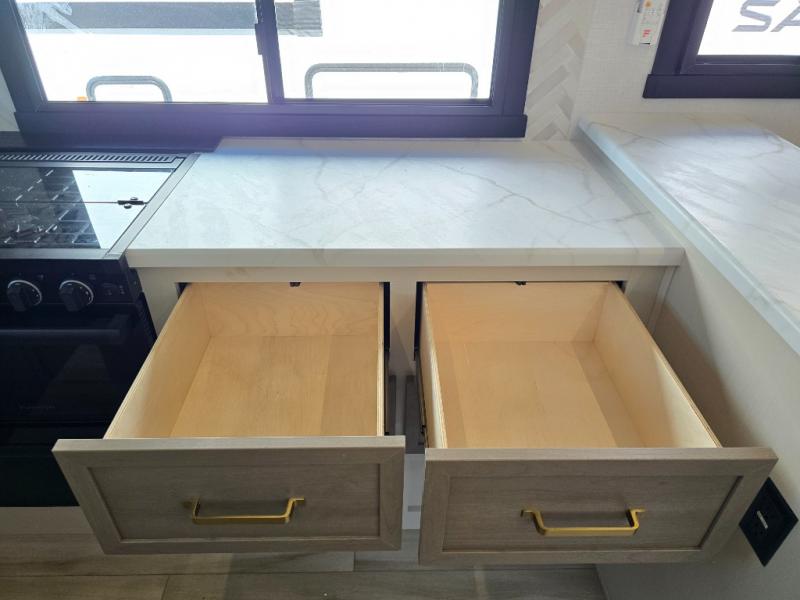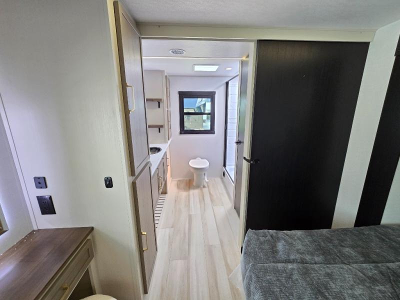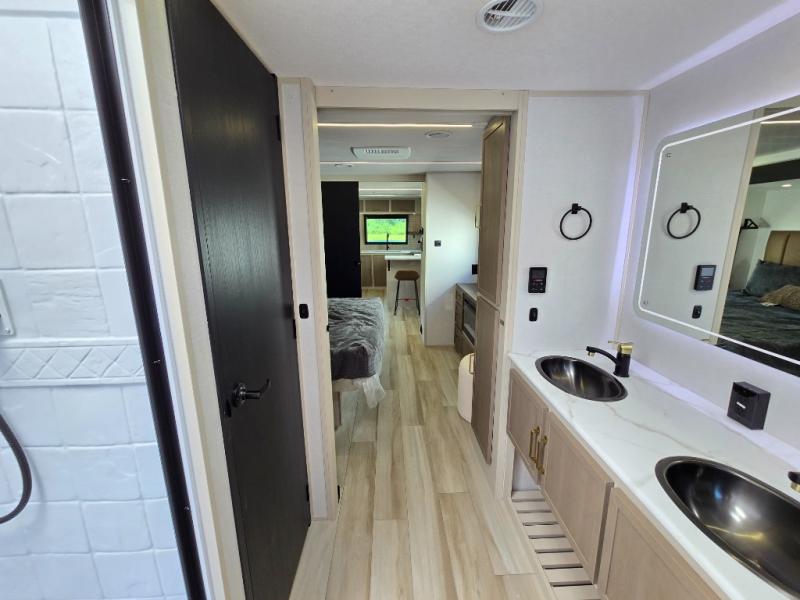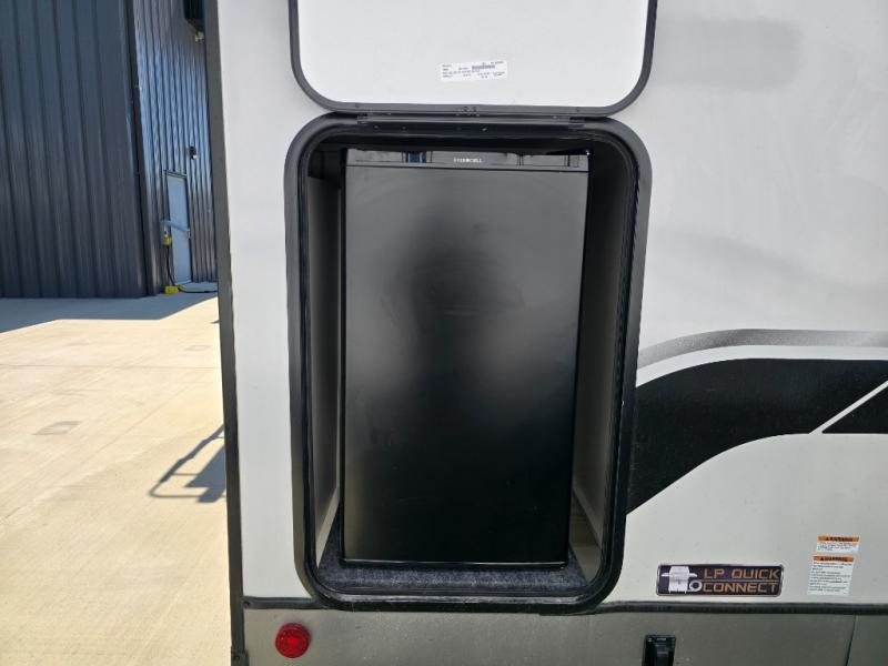 You'll love every minute spent in this double slide out, couple's trailer! You can wake up refreshed each day on your king bed, and enjoy great outdoor views with the bedroom panoramic window. There is also a dresser with a fireplace for a more cozy feel, and the full rear bath includes dual bath sinks plus a walk-in shower to freshen up in. Washer and dryer connections are also located here so you can choose to add those appliances if you wish. The main living area includes a 67" theater seat, no carpet for easy cleaning, and ample counter space in the front kitchen. There is also a bar top with two seats, and plenty of storage space for all your belongings.