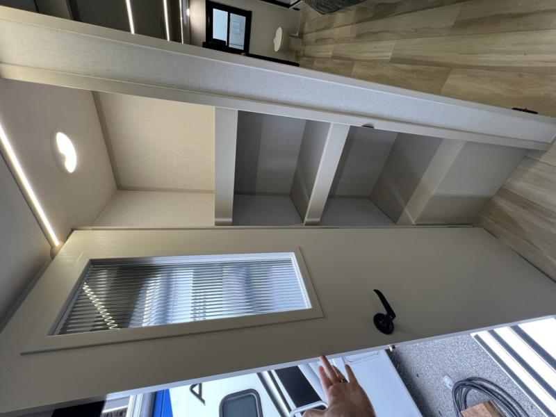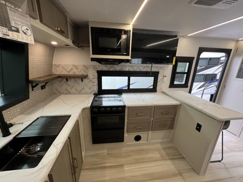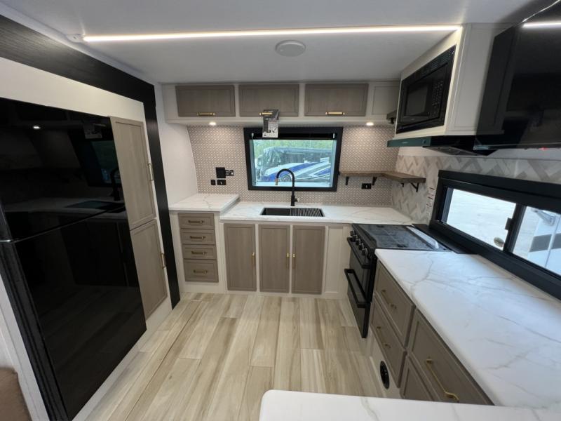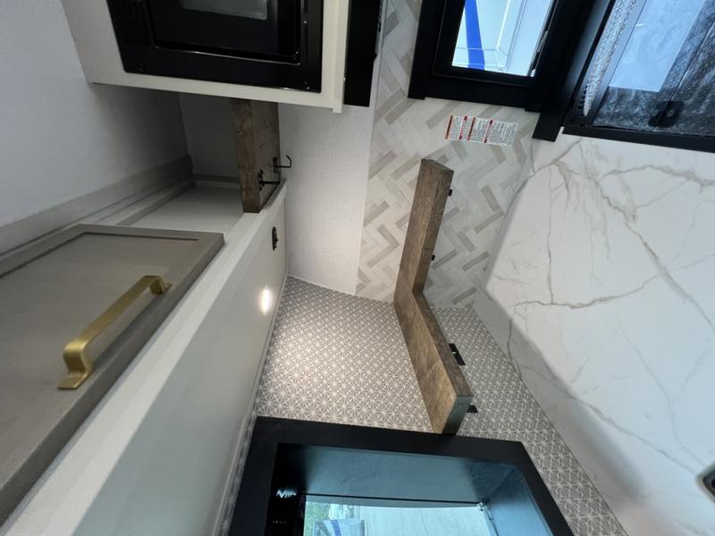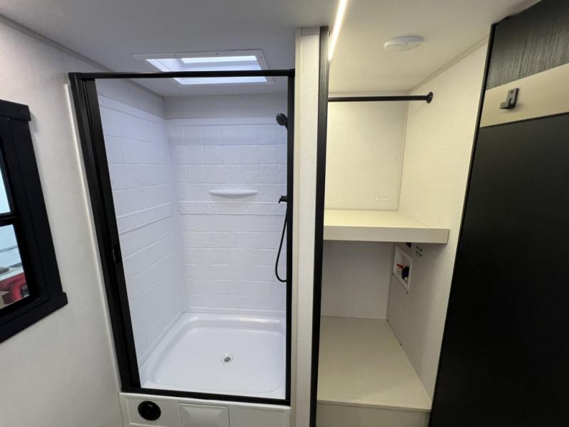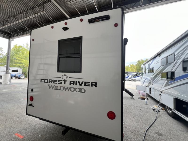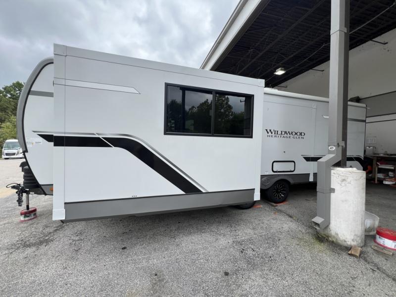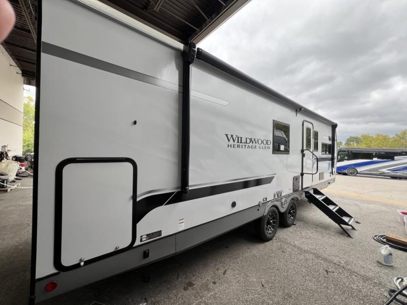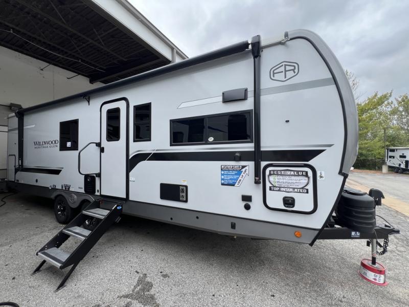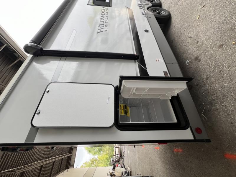 With any Wildwood Heritage Glen travel trailer by Forest River, the quality construction, attention to detail and design along with a bright and welcoming interior allows you to relax in comfort. Each model includes a WeatherShield one piece fiberglass roof, nitrogen-filled radial tires, and an enclosed underbelly with 12V tank heaters on all holding tanks for added protection. You will appreciate the on-demand tankless water heater, along with power stabilizer and tongue jacks, and an extra-large pass-thru storage with slam latch baggage doors. Head inside to enjoy matte gold hardware, wood door casings in place of plastic door casings, and an ultimate interior lighting upgrade with 4k puck/strip lights and a stylish LED back-lit bath mirror!