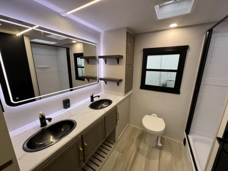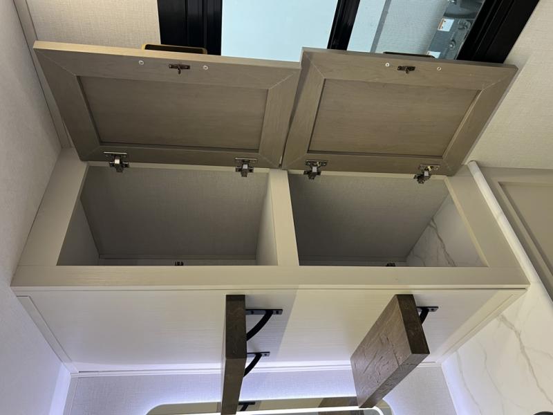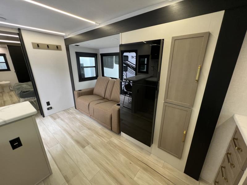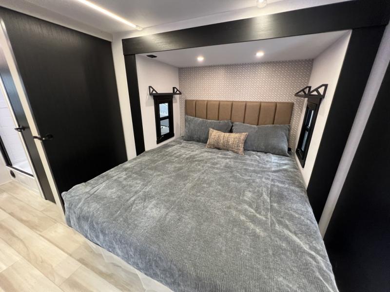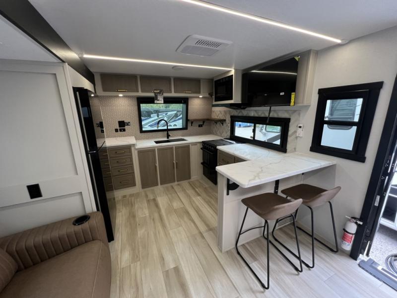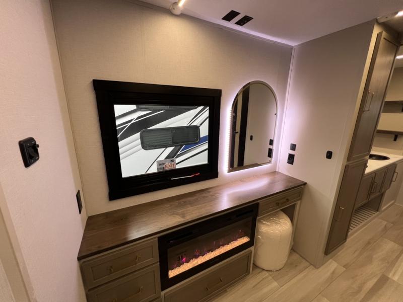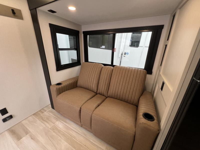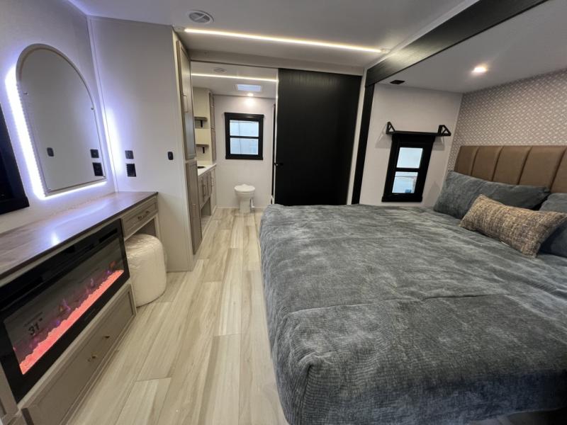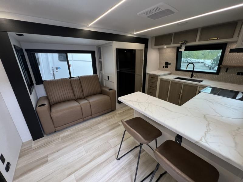 You'll love every minute spent in this double slide out, couple's trailer! You can wake up refreshed each day on your king bed, and enjoy great outdoor views with the bedroom panoramic window. There is also a dresser with a fireplace for a more cozy feel, and the full rear bath includes dual bath sinks plus a walk-in shower to freshen up in. Washer and dryer connections are also located here so you can choose to add those appliances if you wish. The main living area includes a 67" theater seat, no carpet for easy cleaning, and ample counter space in the front kitchen. There is also a bar top with two seats, and plenty of storage space for all your belongings.