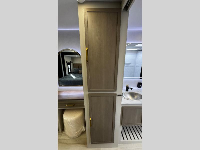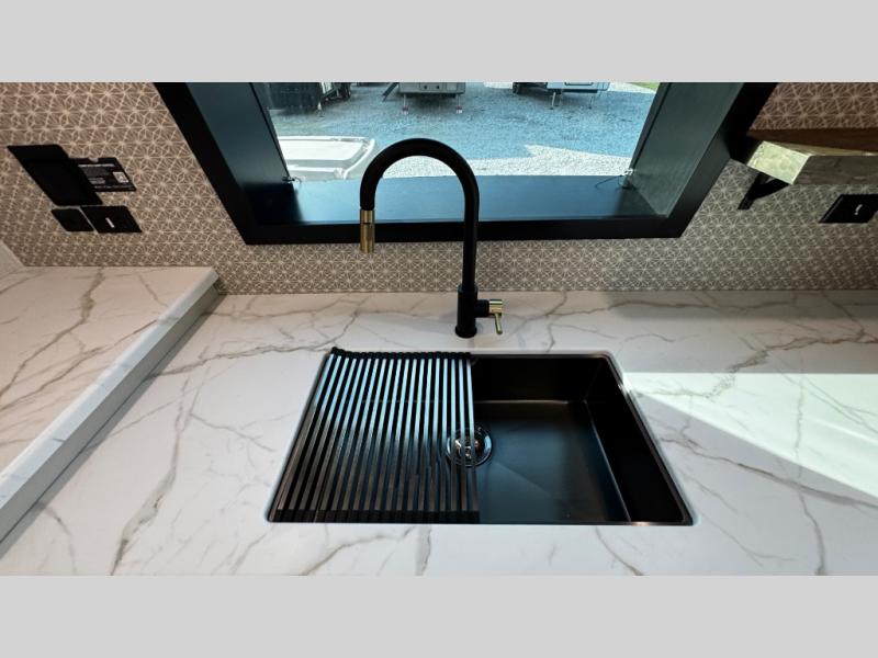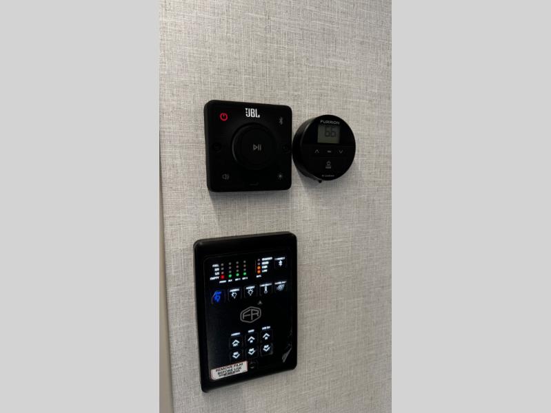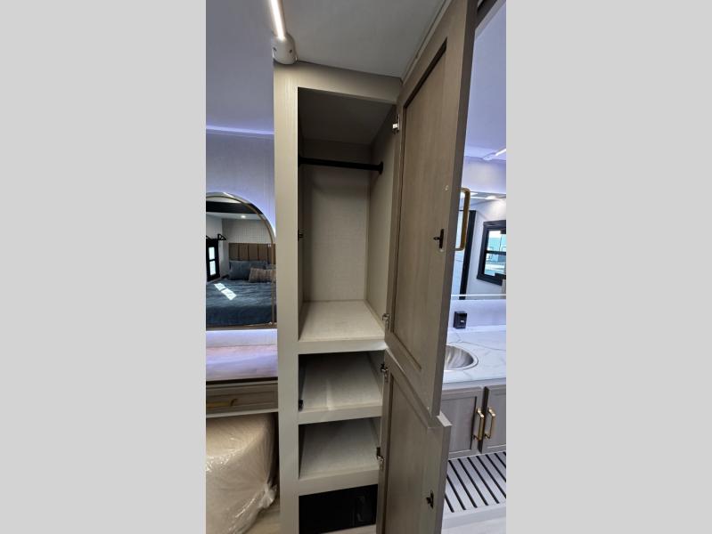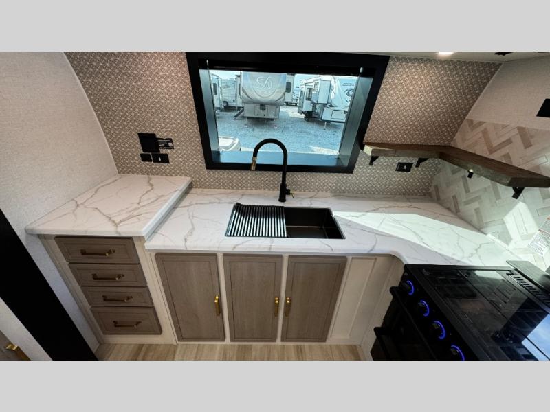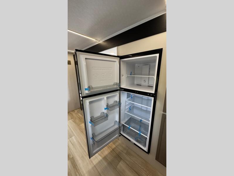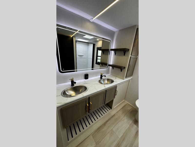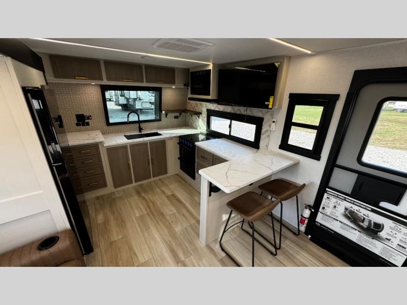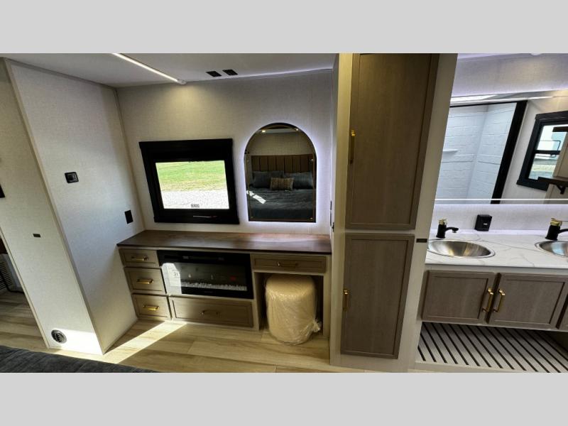 You'll love every minute spent in this double slide out, couple's trailer! You can wake up refreshed each day on your king bed, and enjoy great outdoor views with the bedroom panoramic window. There is also a dresser with a fireplace for a more cozy feel, and the full rear bath includes dual bath sinks plus a walk-in shower to freshen up in. Washer and dryer connections are also located here so you can choose to add those appliances if you wish. The main living area includes a 67" theater seat, no carpet for easy cleaning, and ample counter space in the front kitchen. There is also a bar top with two seats, and plenty of storage space for all your belongings.