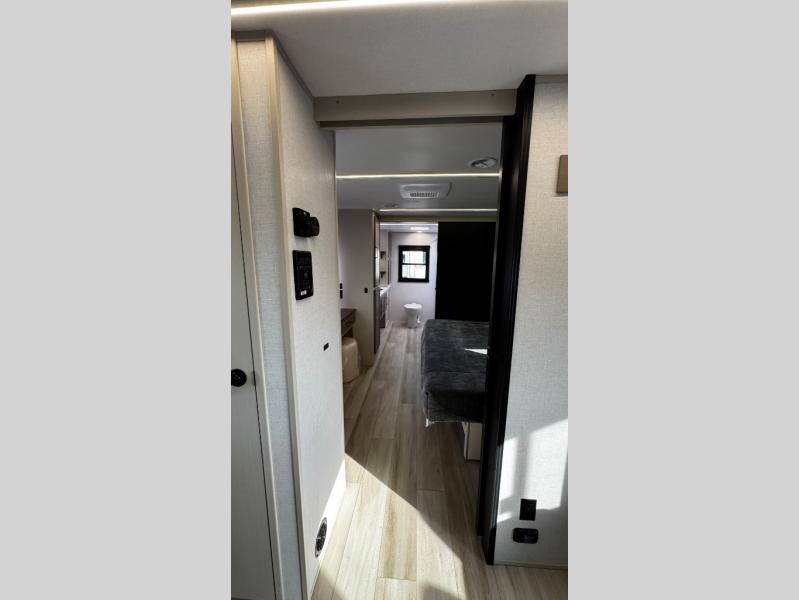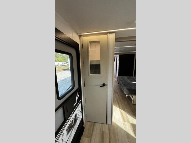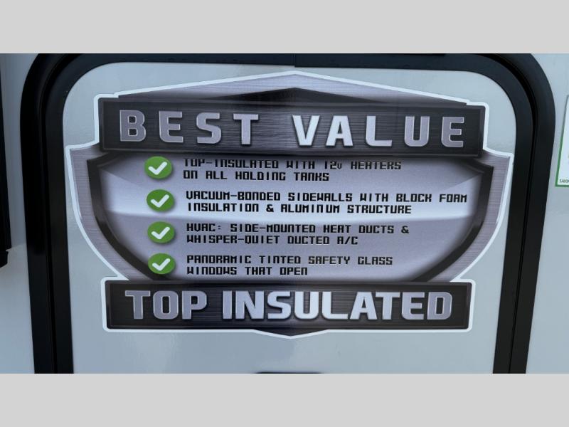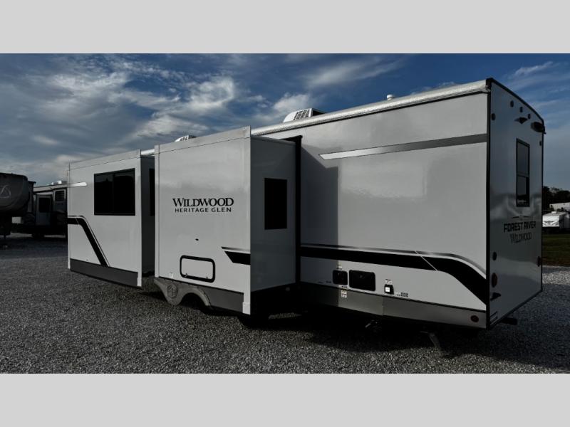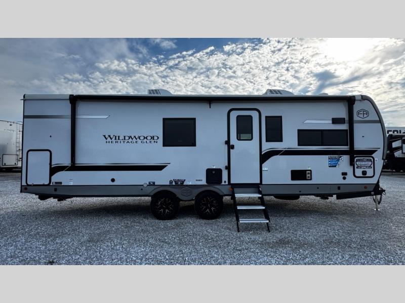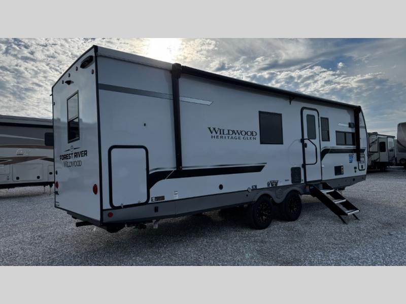 With any Wildwood Heritage Glen travel trailer by Forest River, the quality construction, attention to detail and design along with a bright and welcoming interior allows you to relax in comfort. Each model includes a WeatherShield one piece fiberglass roof, nitrogen-filled radial tires, and an enclosed underbelly with 12V tank heaters on all holding tanks for added protection. You will appreciate the on-demand tankless water heater, along with power stabilizer and tongue jacks, and an extra-large pass-thru storage with slam latch baggage doors. Head inside to enjoy matte gold hardware, wood door casings in place of plastic door casings, and an ultimate interior lighting upgrade with 4k puck/strip lights and a stylish LED back-lit bath mirror!