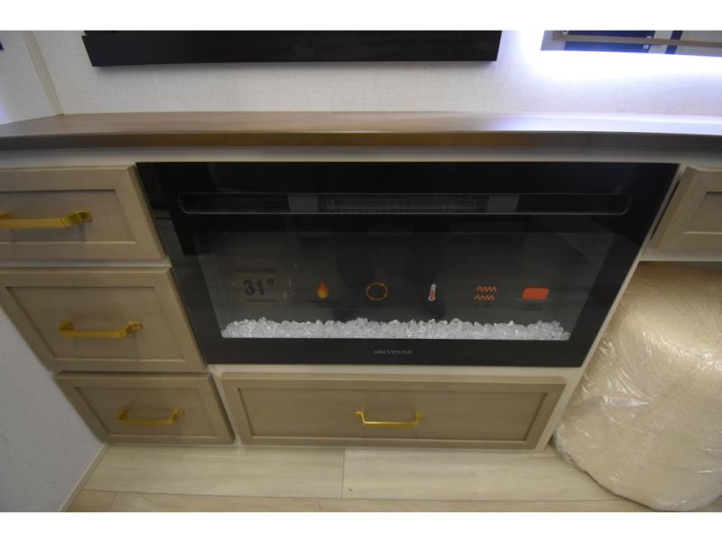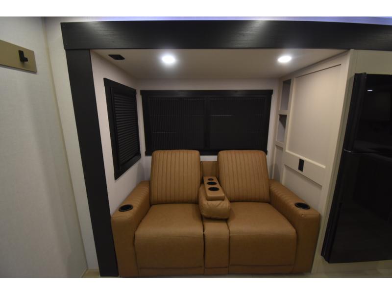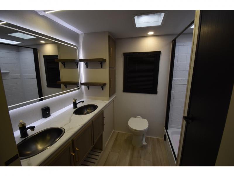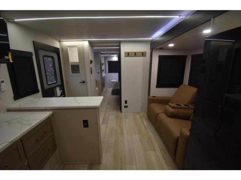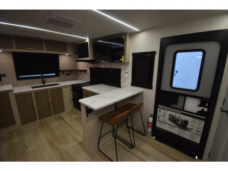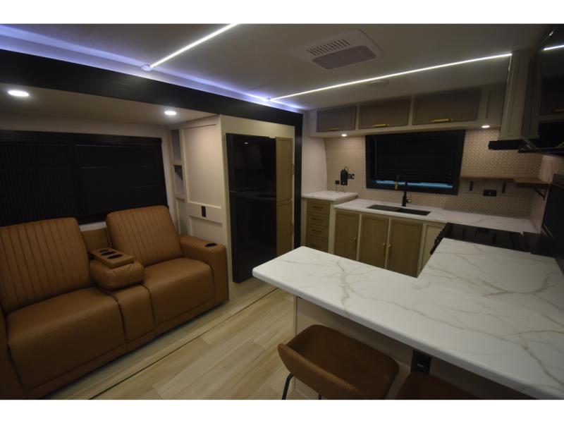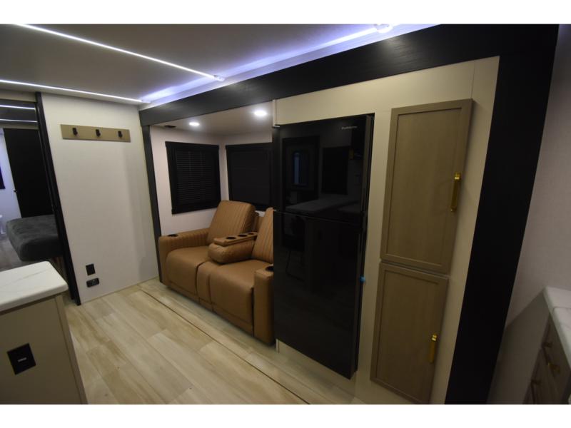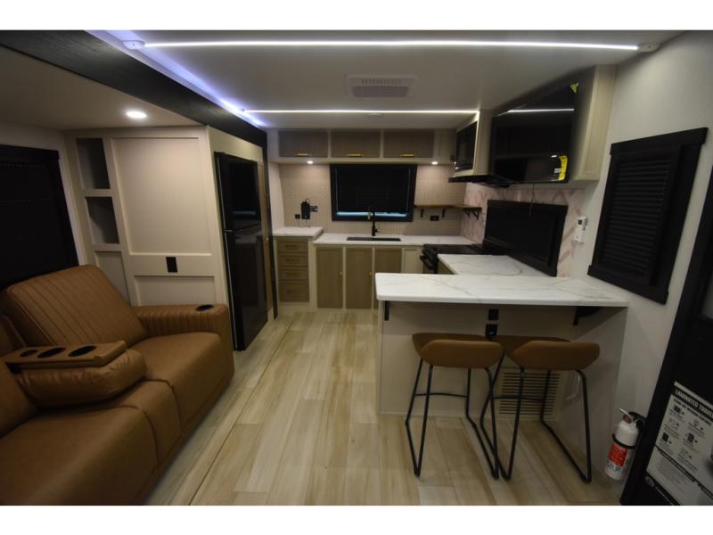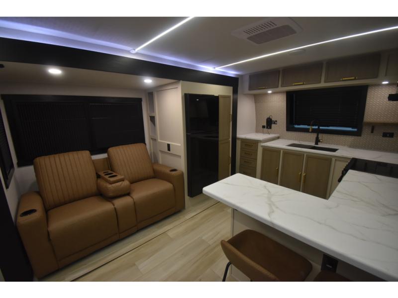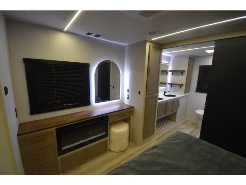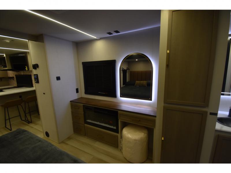 You'll love every minute spent in this double slide out, couple's trailer! You can wake up refreshed each day on your king bed, and enjoy great outdoor views with the bedroom panoramic window. There is also a dresser with a fireplace for a more cozy feel, and the full rear bath includes dual bath sinks plus a walk-in shower to freshen up in. Washer and dryer connections are also located here so you can choose to add those appliances if you wish. The main living area includes a 67" theater seat, no carpet for easy cleaning, and ample counter space in the front kitchen. There is also a bar top with two seats, and plenty of storage space for all your belongings.