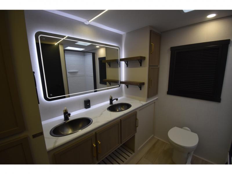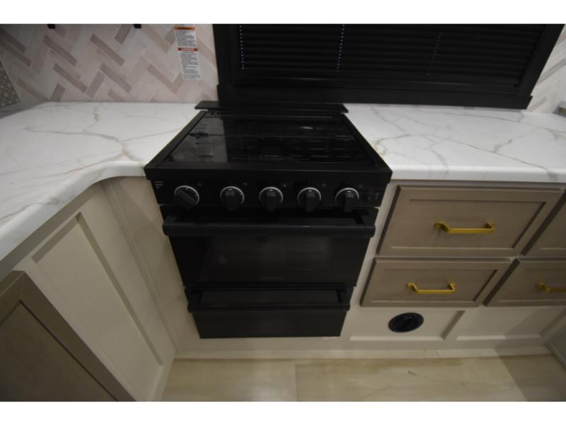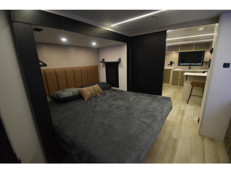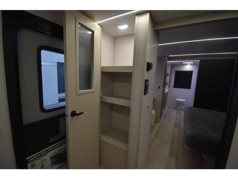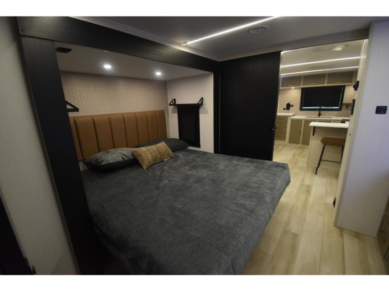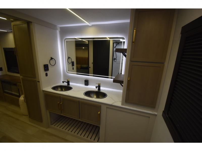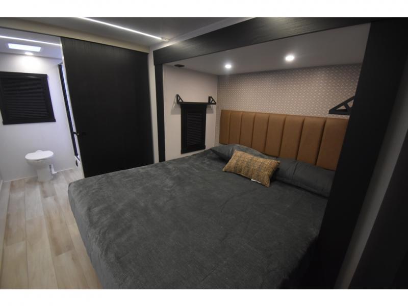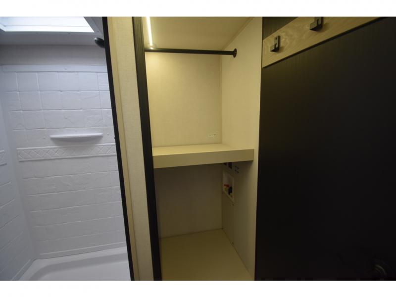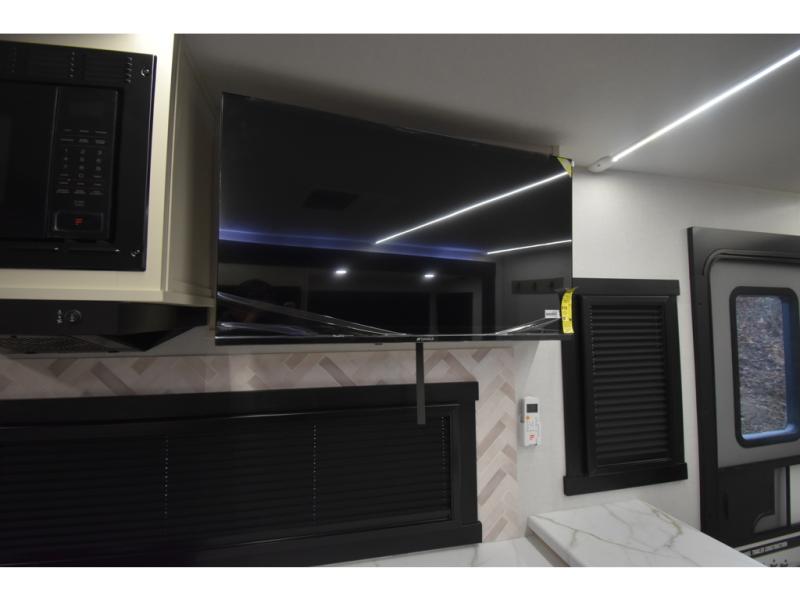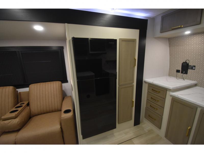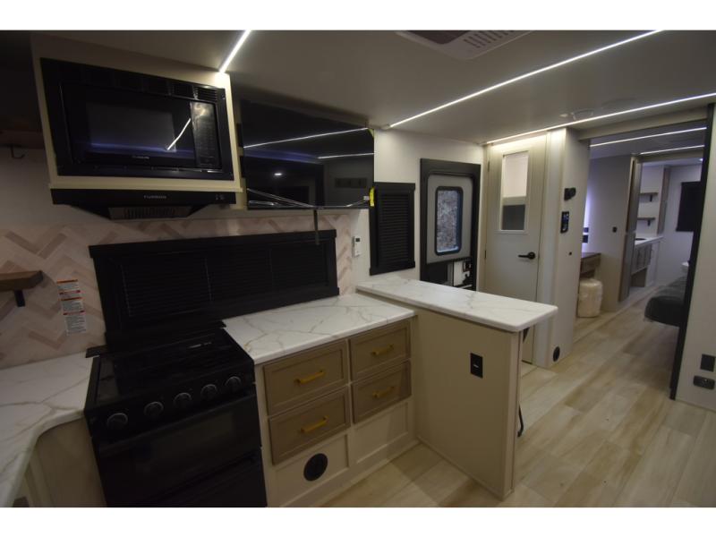 You'll love every minute spent in this double slide out, couple's trailer! You can wake up refreshed each day on your king bed, and enjoy great outdoor views with the bedroom panoramic window. There is also a dresser with a fireplace for a more cozy feel, and the full rear bath includes dual bath sinks plus a walk-in shower to freshen up in. Washer and dryer connections are also located here so you can choose to add those appliances if you wish. The main living area includes a 67" theater seat, no carpet for easy cleaning, and ample counter space in the front kitchen. There is also a bar top with two seats, and plenty of storage space for all your belongings.