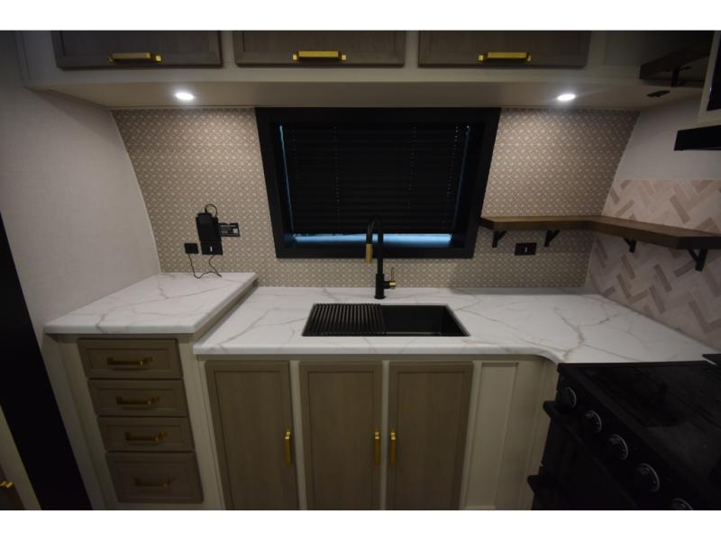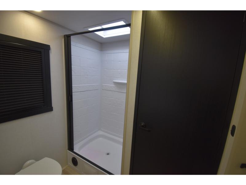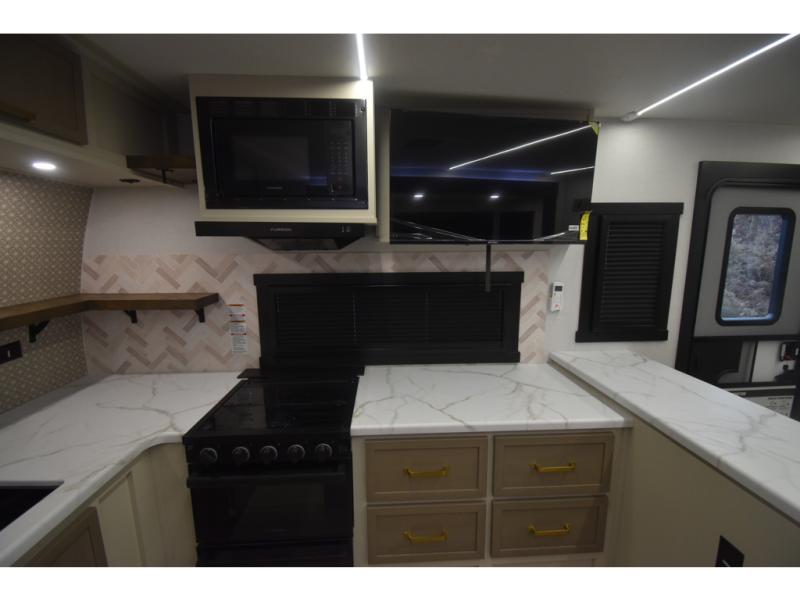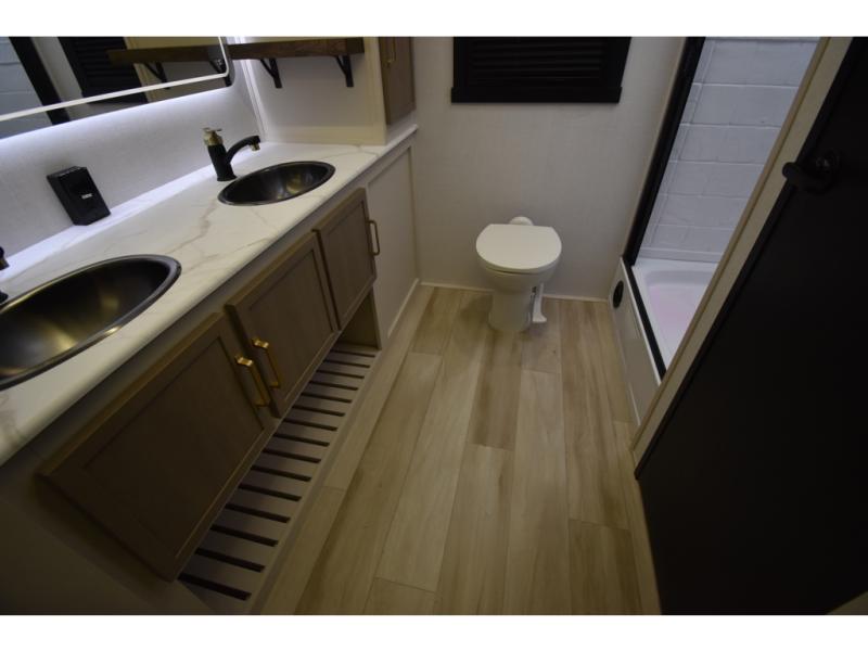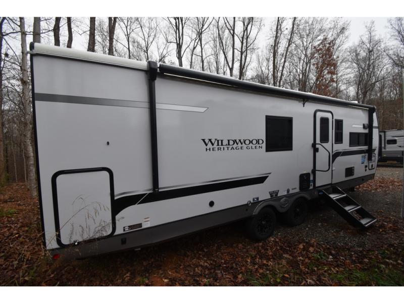 With any Wildwood Heritage Glen travel trailer by Forest River, the quality construction, attention to detail and design along with a bright and welcoming interior allows you to relax in comfort. Each model includes a WeatherShield one piece fiberglass roof, nitrogen-filled radial tires, and an enclosed underbelly with 12V tank heaters on all holding tanks for added protection. You will appreciate the on-demand tankless water heater, along with power stabilizer and tongue jacks, and an extra-large pass-thru storage with slam latch baggage doors. Head inside to enjoy matte gold hardware, wood door casings in place of plastic door casings, and an ultimate interior lighting upgrade with 4k puck/strip lights and a stylish LED back-lit bath mirror!