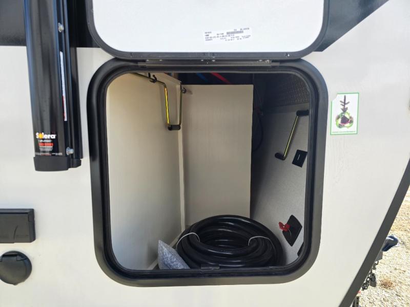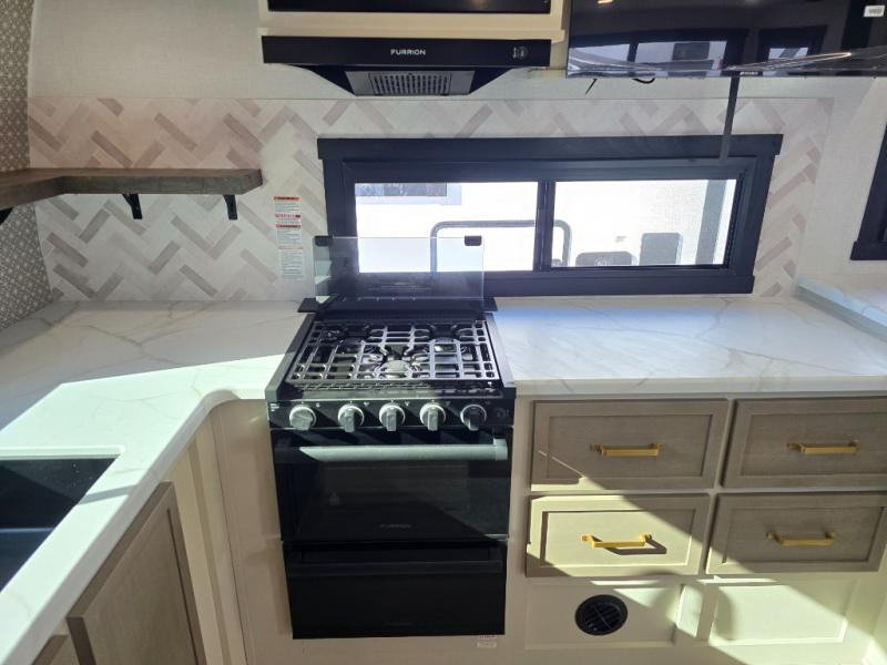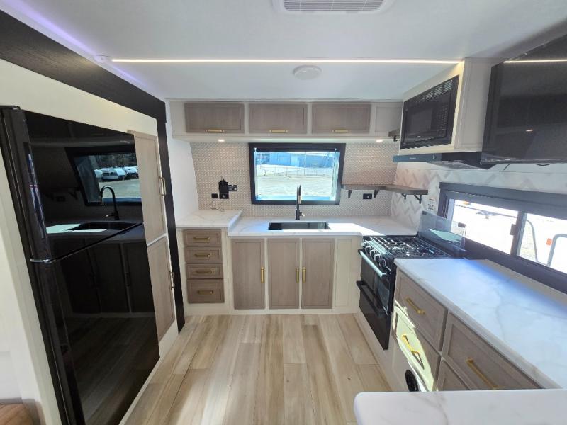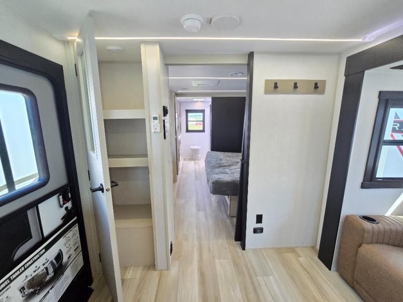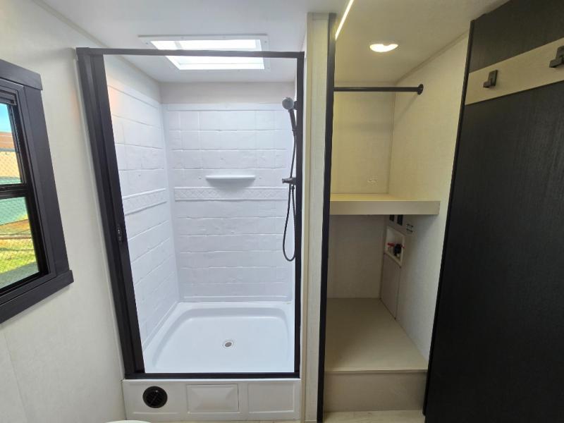 With any Wildwood Heritage Glen travel trailer by Forest River, the quality construction, attention to detail and design along with a bright and welcoming interior allows you to relax in comfort. Each model includes a WeatherShield one piece fiberglass roof, nitrogen-filled radial tires, and an enclosed underbelly with 12V tank heaters on all holding tanks for added protection. You will appreciate the on-demand tankless water heater, along with power stabilizer and tongue jacks, and an extra-large pass-thru storage with slam latch baggage doors. Head inside to enjoy matte gold hardware, wood door casings in place of plastic door casings, and an ultimate interior lighting upgrade with 4k puck/strip lights and a stylish LED back-lit bath mirror!