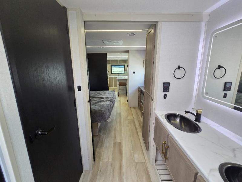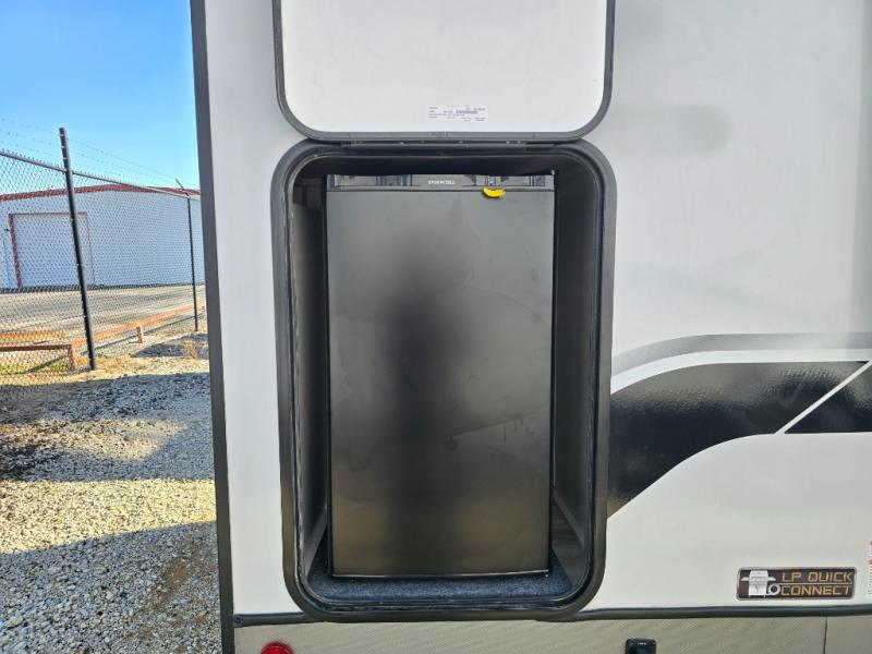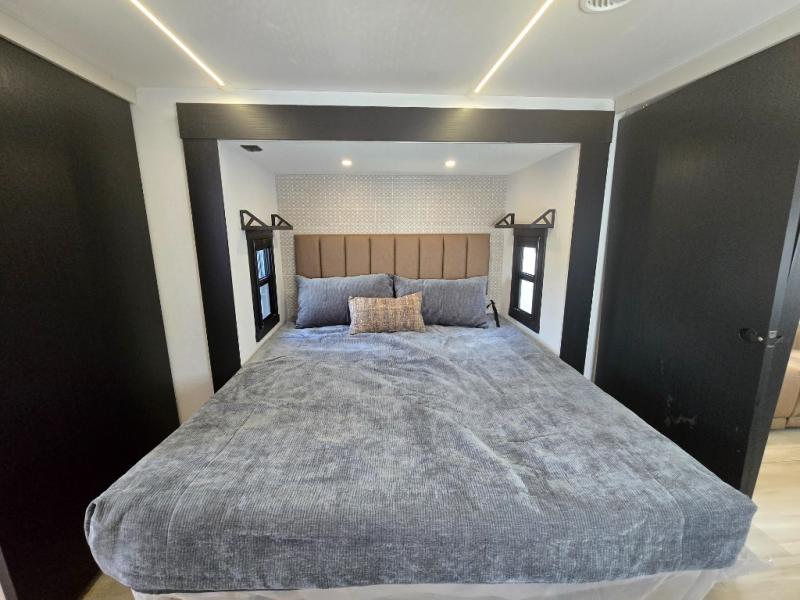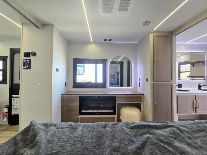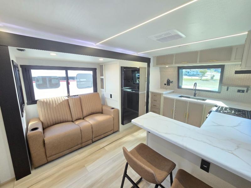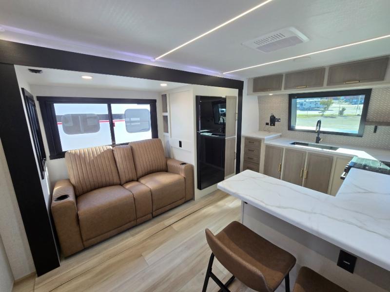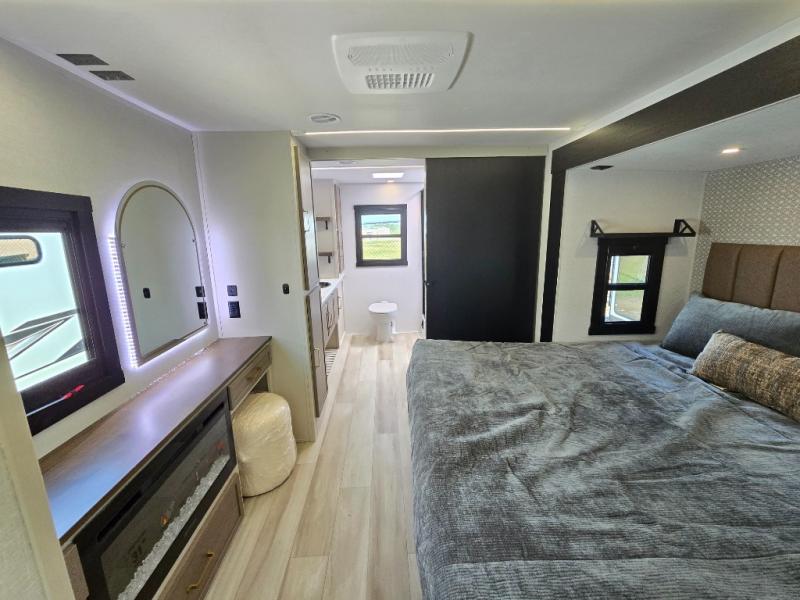 You'll love every minute spent in this double slide out, couple's trailer! You can wake up refreshed each day on your king bed, and enjoy great outdoor views with the bedroom panoramic window. There is also a dresser with a fireplace for a more cozy feel, and the full rear bath includes dual bath sinks plus a walk-in shower to freshen up in. Washer and dryer connections are also located here so you can choose to add those appliances if you wish. The main living area includes a 67" theater seat, no carpet for easy cleaning, and ample counter space in the front kitchen. There is also a bar top with two seats, and plenty of storage space for all your belongings.