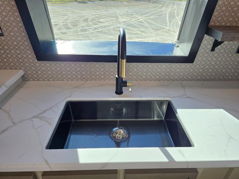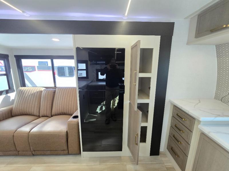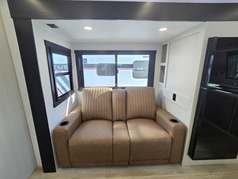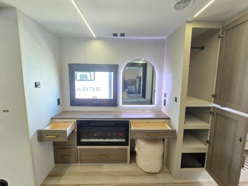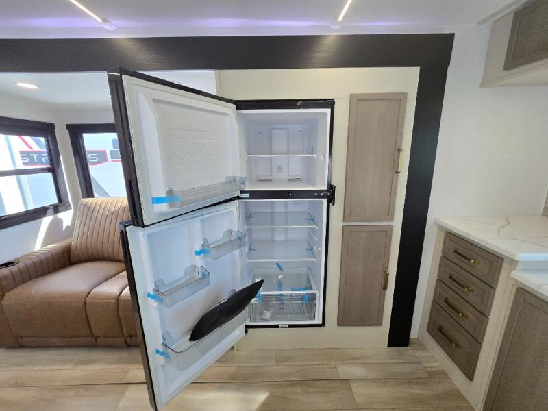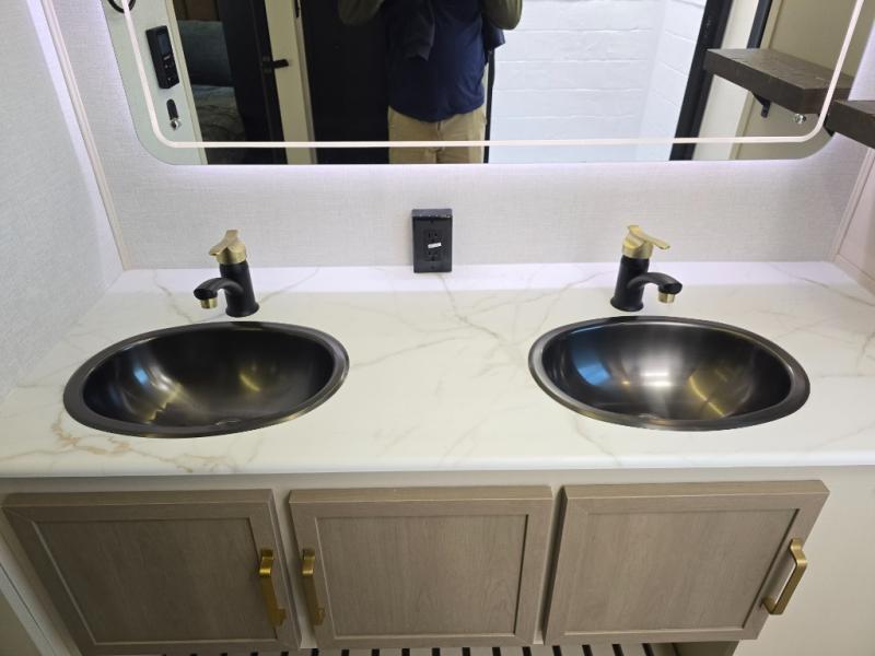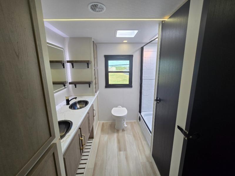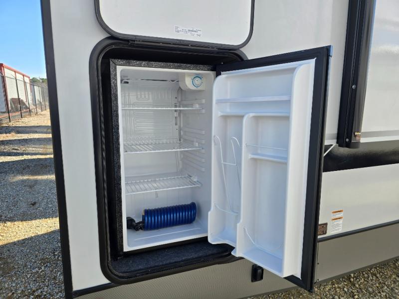 You'll love every minute spent in this double slide out, couple's trailer! You can wake up refreshed each day on your king bed, and enjoy great outdoor views with the bedroom panoramic window. There is also a dresser with a fireplace for a more cozy feel, and the full rear bath includes dual bath sinks plus a walk-in shower to freshen up in. Washer and dryer connections are also located here so you can choose to add those appliances if you wish. The main living area includes a 67" theater seat, no carpet for easy cleaning, and ample counter space in the front kitchen. There is also a bar top with two seats, and plenty of storage space for all your belongings.
