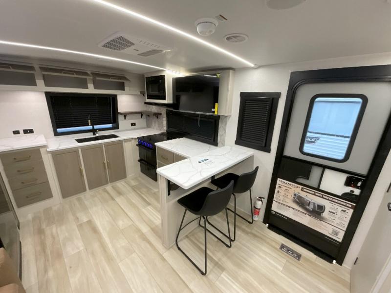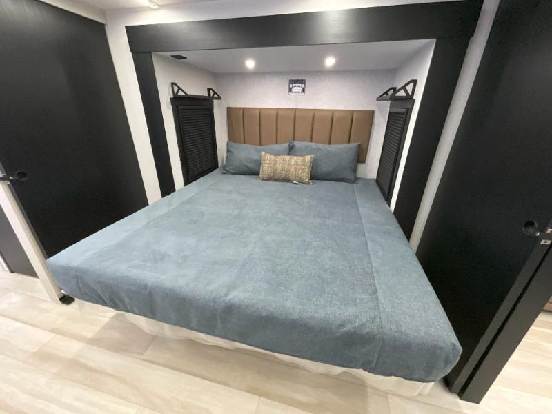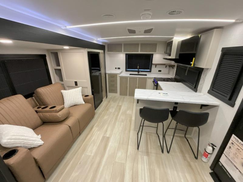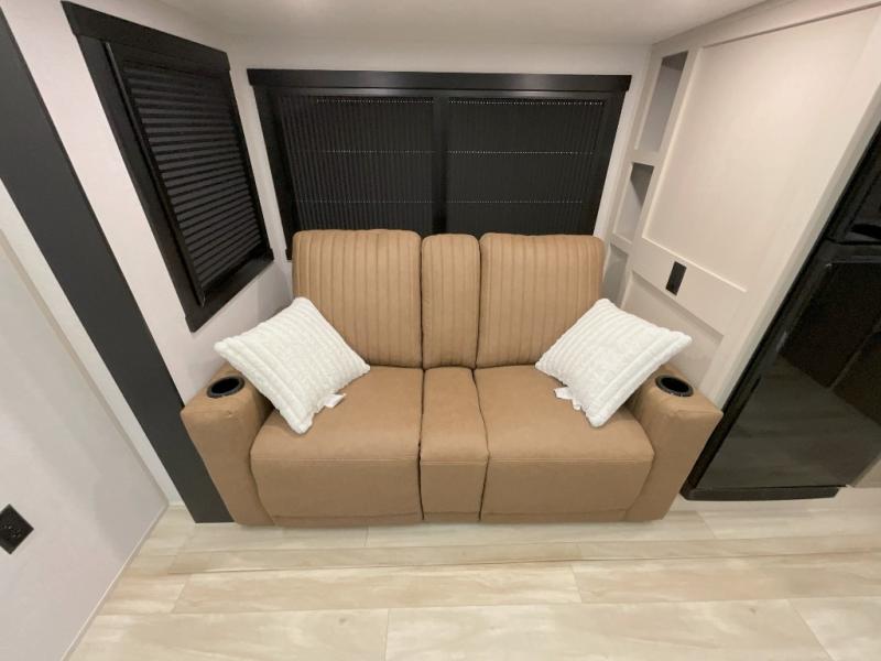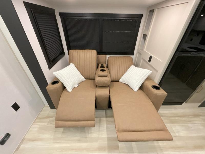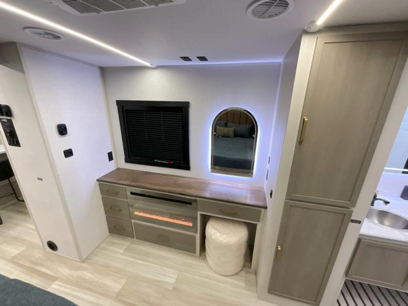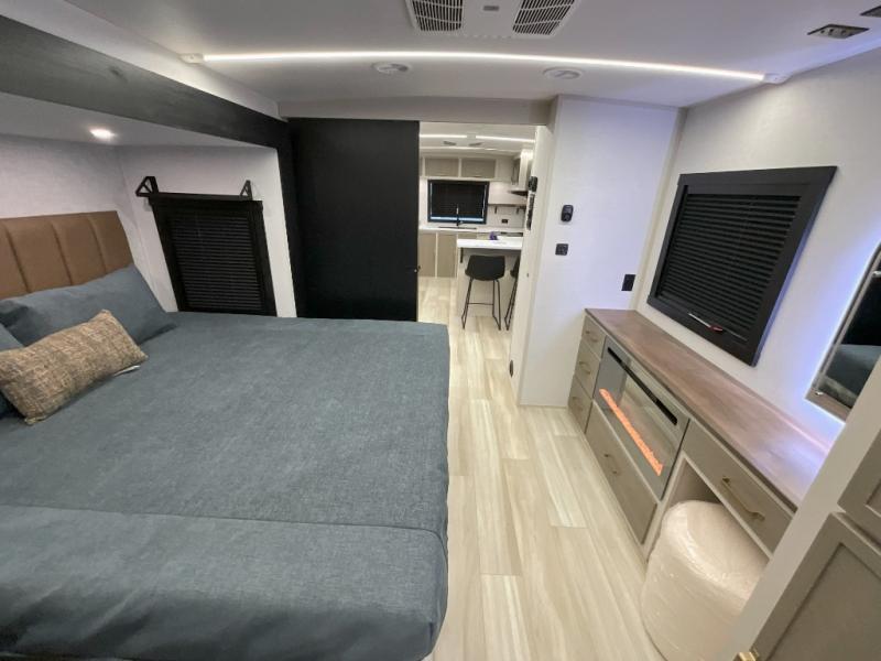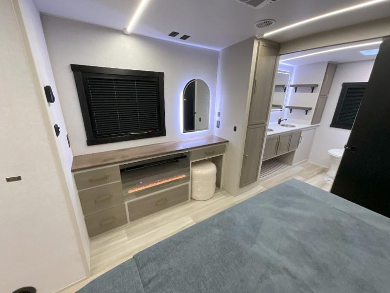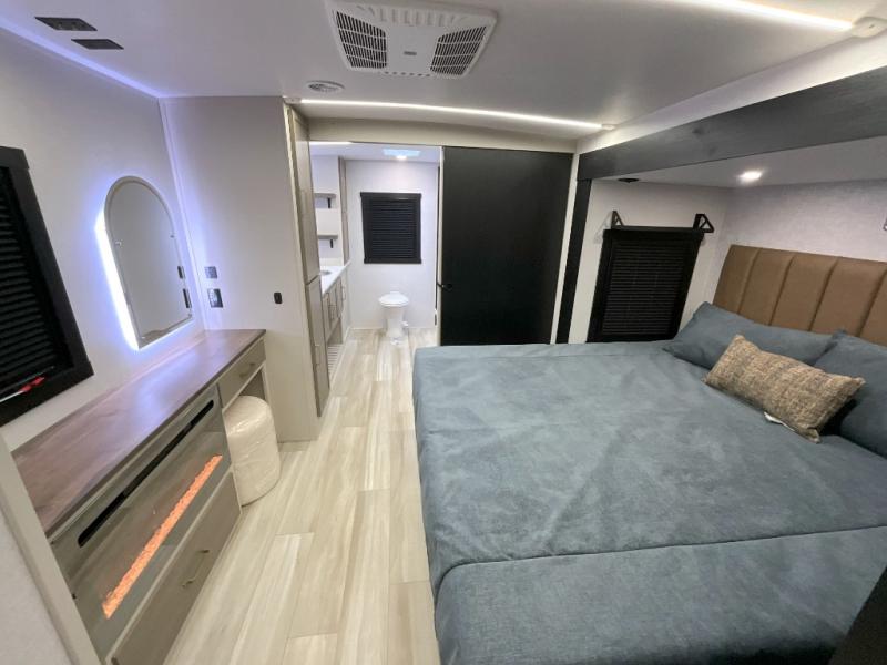 You'll love every minute spent in this double slide out, couple's trailer! You can wake up refreshed each day on your king bed, and enjoy great outdoor views with the bedroom panoramic window. There is also a dresser with a fireplace for a more cozy feel, and the full rear bath includes dual bath sinks plus a walk-in shower to freshen up in. Washer and dryer connections are also located here so you can choose to add those appliances if you wish. The main living area includes a 67" theater seat, no carpet for easy cleaning, and ample counter space in the front kitchen. There is also a bar top with two seats, and plenty of storage space for all your belongings.