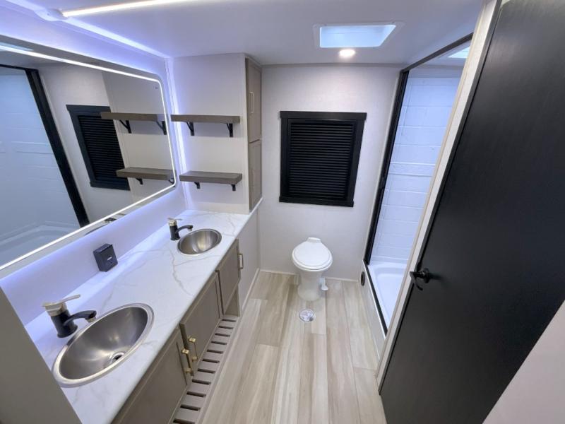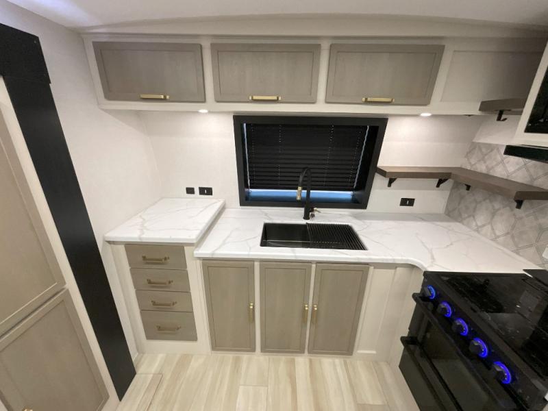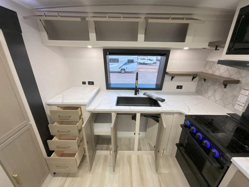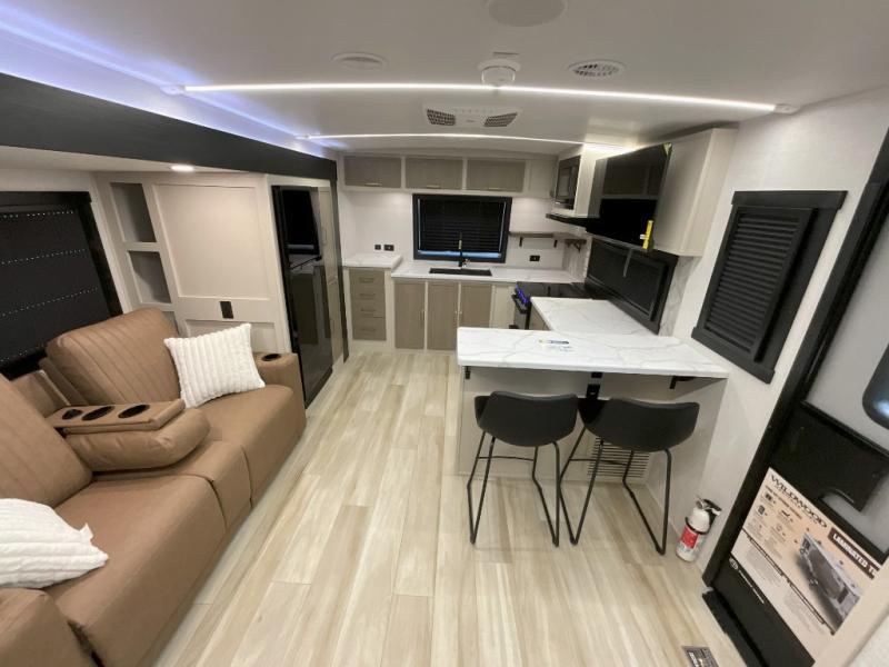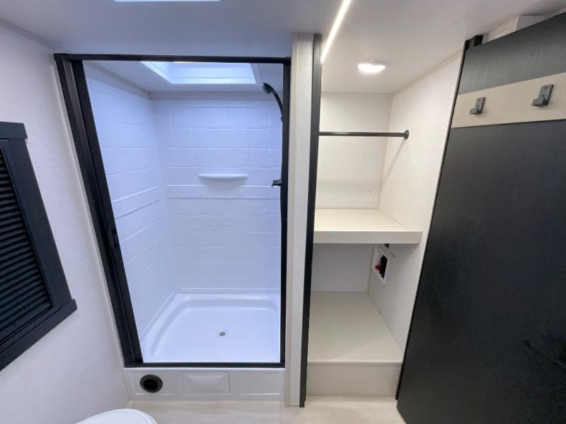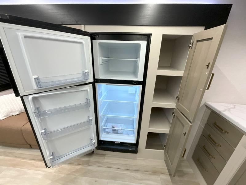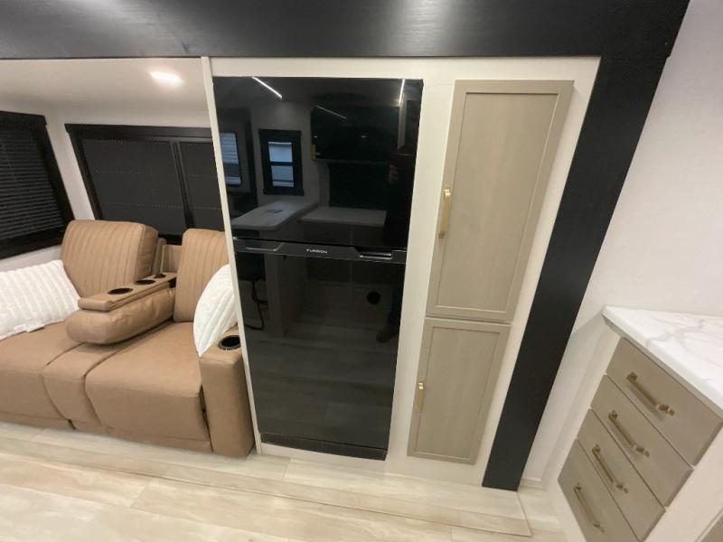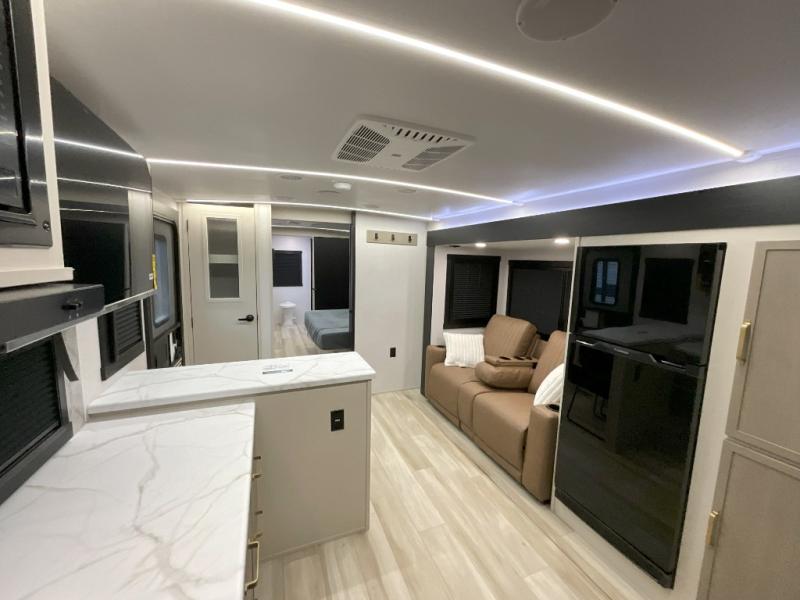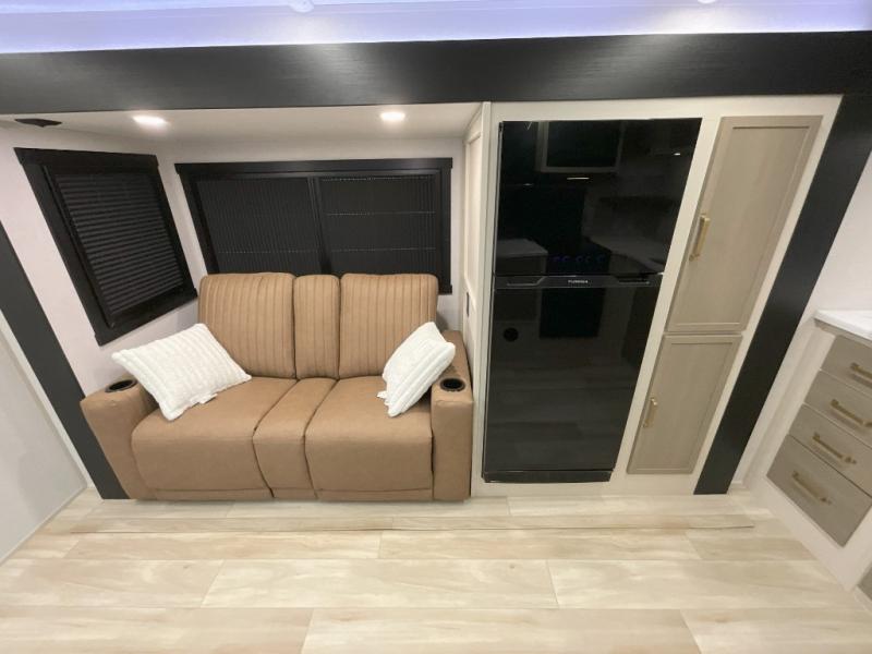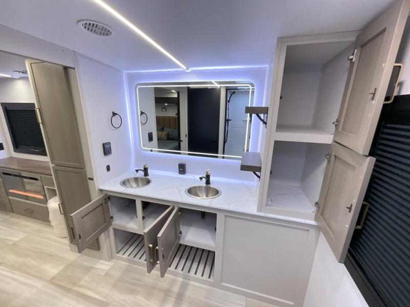 You'll love every minute spent in this double slide out, couple's trailer! You can wake up refreshed each day on your king bed, and enjoy great outdoor views with the bedroom panoramic window. There is also a dresser with a fireplace for a more cozy feel, and the full rear bath includes dual bath sinks plus a walk-in shower to freshen up in. Washer and dryer connections are also located here so you can choose to add those appliances if you wish. The main living area includes a 67" theater seat, no carpet for easy cleaning, and ample counter space in the front kitchen. There is also a bar top with two seats, and plenty of storage space for all your belongings.