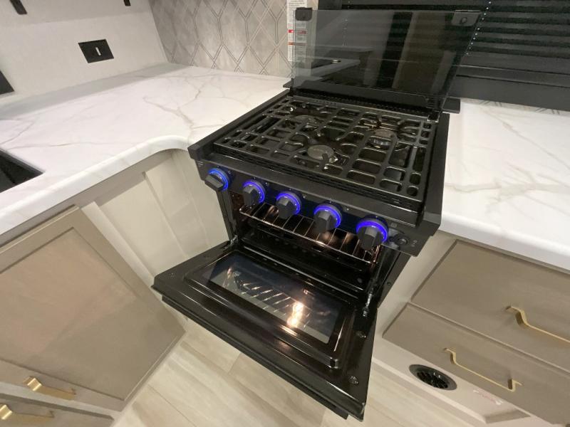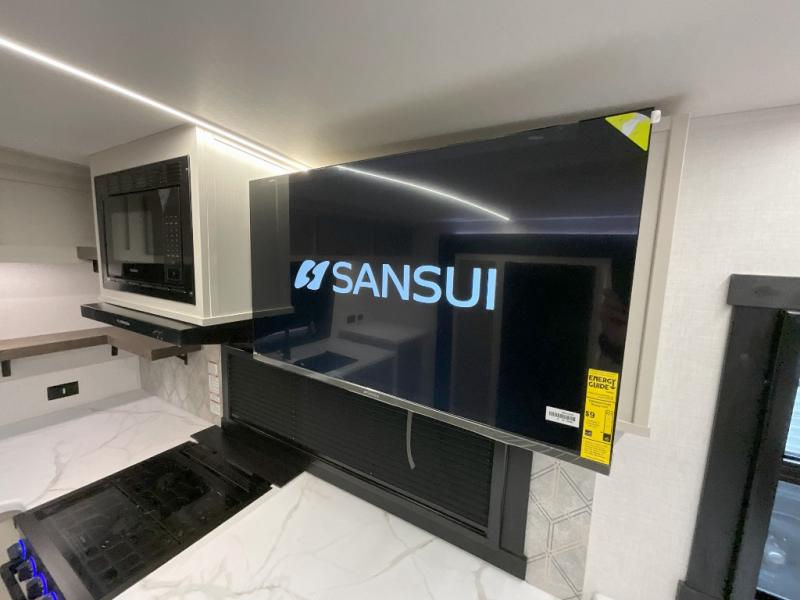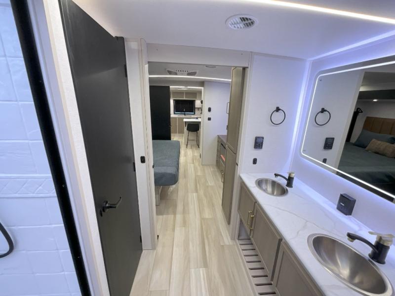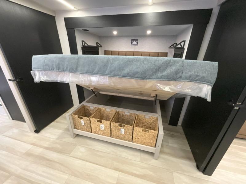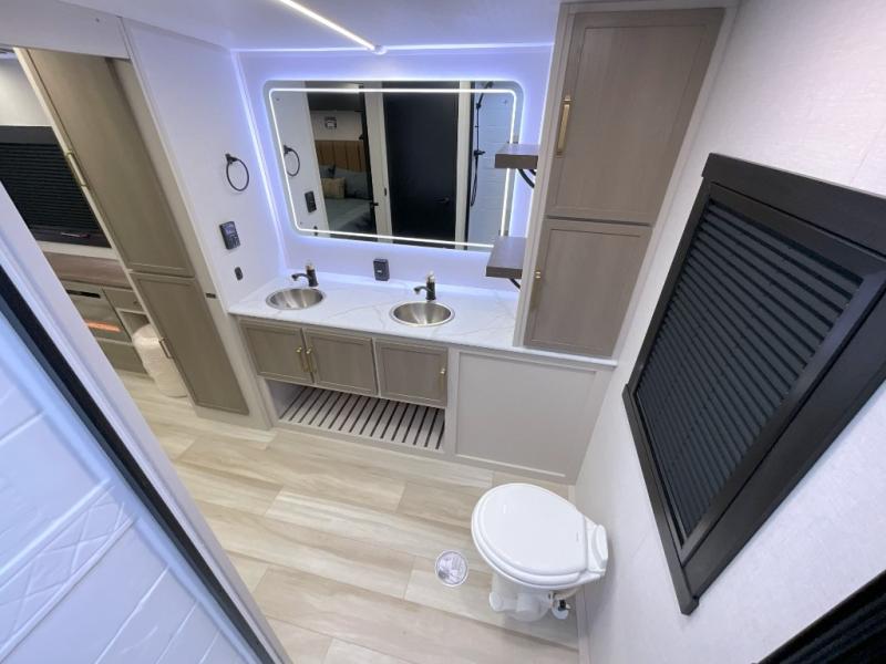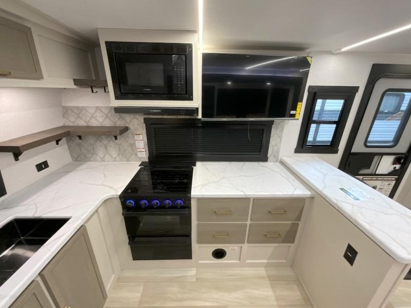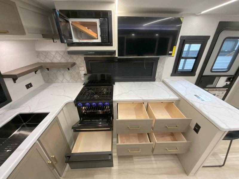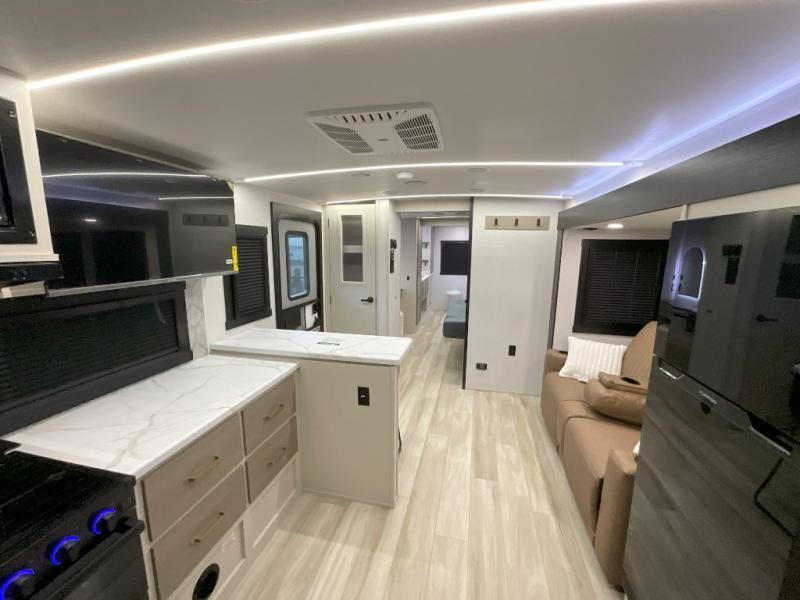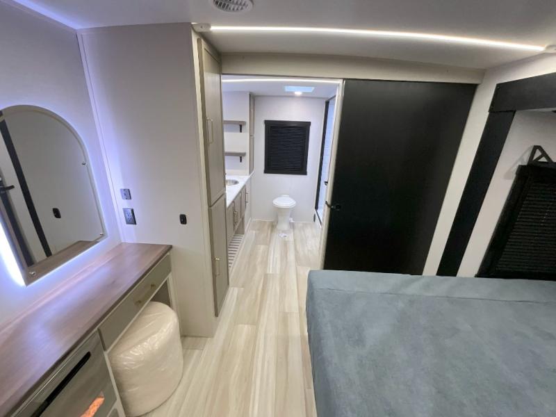 You'll love every minute spent in this double slide out, couple's trailer! You can wake up refreshed each day on your king bed, and enjoy great outdoor views with the bedroom panoramic window. There is also a dresser with a fireplace for a more cozy feel, and the full rear bath includes dual bath sinks plus a walk-in shower to freshen up in. Washer and dryer connections are also located here so you can choose to add those appliances if you wish. The main living area includes a 67" theater seat, no carpet for easy cleaning, and ample counter space in the front kitchen. There is also a bar top with two seats, and plenty of storage space for all your belongings.