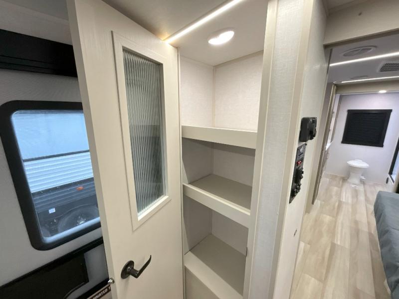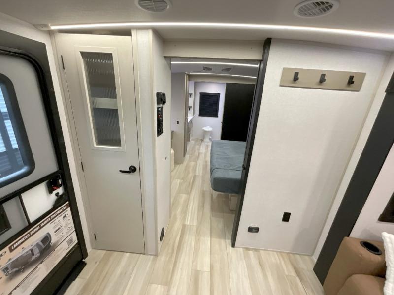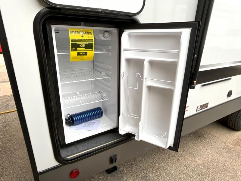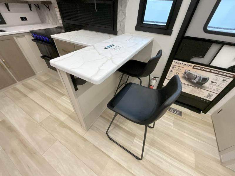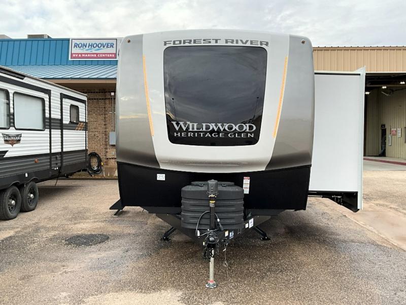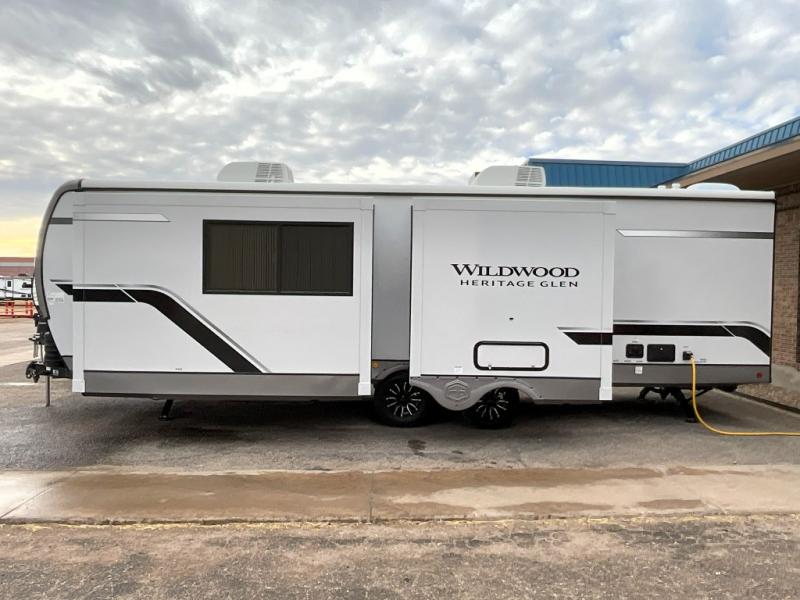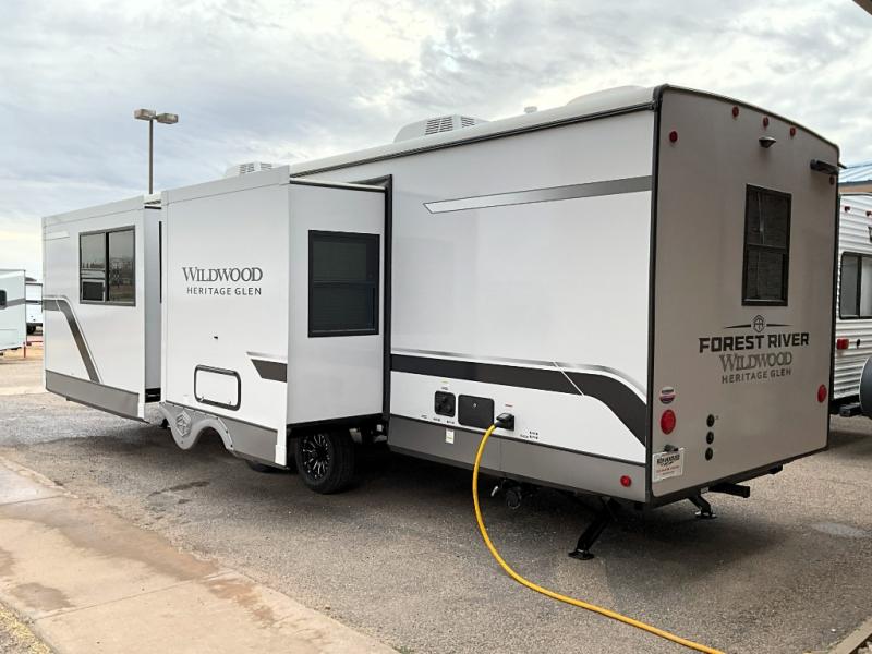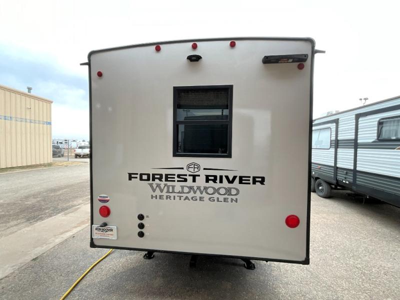 With any Wildwood Heritage Glen travel trailer by Forest River, the quality construction, attention to detail and design along with a bright and welcoming interior allows you to relax in comfort. Each model includes a WeatherShield one piece fiberglass roof, nitrogen-filled radial tires, and an enclosed underbelly with 12V tank heaters on all holding tanks for added protection. You will appreciate the on-demand tankless water heater, along with power stabilizer and tongue jacks, and an extra-large pass-thru storage with slam latch baggage doors. Head inside to enjoy matte gold hardware, wood door casings in place of plastic door casings, and an ultimate interior lighting upgrade with 4k puck/strip lights and a stylish LED back-lit bath mirror!